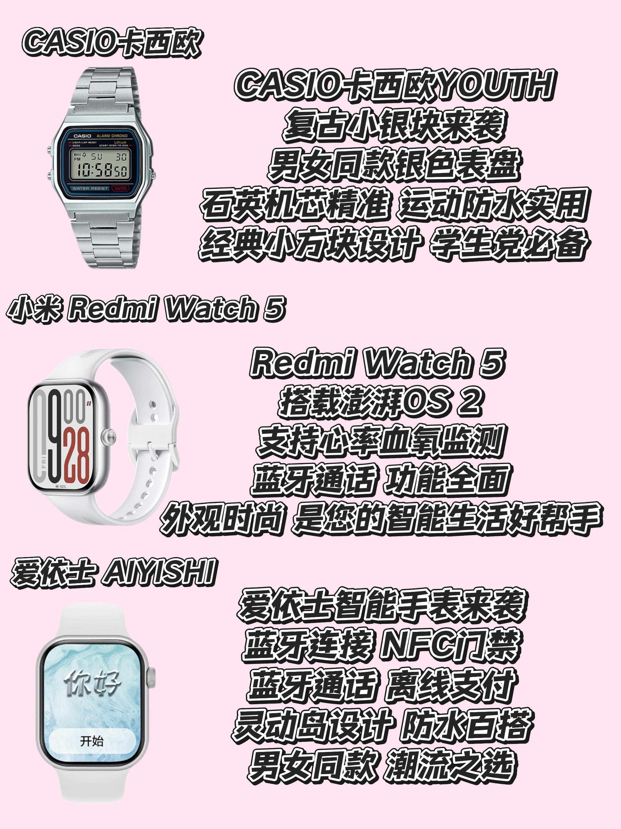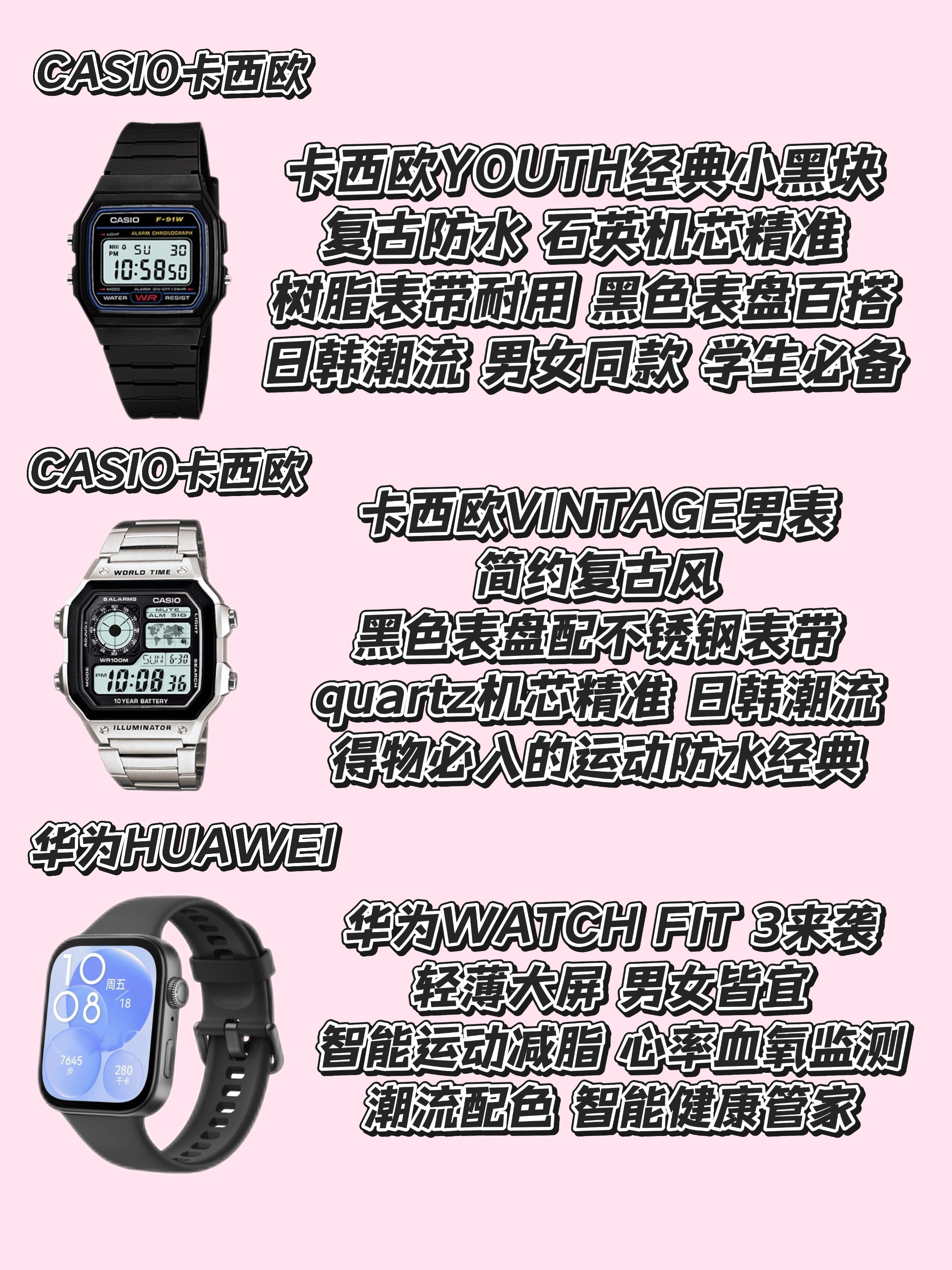 传统手表: CASIO卡西欧 多款经典系列,以其石英机芯的精准和树脂表带的耐用著称。 YOUTH系列的小银块、小黑块,以及VINTAGE系列,都具备50米防水功能,适合日常佩戴及轻微涉水。 DIGITAL系列则更偏向时尚潮流设计,白色表盘款专为女士打造。 这些款式都具有浓郁的日韩风格,适合追求经典与时尚的年轻人。 智能手表: Apple Watch 系列以其流畅的系统和丰富的生态引领智能手表潮流。...
