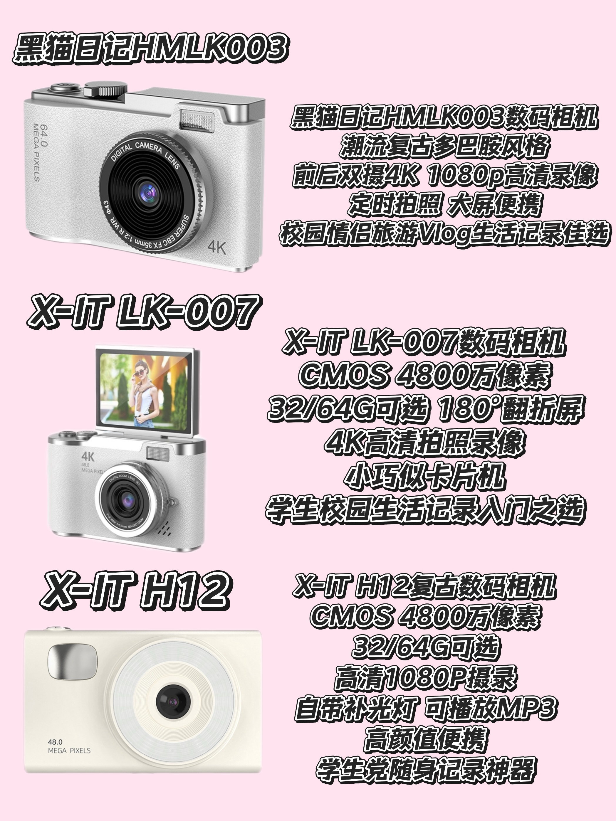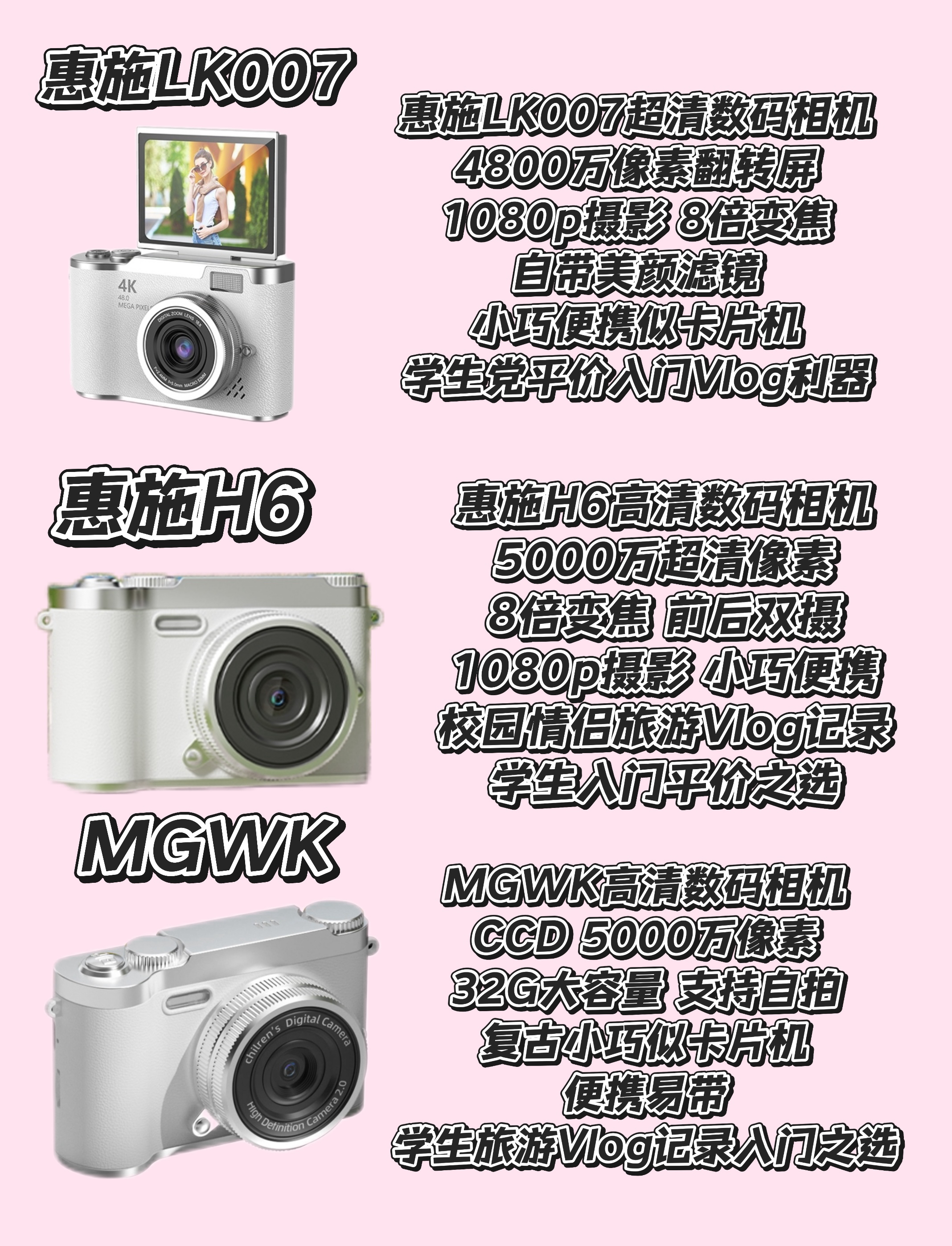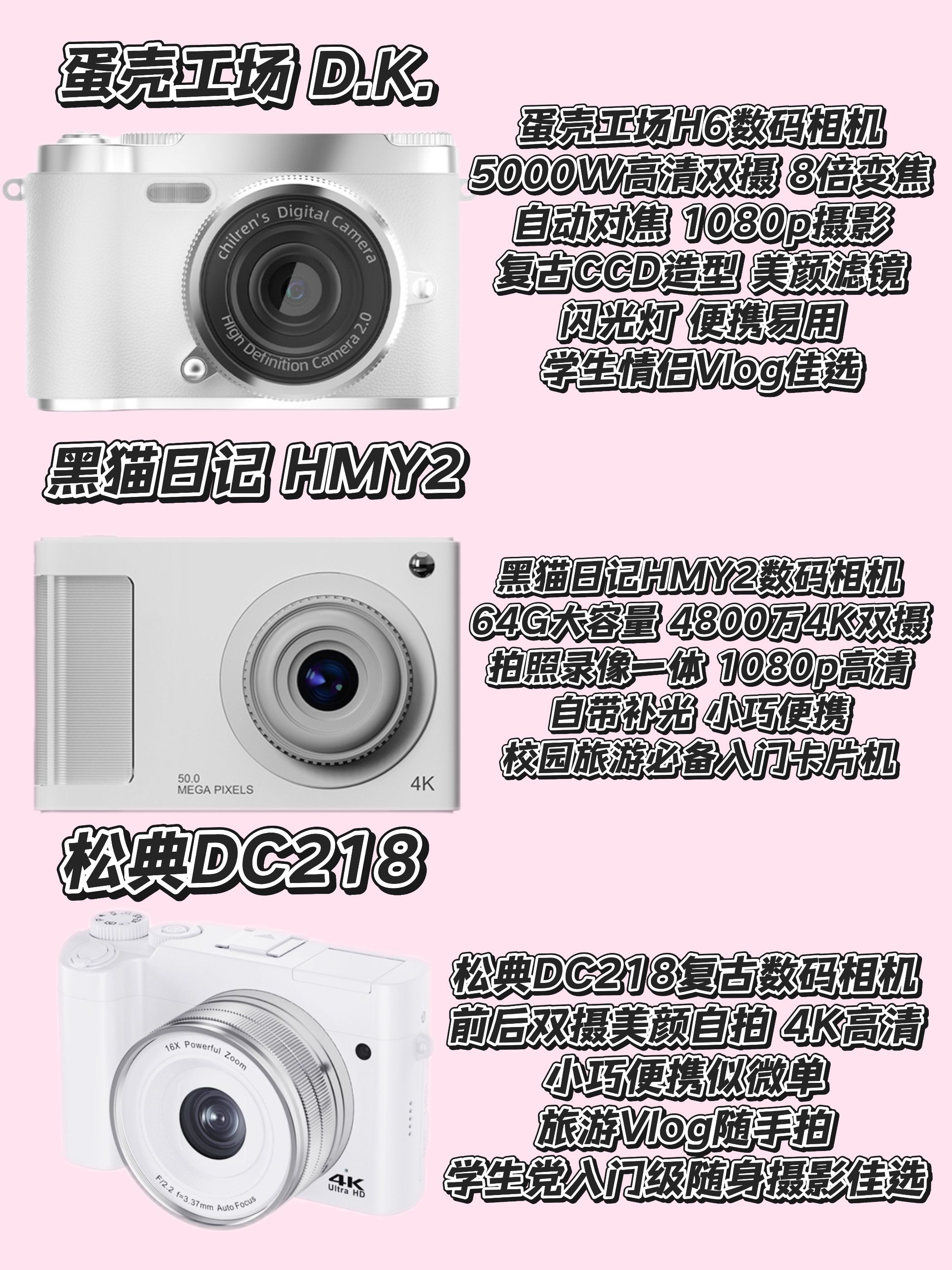 本篇笔记关联了SONGDIAN/松典 DC403 数码相机 入门级 高像素 卡片随身带 平价 星河黑、IKYOU ik+ccd1 数码相机 前后双摄 长久续航 白色、iMobile H66 数码相机 轻薄 前后双摄 摄录一体 玉盘白 等商品,为用户提供真实的使用体验和购买参考。