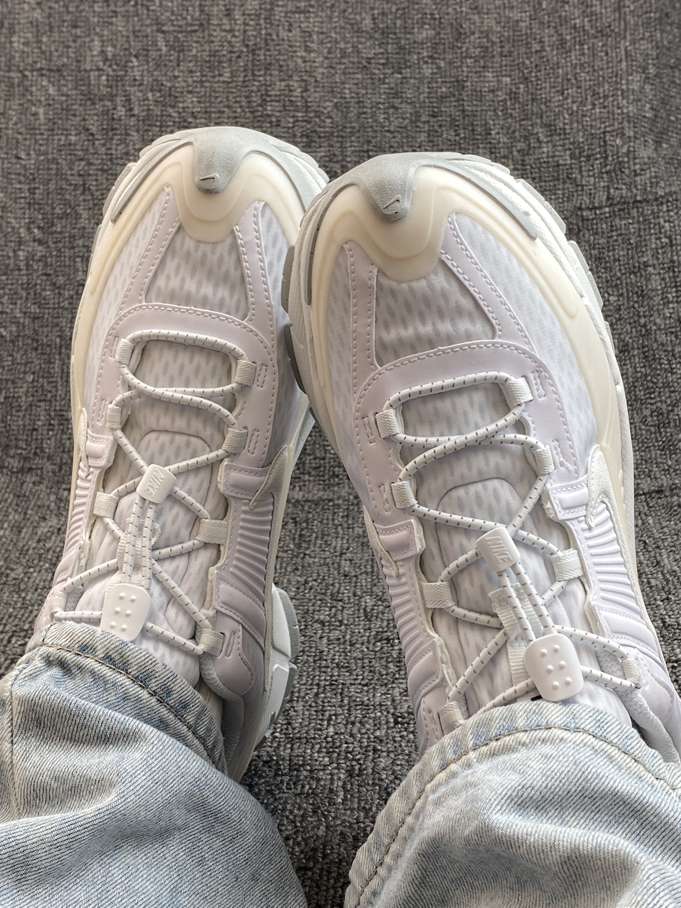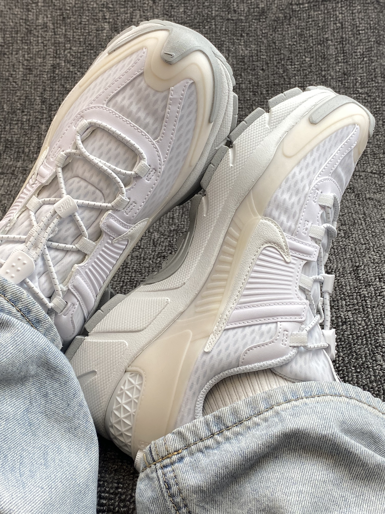 👟Nike Vomero Roam ✨复古的Vomero也能帅气又百搭!鞋子以白色为主,不同材质显现出来的颜色也不同,整体蛮有层次感的。 🌸鞋面是皮革➕织物材质拼接,有一定程度的防水,户外复杂场景也能驾驭耶。脚感轻盈不笨重,当然中底还有4cm左右的增高🤫小个子友好。 ✨鞋带设计是弹力拉缩的,穿起来挺方便~