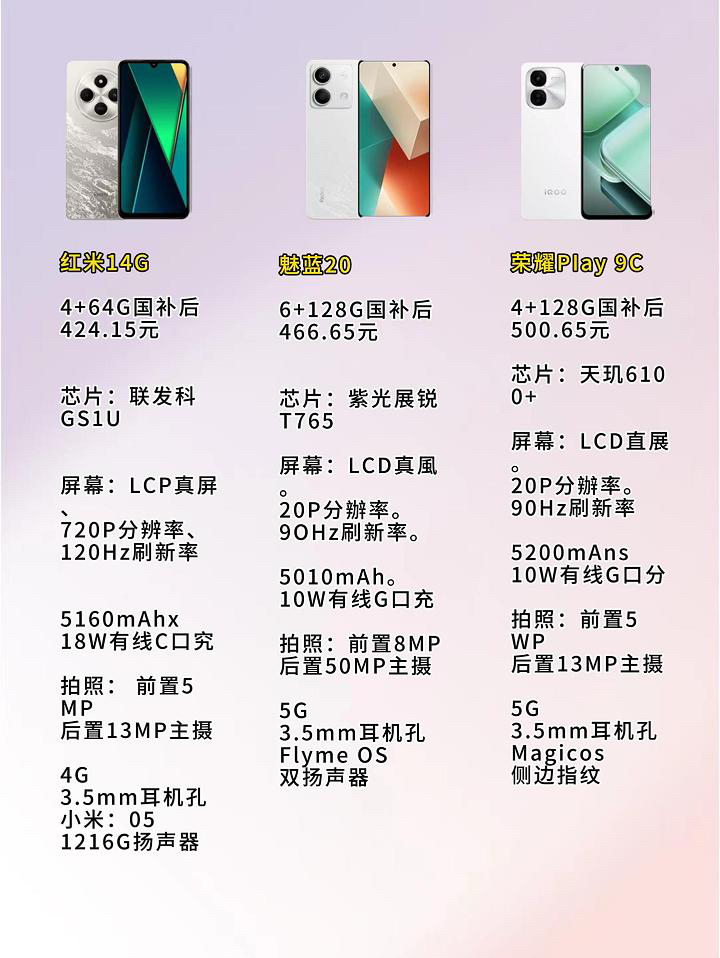 在2025年的手机市场里,百元机依旧是追求实惠与实用人群的香饽饽。无论是当作备用机,还是给家里老人长辈用,选对一款合适的百元机都能带来不少便利。下面就给大家推荐几款性价比超高的新机(非二手机),最低只要400出头就能拿下! 红米14C 价格只需400出头,堪称预算“特困户”的救星。虽然价格亲民,但它具备120Hz刷新率,日常打电话、刷短视频能更流畅,满足最基础使用需求还是妥妥的。 • 荣耀P...