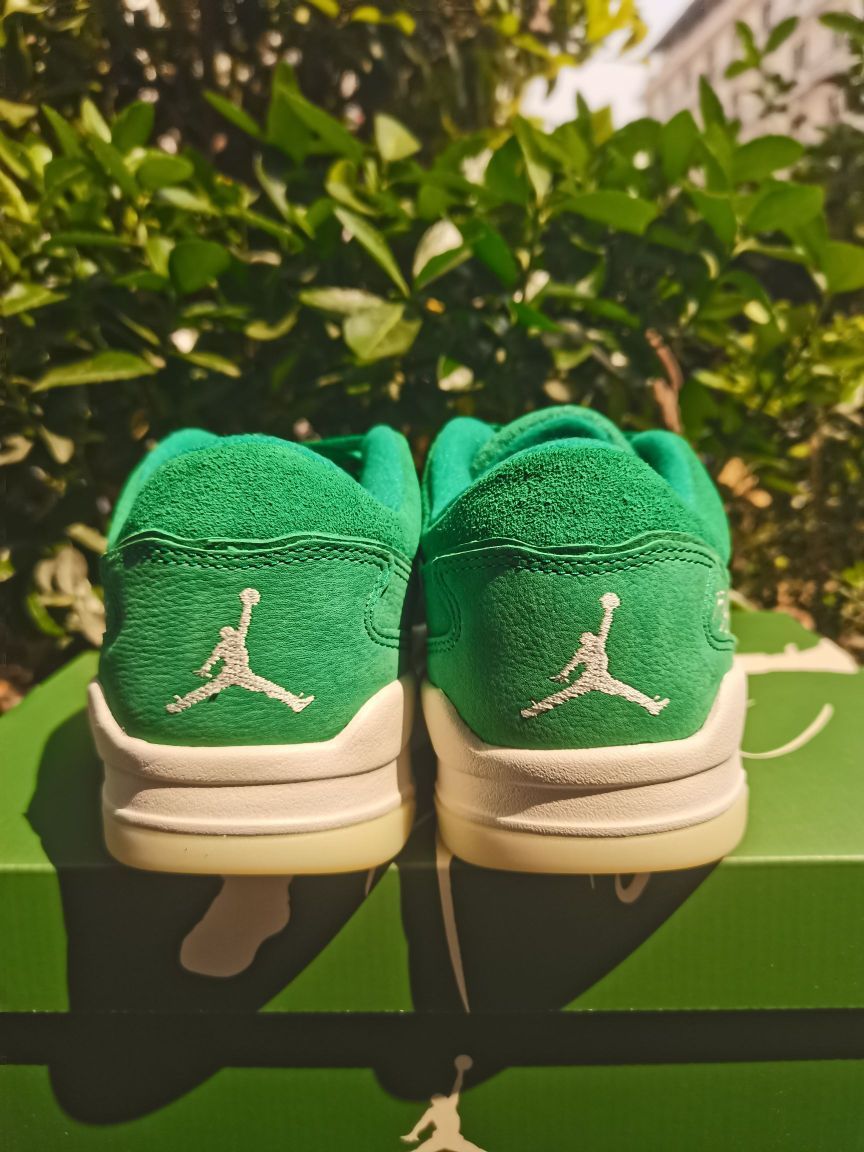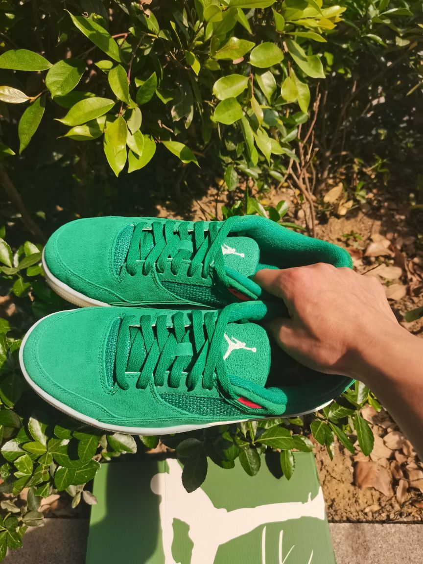 这双绿白配色的Air Jordan ,清新亮眼。 绿色鞋面活力满满,搭配白色中底,简约又不失格调。 细节处的红色点缀,更是画龙点睛。 无论是出街还是运动,它都能轻松适配,展现独特潮流态度,每一步都踏出时尚风采。