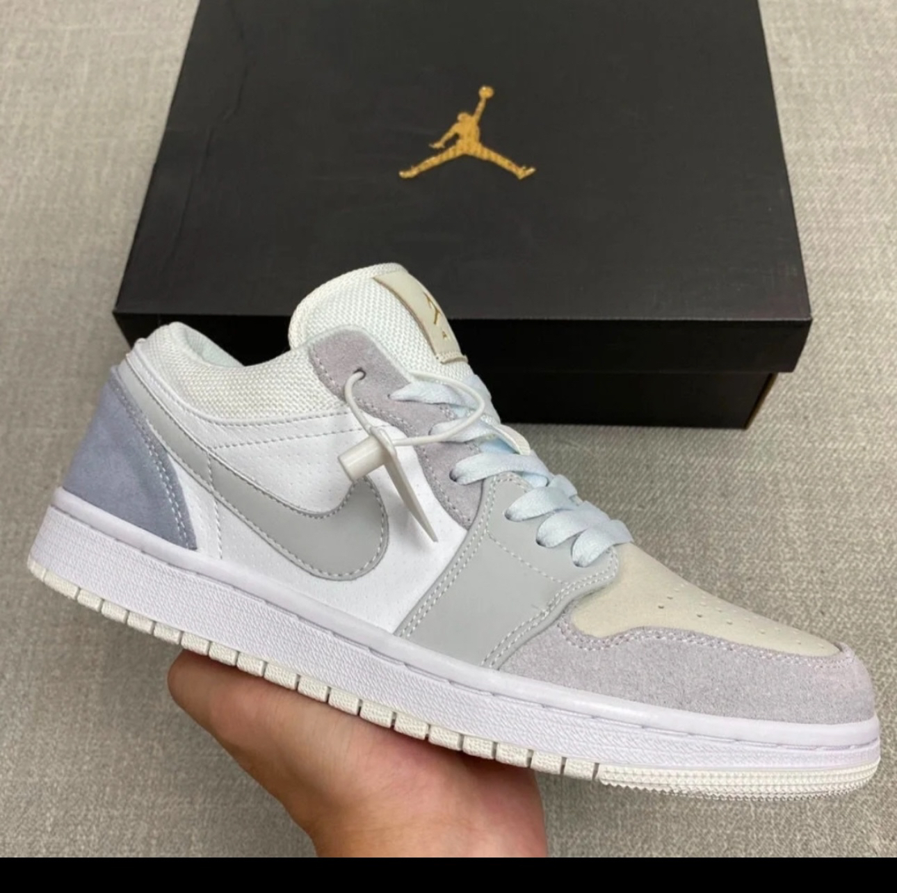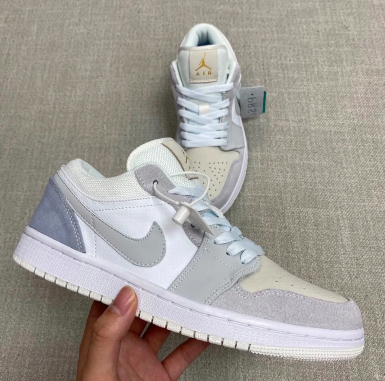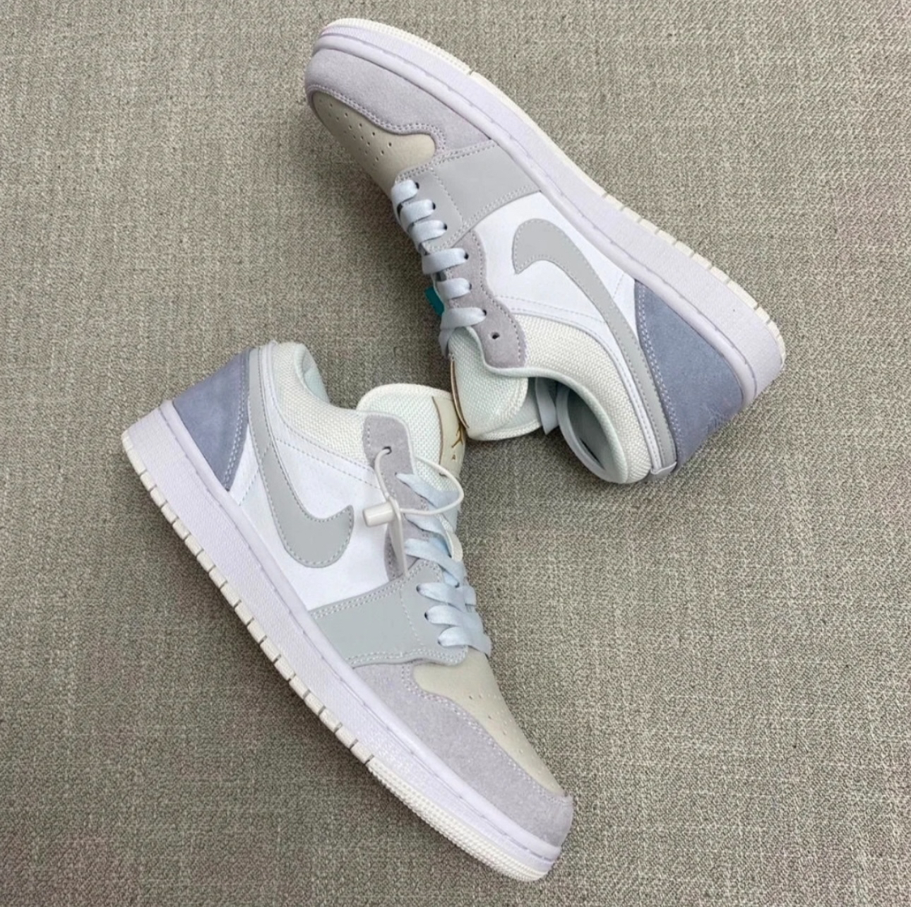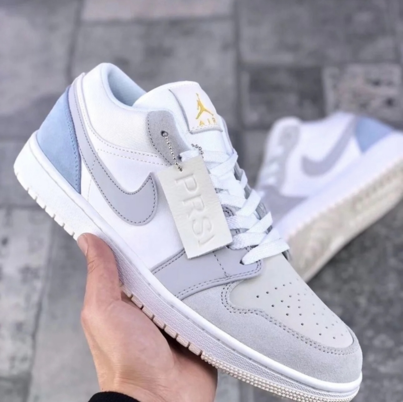 这款小巴黎 配色Air Jordan 1 Low “Paris”,以迷雾蓝及浅灰色为主基调,绒面革与翻毛皮搭配 鞋舌带有烫金 Jumpman Logo,后跟则是压纹样式的飞翼标志!整体质感真的太太太太太高级了!!! 实物巨好看!!清新治愈配色美哭了!!配色低调真的帅!! 所以它真的近乎百搭!春夏秋冬四季穿搭完全hold住! 搭配深色浅色系牛仔裤、阔腿裤短裤、裙子丝毫没有违和感!搭配好看的鞋袜更加分...