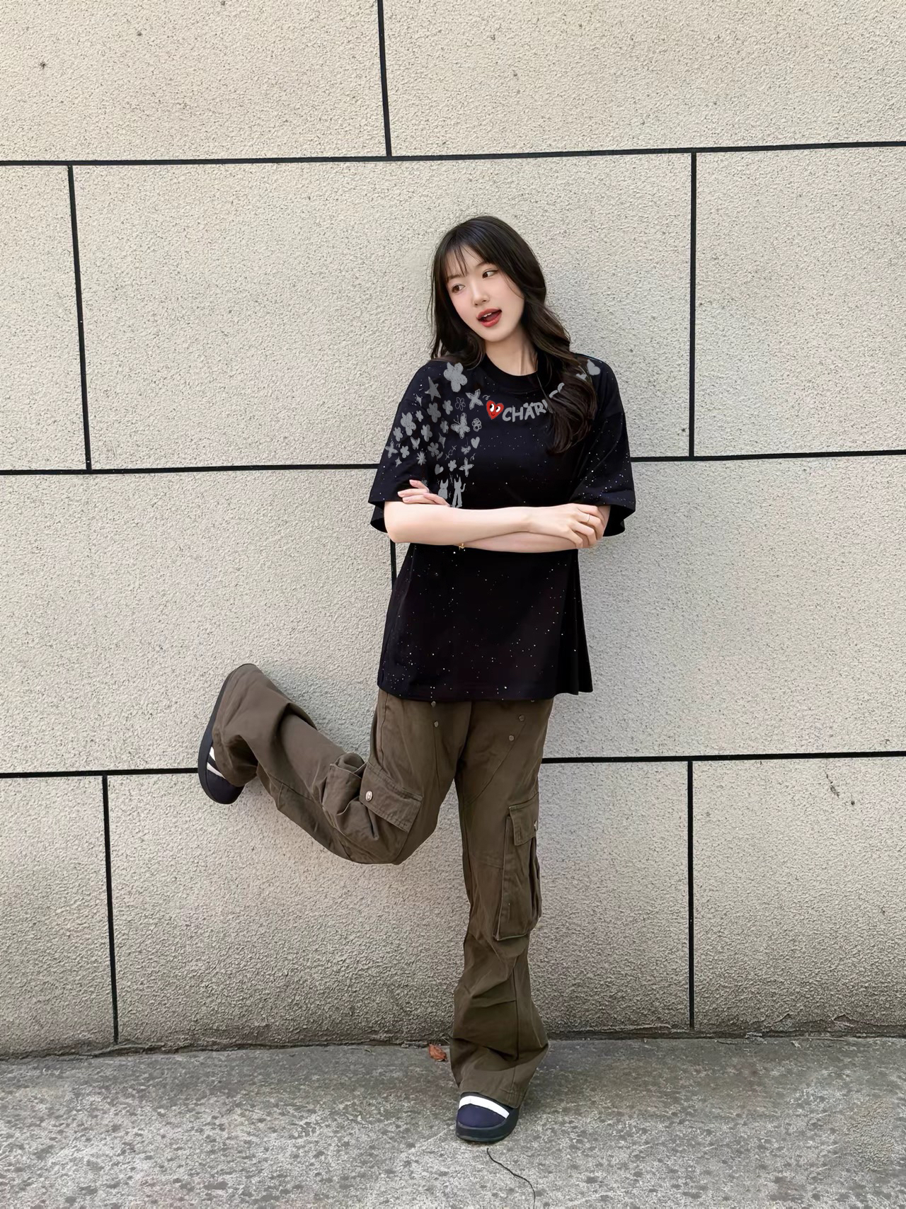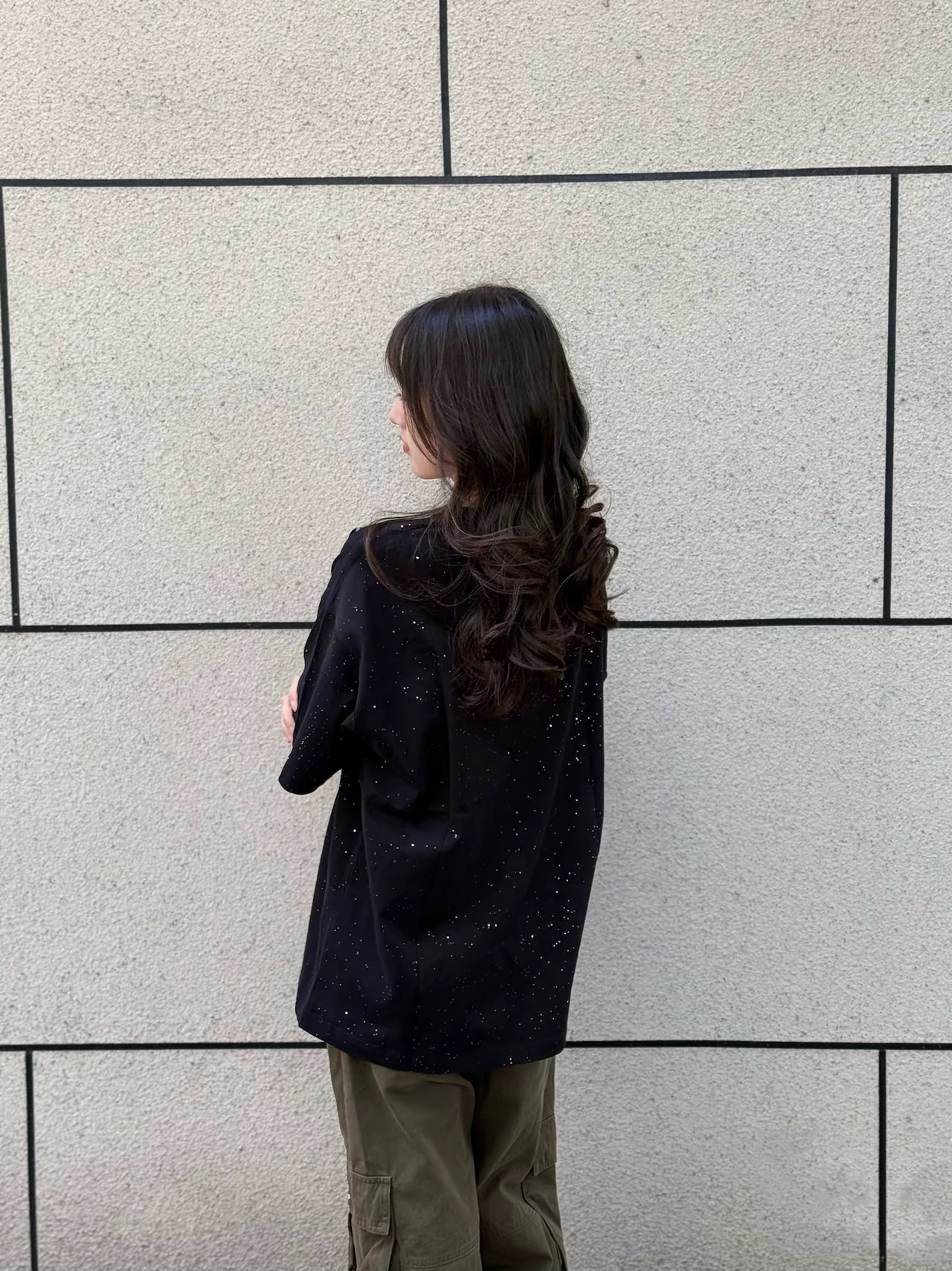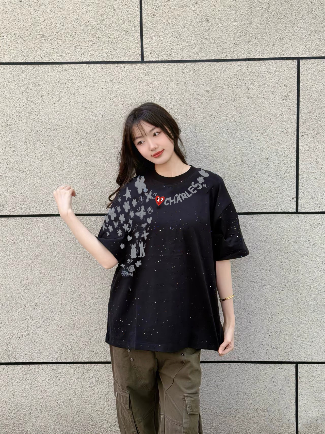 家人们谁懂啊!!这件满天星 T 恤简直是氛围感神器!!黑色底色搭配白星星,温柔到骨子里~胸前的印花字母超精致,摸起来超有质感✨!! 落肩设计完美修饰肩型,对肩宽姐妹超友好~搭配工装裤,妥妥的纯欲风天花板👗!!日常通勤或者周末出游,随便套上都能轻松出片📸!!这个夏天必须人手一件!!