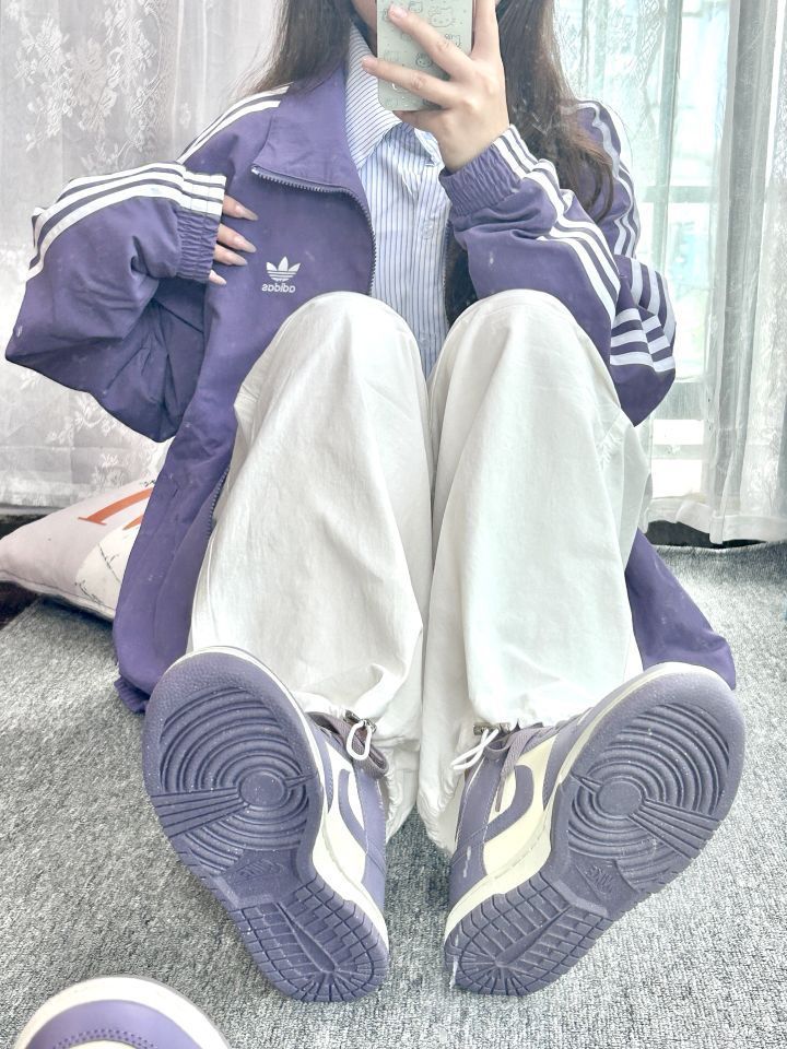 紫色💜阿迪达斯外套太绝啦~好有活力啊啊啊~#好物分享紫白dunk #白紫配色鞋太好看了 #很难不爱的白➕紫配色鞋子 #Nike白紫 搭配白色工装裤温柔有活力 白紫配色鞋太好看了 很难不爱aaaaa 快冲鸭~