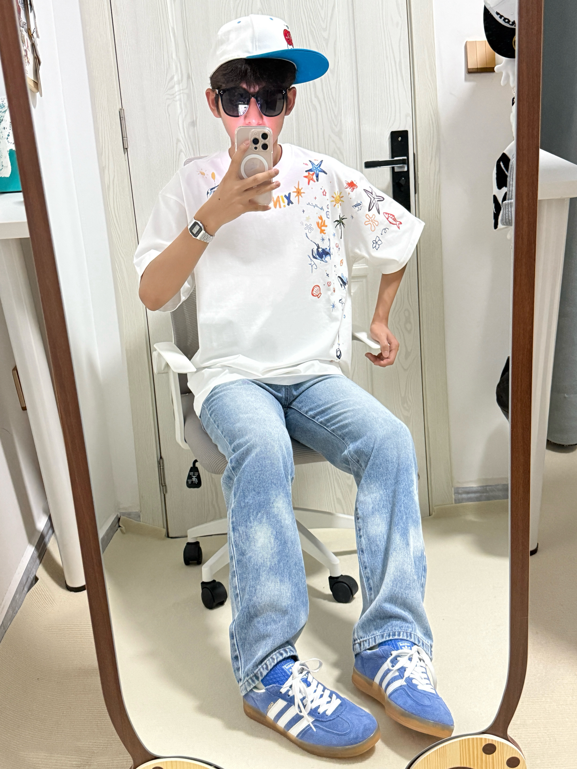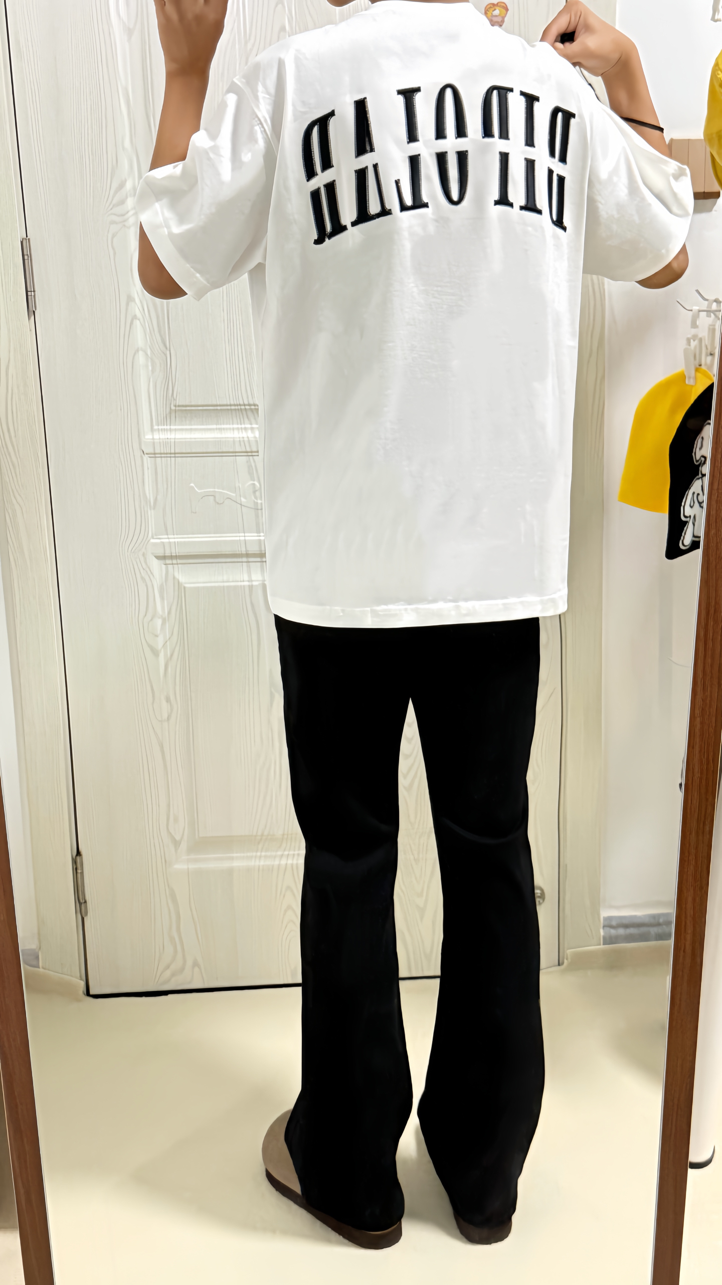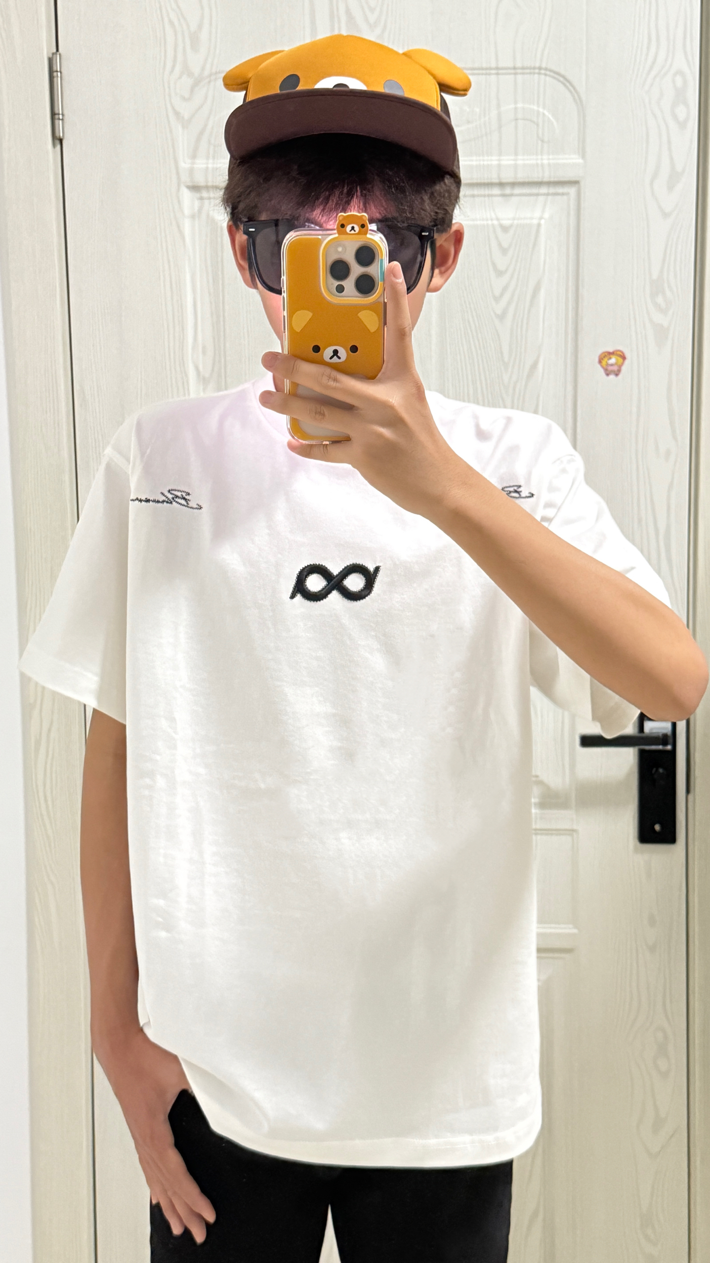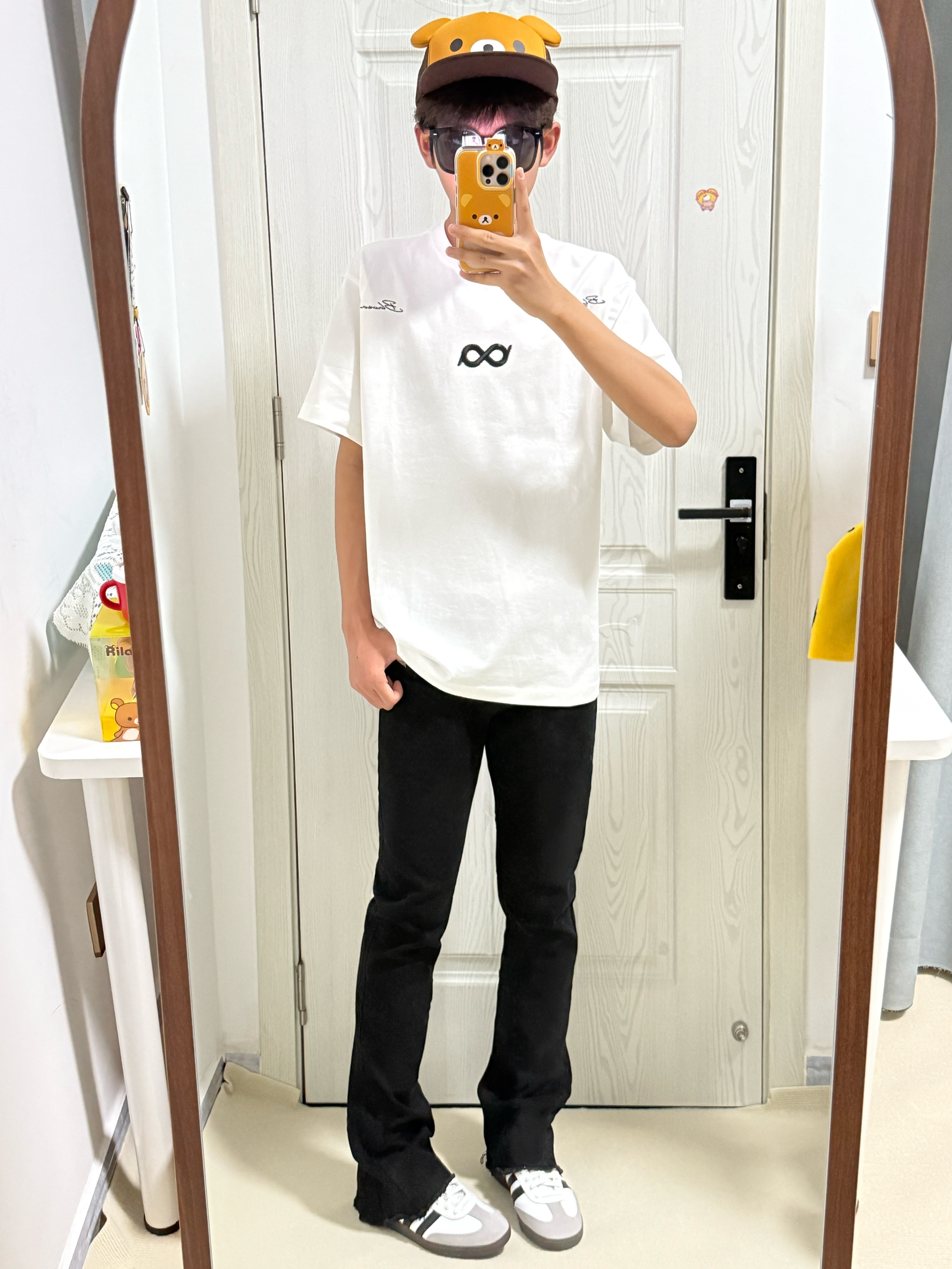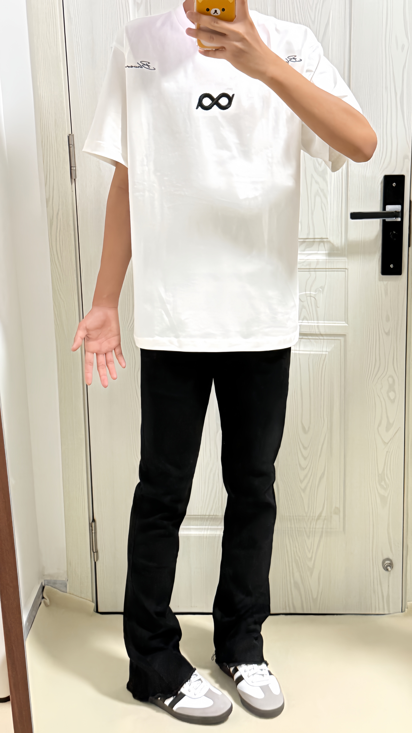 今天穿的白色断开Logo刺绣T恤☁️ 前后都是莫比乌斯坏设计👀 搭配黑色⚫️毛边微喇牛仔裤➕adidas德训鞋🩶