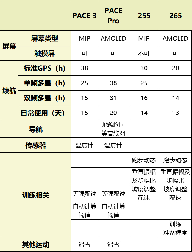 佳明245用了五年,续航终于不行了 决定换表考虑PACE3/PACE Pro/255/265。 965由于价格原因一开始就淘汰。 且在官方数据对比中发现,965的续航也并不能打。 首先265对比255,265相当于只升级了A屏及「训练准备程度」,续航还更差,淘汰265 然后255和PACE3,续航、功能等255略胜一筹,且255更便宜,淘汰PACE3 最后255和PACE Pro对比,冲着续航和升...