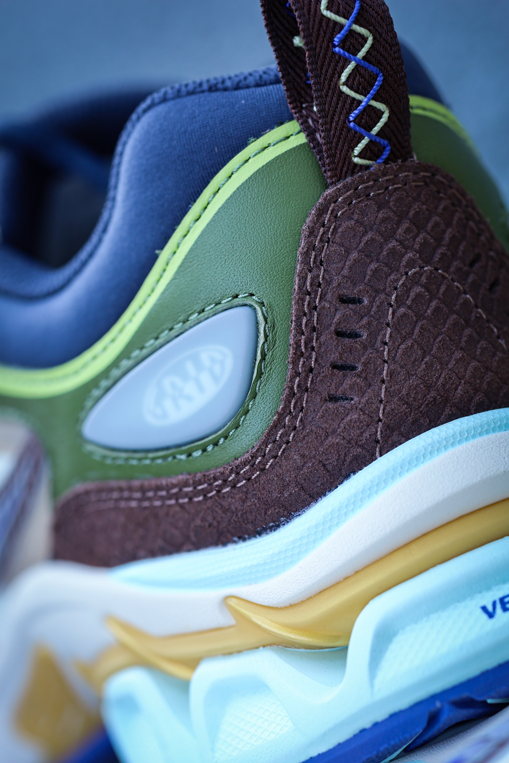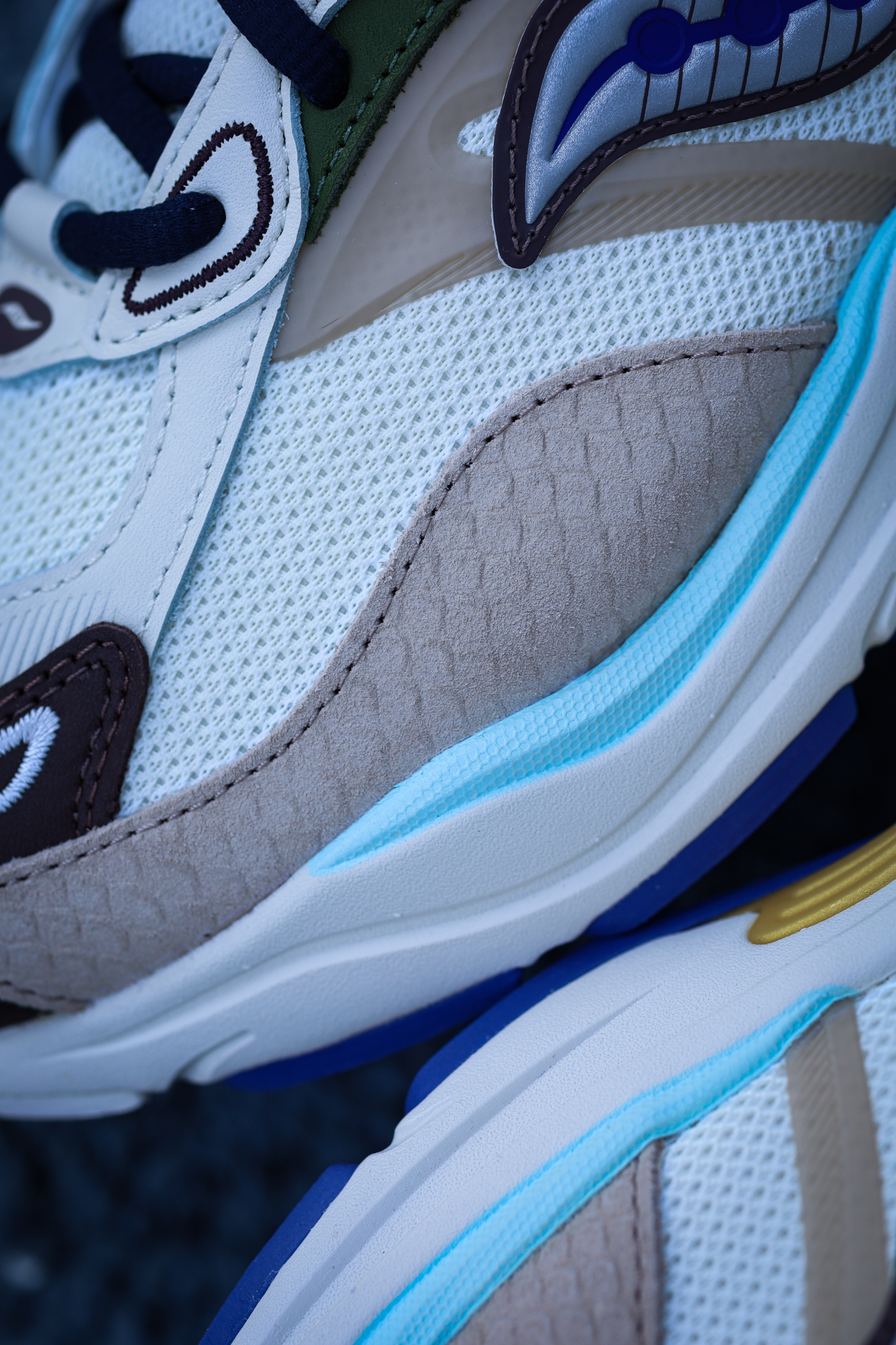 索康尼家的GRID FUSION蛇年限定配色,真的非常应景,实物很不错! 它的设计灵感源于沙漠里爬行动物的鳞片和眼睛,整个色系非常缤纷多彩,细节也相当丰富: 比如左右颜色不对称的鞋舌,好比蜥蜴的异瞳;后跟提手上有中国传统的蛇结;鞋底前段模拟蛇吐信子的红色箭头;鞋面上更是有不少蛇鳞纹路。 颜值不知道兄弟们觉得如何? 鞋面材质特别丰富,层次感、质感和舒适度都非常不错。整体脚感是偏韧弹的,稳定性和抓...