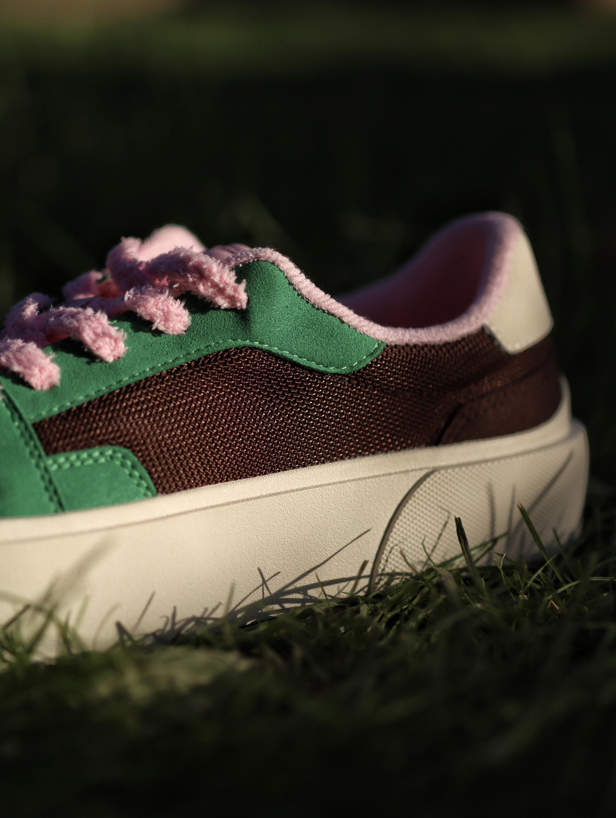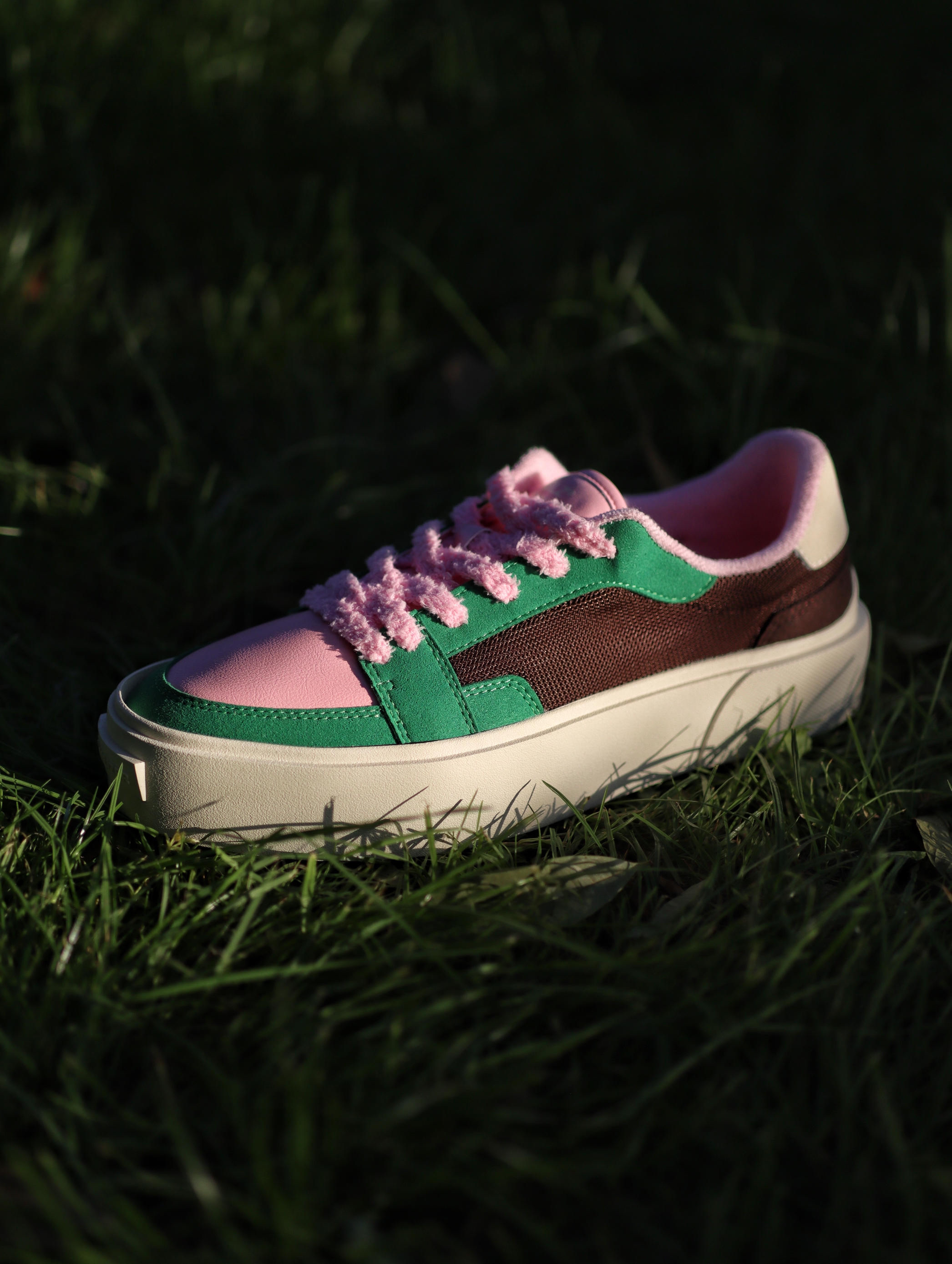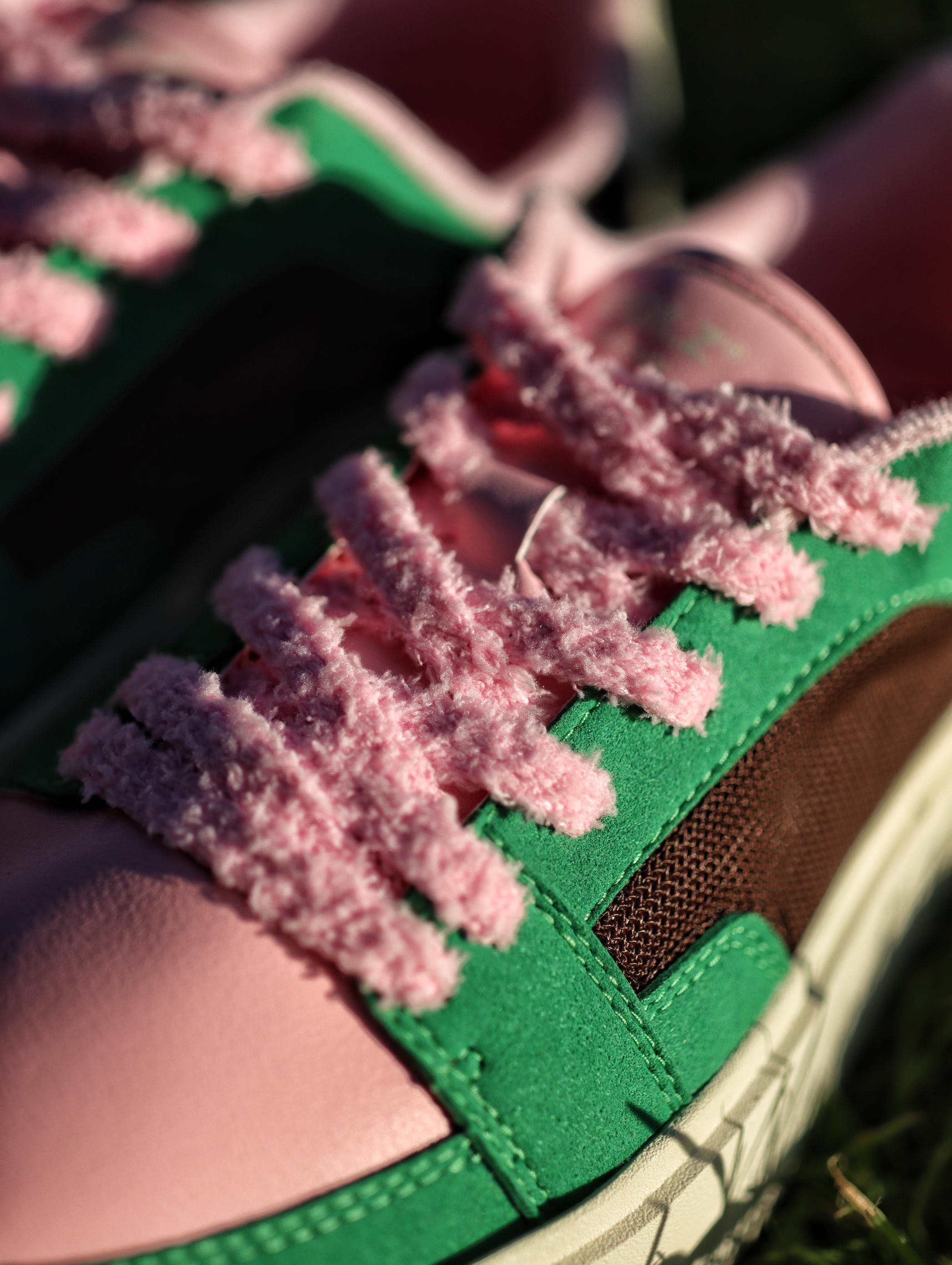 以前夏天我都是以黑白灰板鞋居多 这次夏天想试不一样的感觉 绿棕的配色搭配上粉色的鞋带 还蛮好看的 侧边棕色是网布材质 夏天穿透气性还不错 如果夏天穿腻了黑白灰配色的板鞋 我觉得这双绿棕粉配色不妨试试✌️