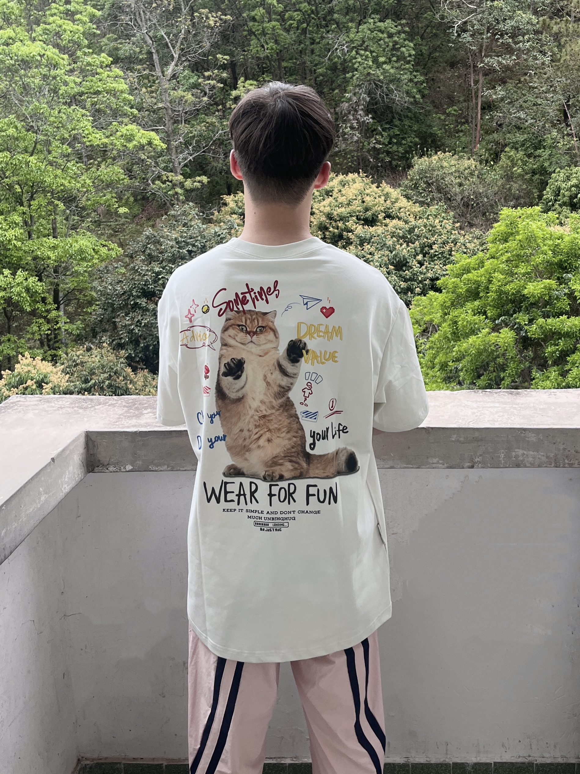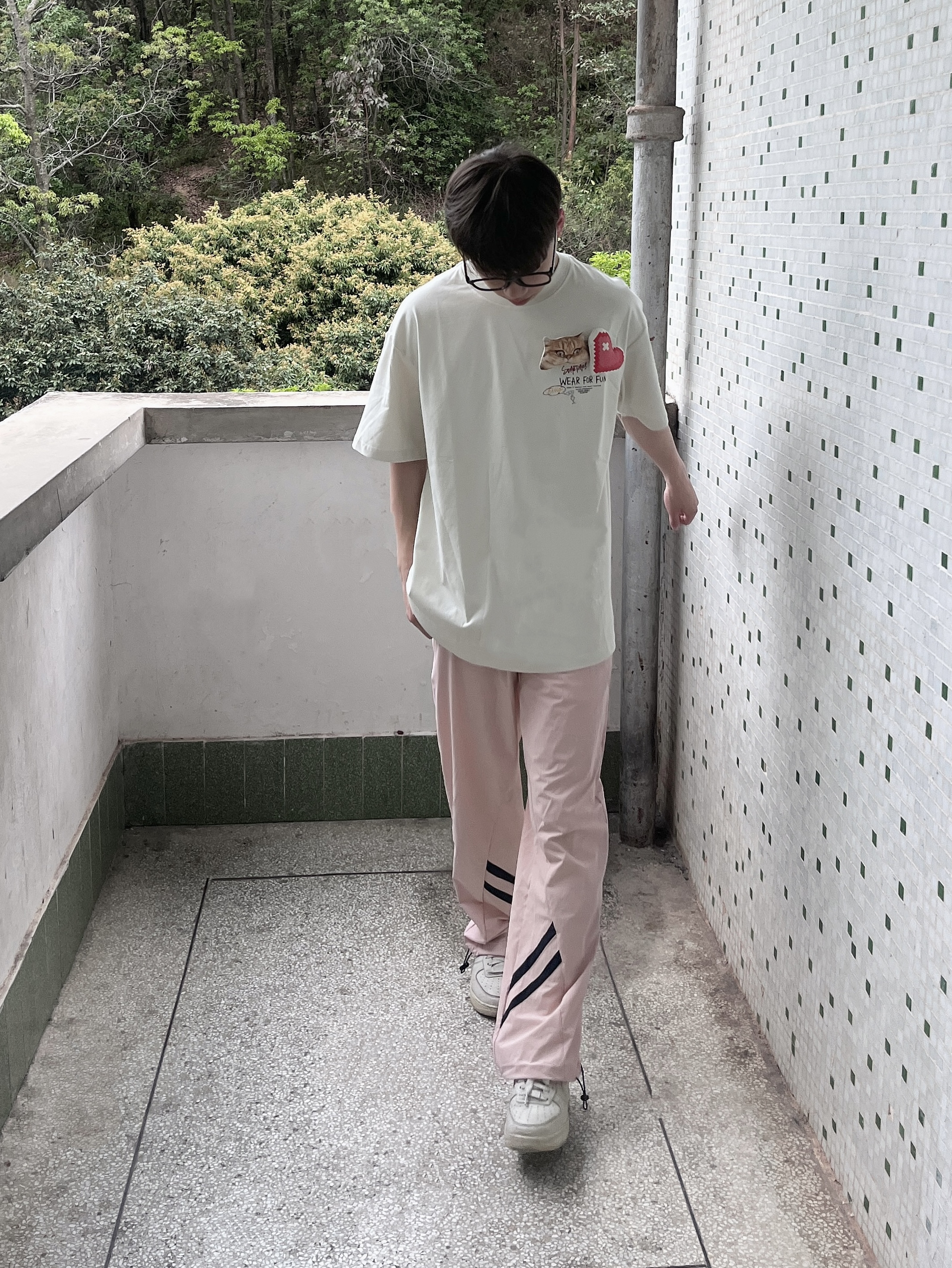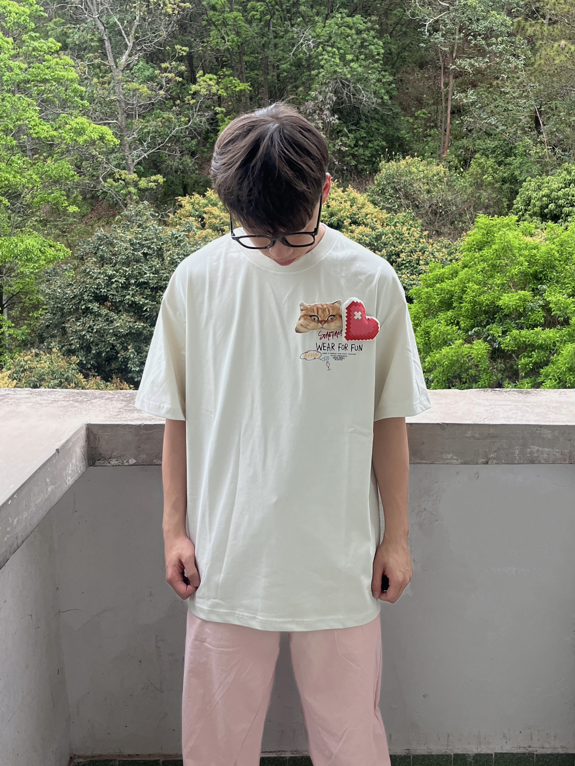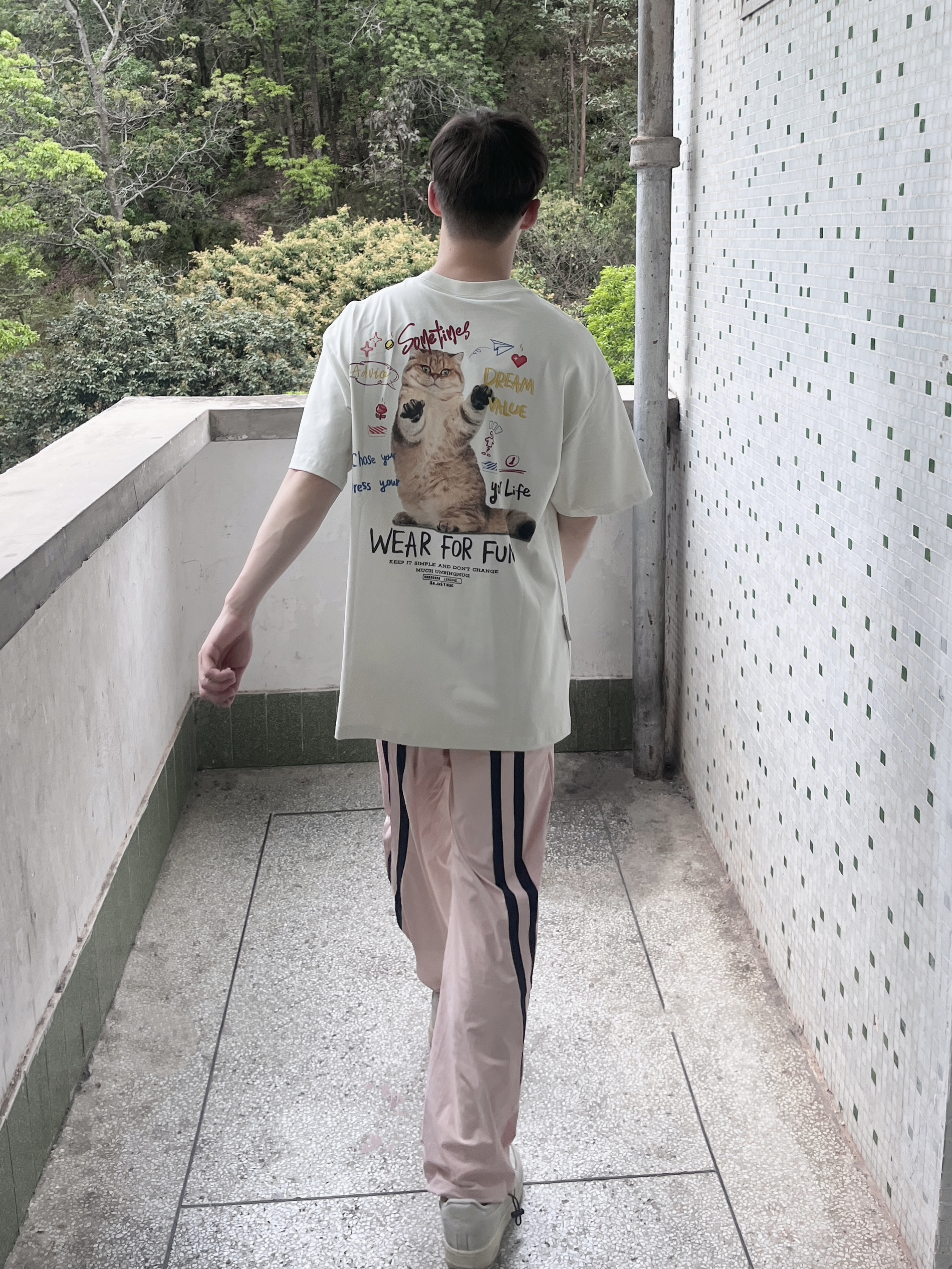 今日份穿搭分享look👀 衣服是 BJHG 的奶白色复古短袖👔 小猫印花图案潮酷时尚 纯棉面料舒适透气 爱心魔术贴设计感满满 版型也很正🔥 再搭配一条浅粉色休闲直筒裤 一套搭配下来 夏天出街百搭又好看🚶