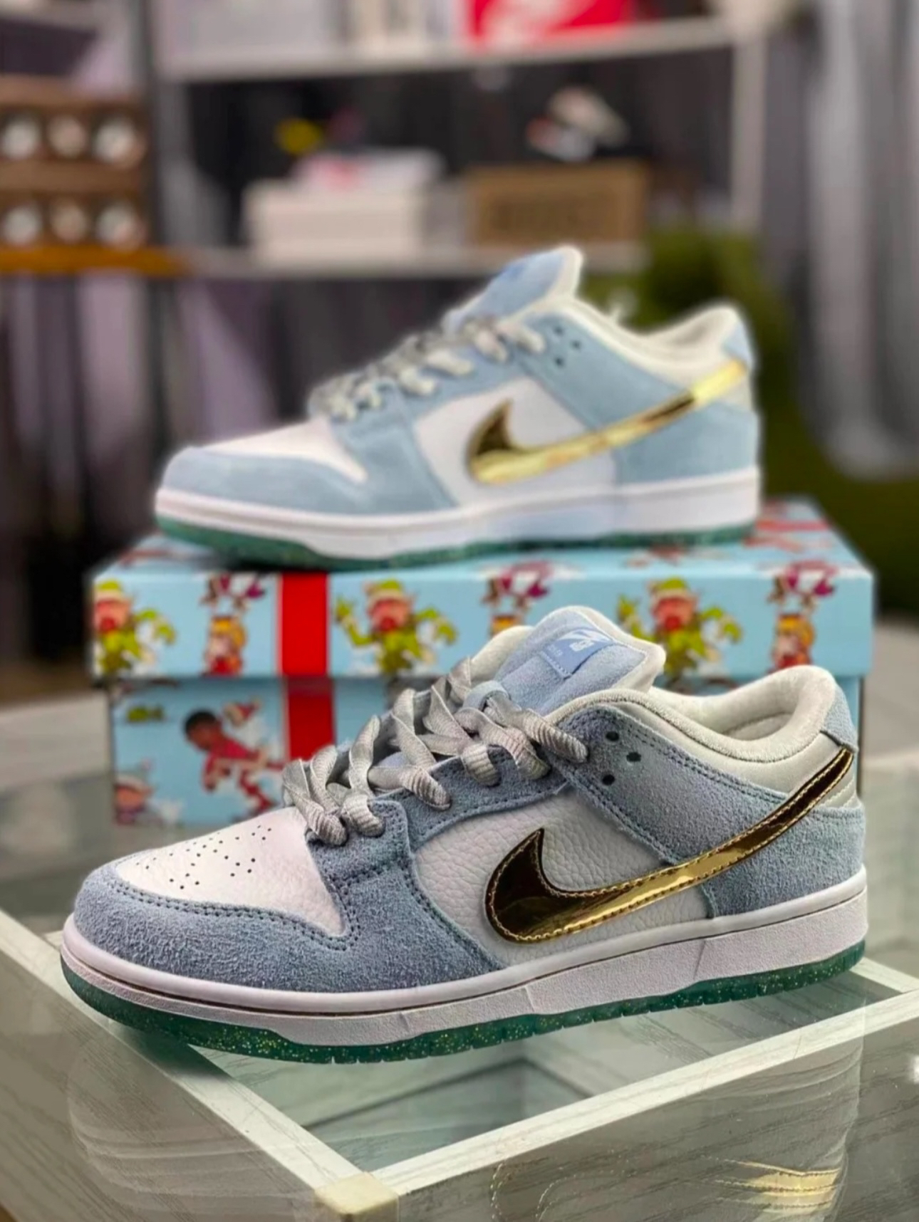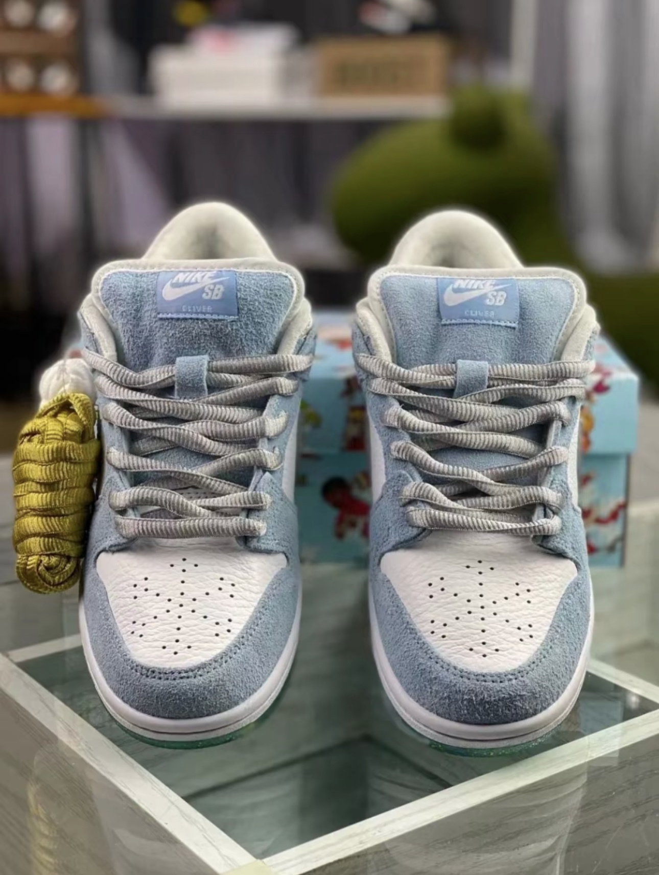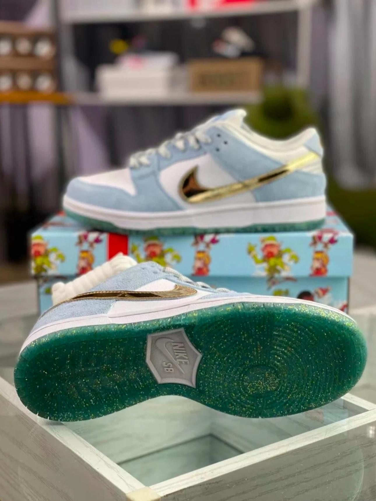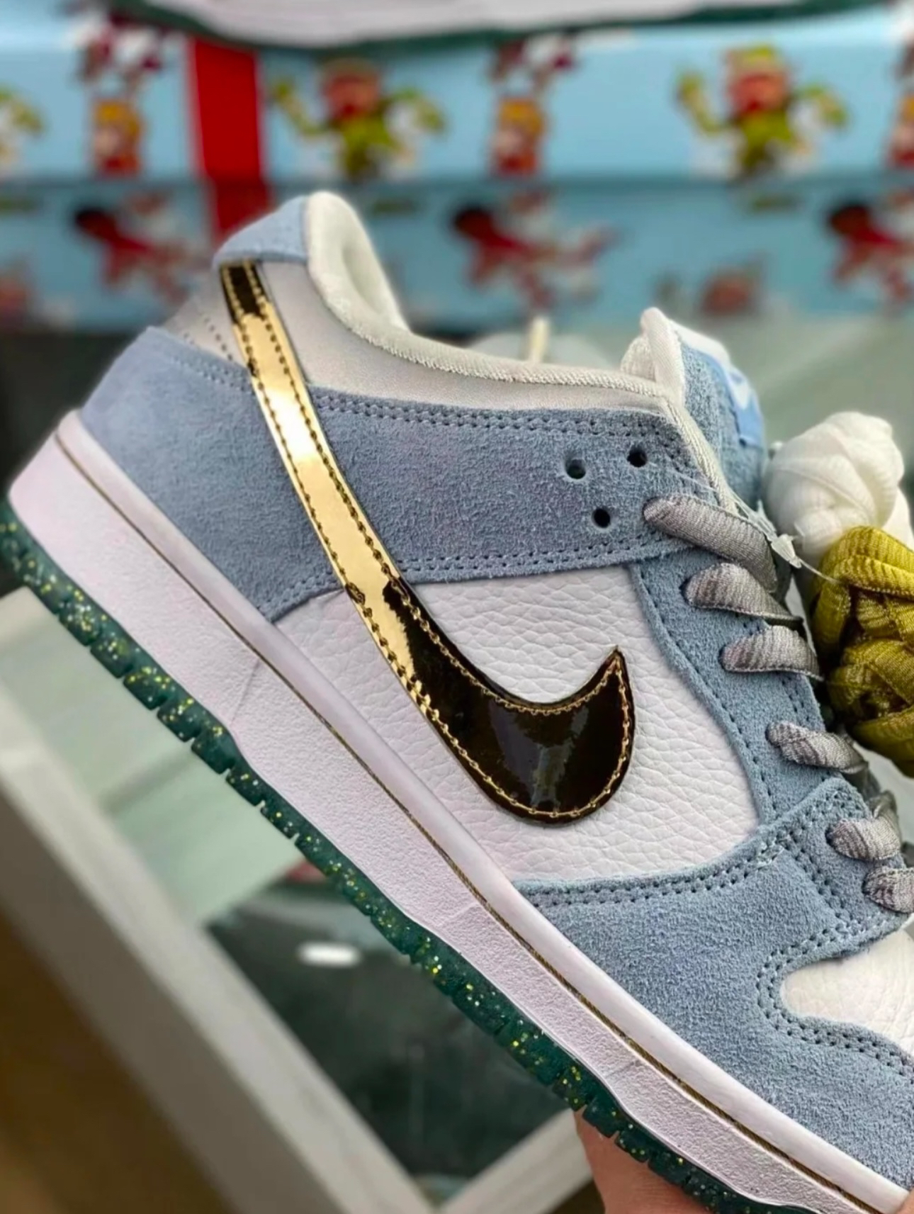 本次新配色鞋面采用白色皮革、淡蓝色麂皮搭、银色后跟配金色SWOOSH设计,鞋垫内带有Sean Cliver的签名和其绘制的图案,鞋带以及后跟处采用了银色点缀,与液态金Swoosh和大底缝线相呼应,整体搭配丝毫没有违和感。网友给这双Dunk起名为“冰雪奇缘”,整体和女角色艾莎的外形十分相似, 此次配件还搭配了特别版圣诞礼盒以及贴士还有玩偶,细节十分出众