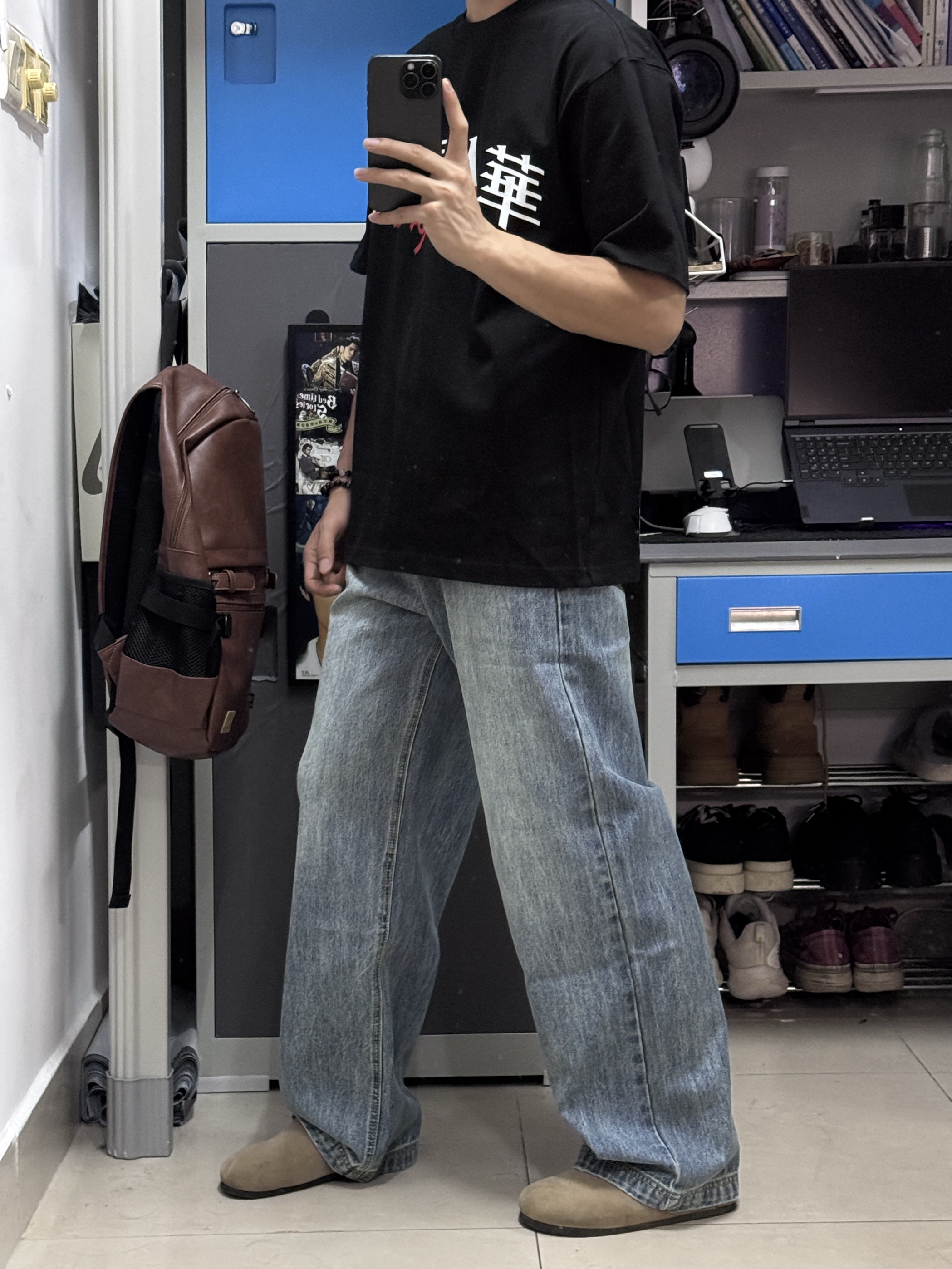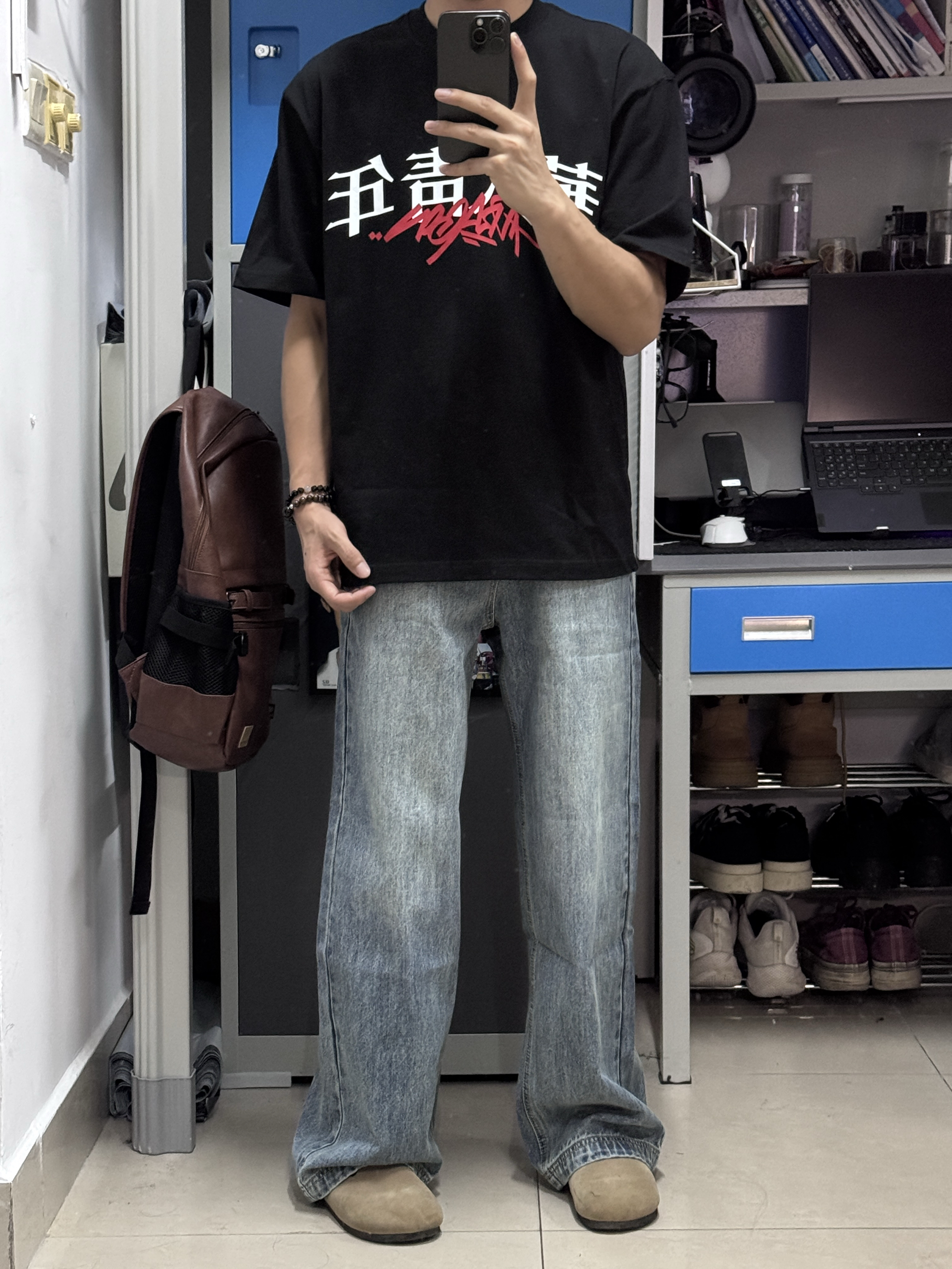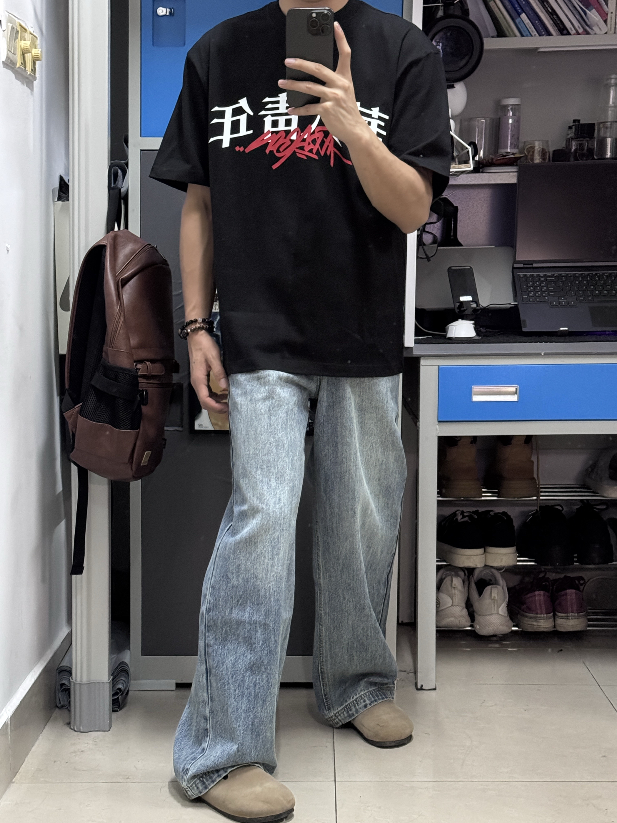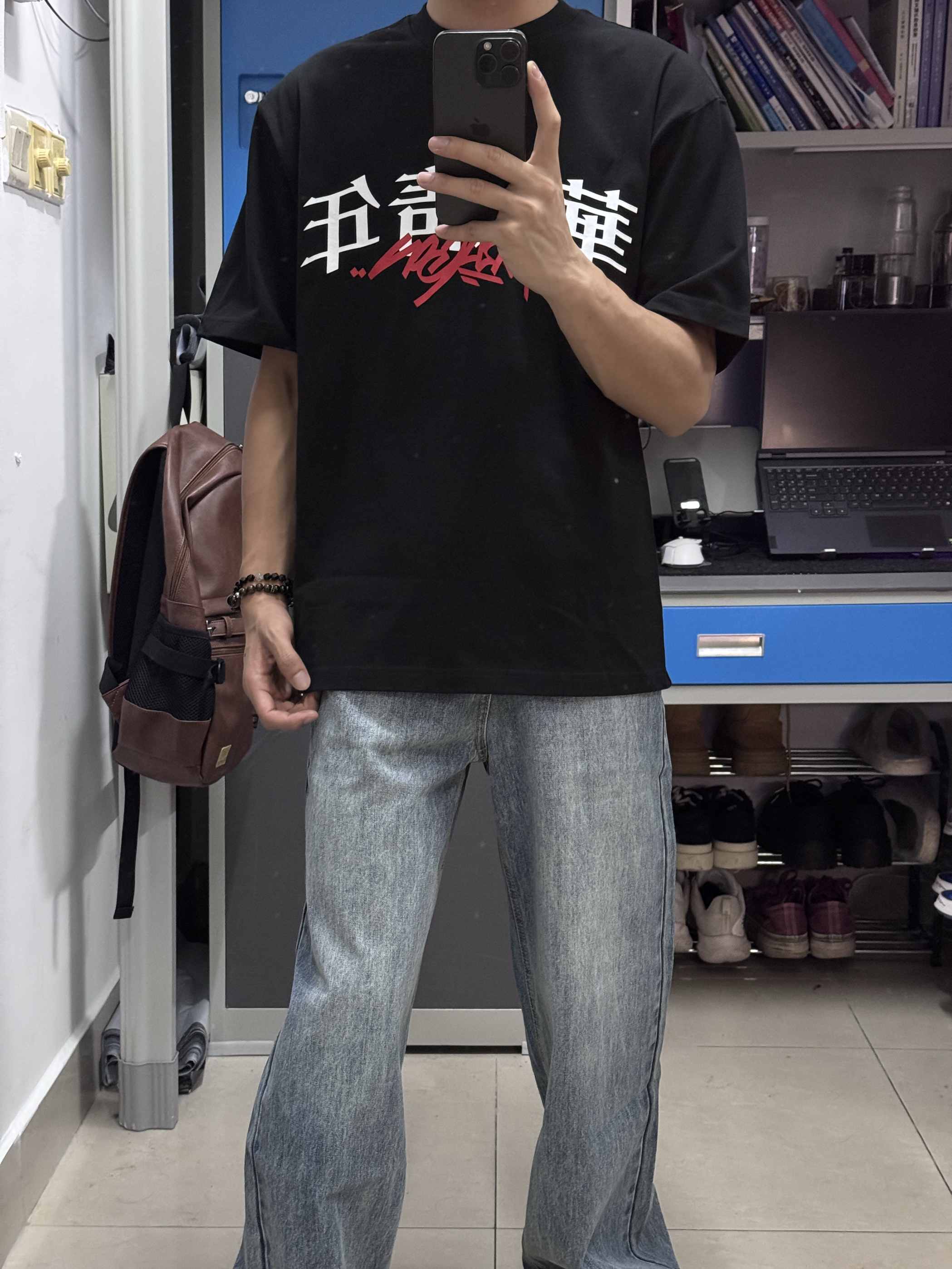 华人青年宝藏短袖被我发现了 👔华人青年 胸前的“华人青年”就很帅 短袖的面料很好 穿起来透气性不错 潮流时尚的款式 上身颜值很高哦 宽松直筒的牛仔长裤真的百搭耐看 适合日常的各种穿搭场景 裤子面料做工还不错 这一套很适合学生党 潮流时尚