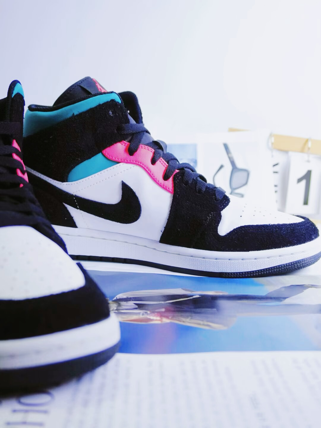 作为资深球鞋控,这双Jordan 1 Mid SE "South Beach"到手瞬间就懂——经典中帮鞋型+迈阿密南海岸基因,把闷骚美学玩到极致!鞋头荔枝纹牛皮自带高级哑光,侧翼拼接处突然杀出的珊瑚粉麂皮,像海风里突然蹦出的热带果汁,后跟磨砂黑托住整个配色,完美拿捏了"亮眼不浮夸"的分寸。 实测上脚比普通AJ1更跟脚,Ortholite鞋垫踩着像踩棉花糖,暴走两万步脚底板都没抗议。重点夸夸这个魔...