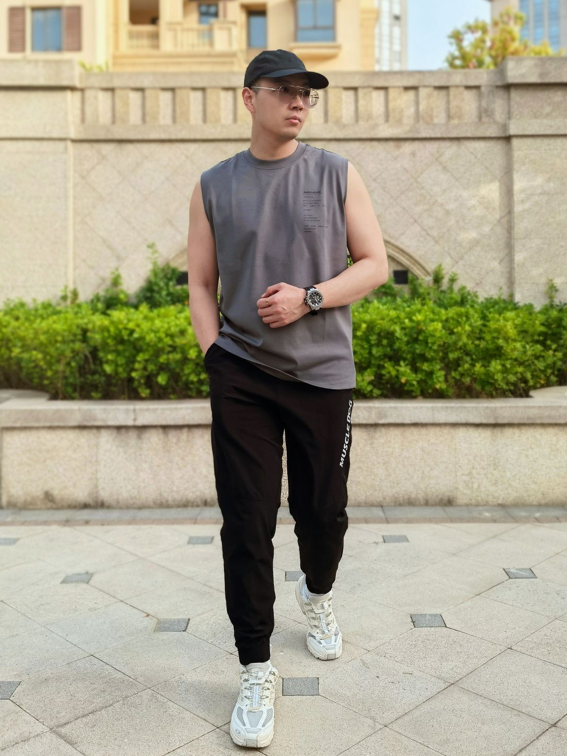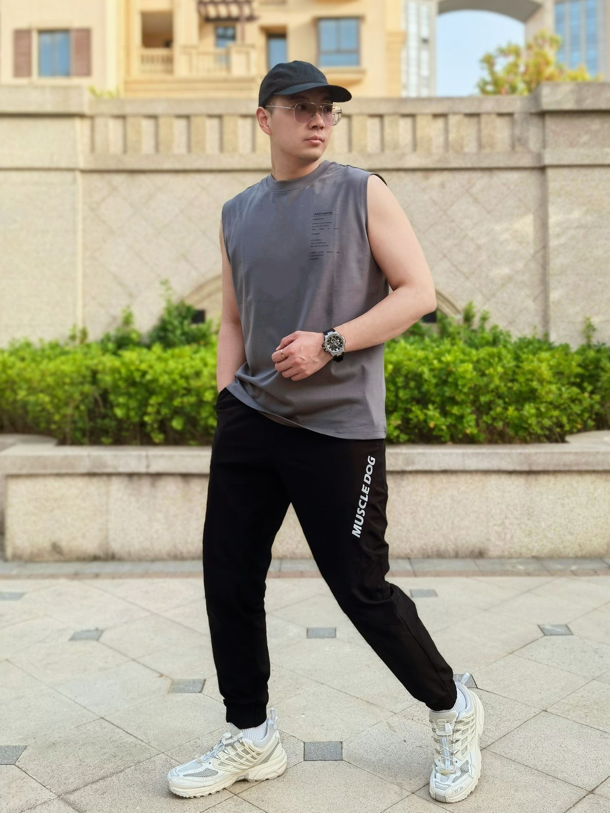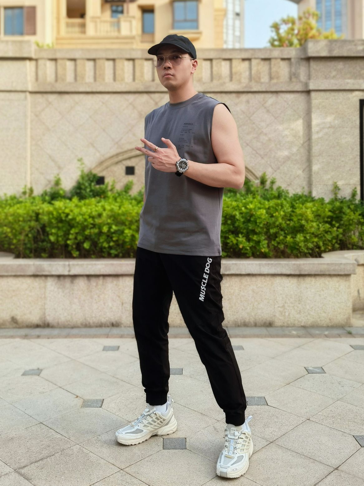 hello 大家好,这里是撒旦锅锅 💗179cm/80kg 🌞今日穿搭为潮流休闲风格 搭配类型:+运动裤+运动鞋 上身搭配灰色背心,无袖设计更加的舒服透气,版型上身也帅气,很百搭,下身搭配一条黑色运动裤,鞋子搭配一双白色SALOMON萨洛蒙运动鞋,整体黑白灰搭配运动少年感十足,真心推荐💞