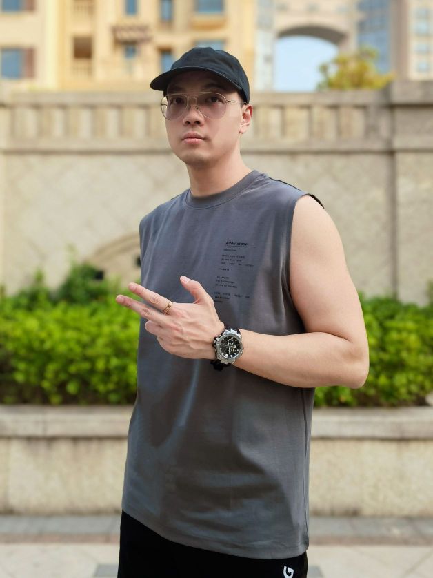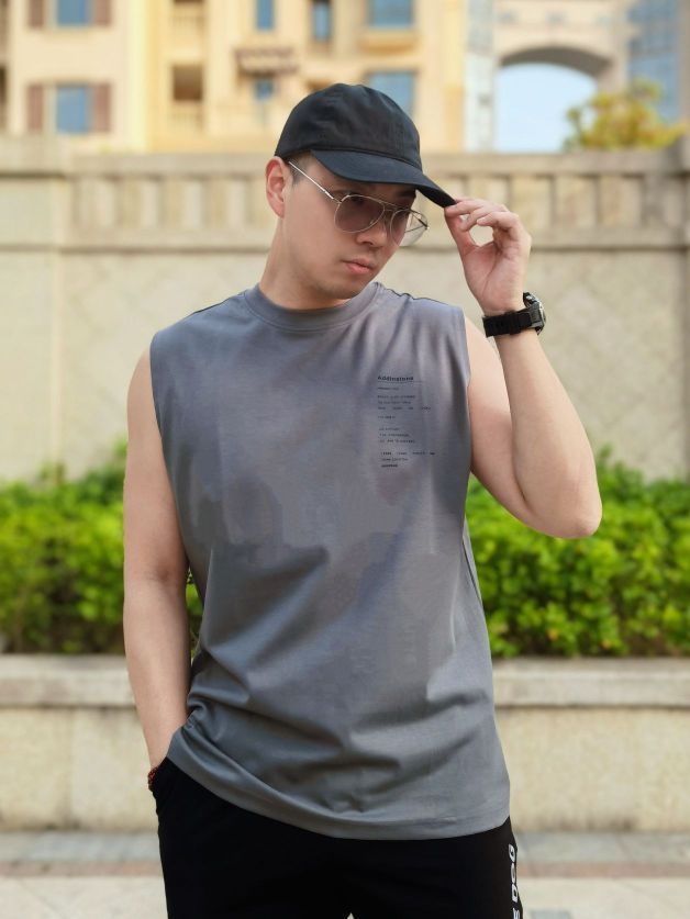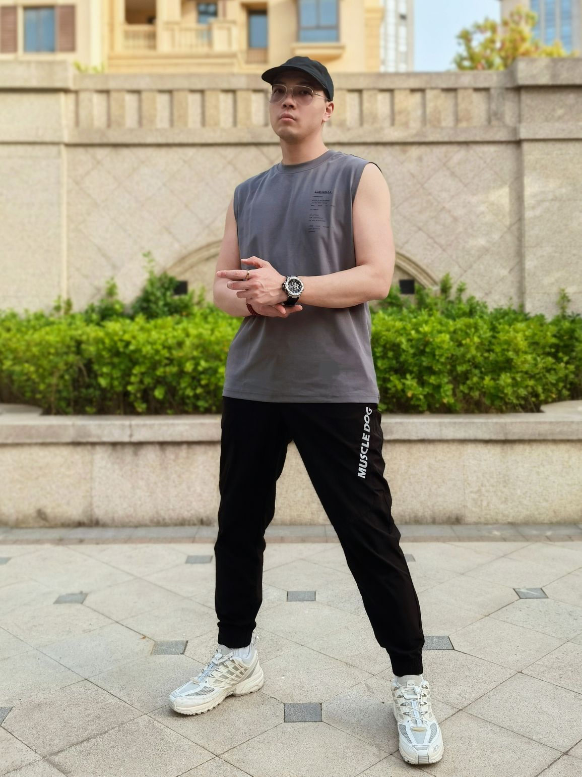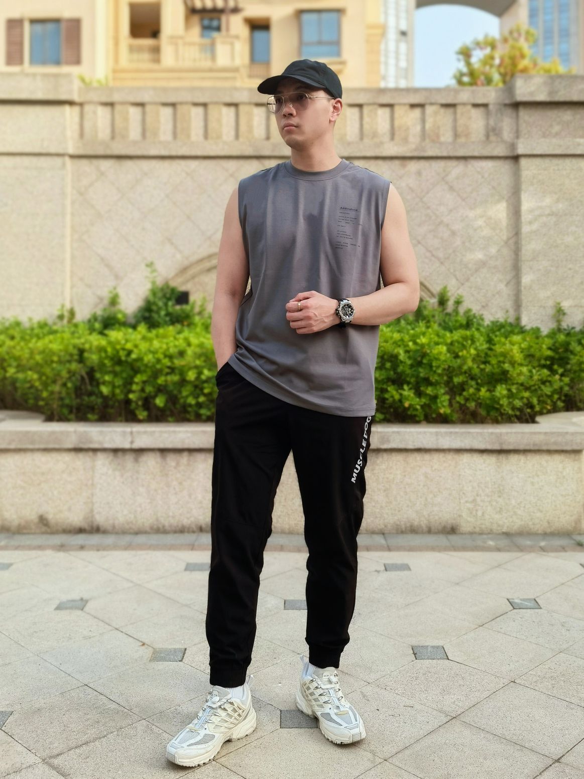 hello 大家好,这里是撒旦锅锅 💗179cm/80kg 🌞今日穿搭为潮流休闲风格 搭配类型:+运动裤+运动鞋 上身搭配灰色背心,无袖设计更加的舒服透气,版型上身也帅气,很百搭,下身搭配一条黑色运动裤,鞋子搭配一双白色SALOMON萨洛蒙运动鞋,整体黑白灰搭配运动少年感十足,真心推荐💞