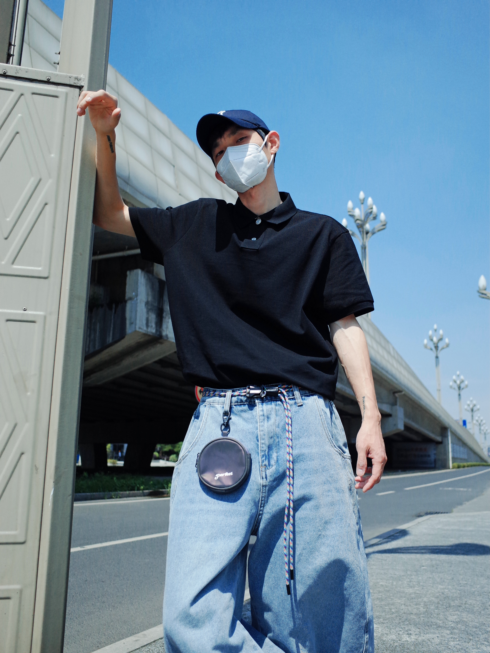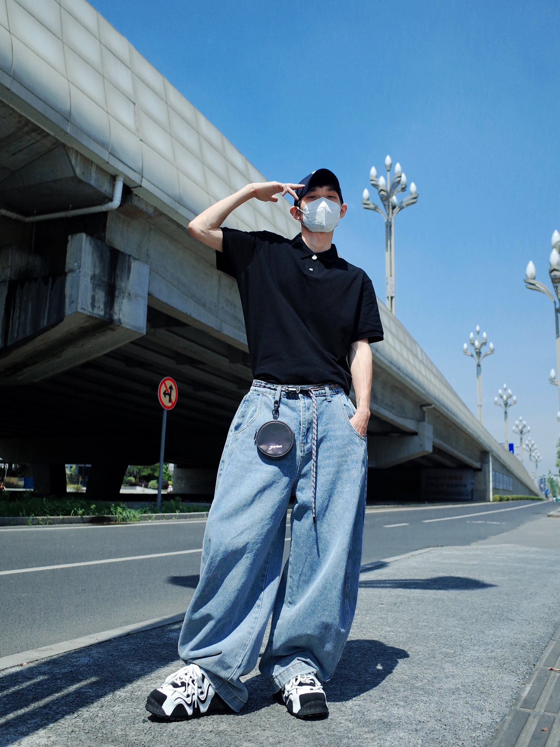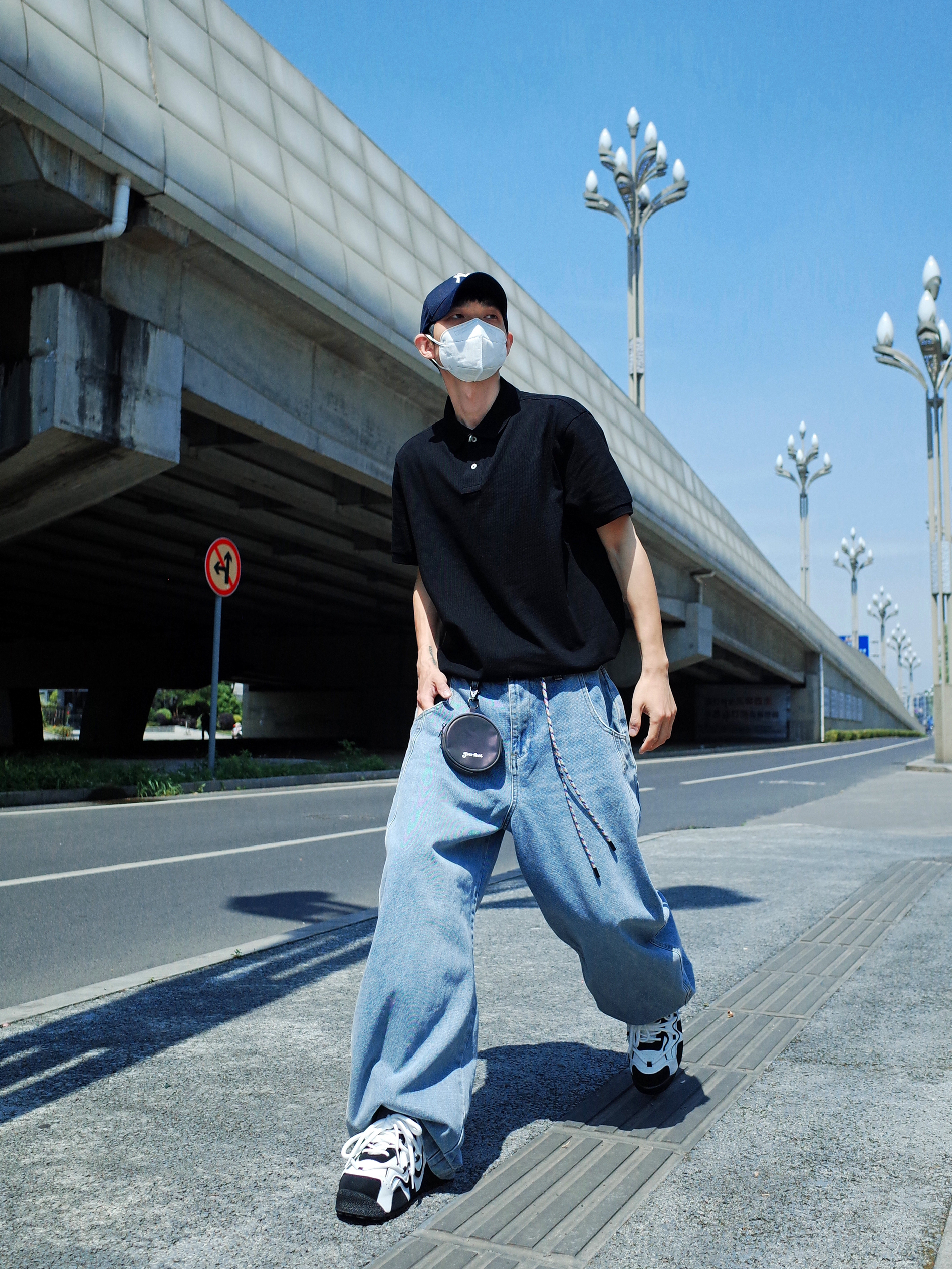 简单的穿搭也可以帅的毫不费力❗️ 上身一件布先生的⚫️黑色polo衫, 搭配一条🔵浅蓝色的弯刀牛仔裤, polo塞一些衣角进裤子, 阔腿高腰的感觉就出来啦✨ 再来一双黑白板鞋, 不超过三色的极简主义一眼清爽感🐳 通勤约会都可以轻松拿捏🔆 (涵哥179/55穿3XL略宽松哦~)