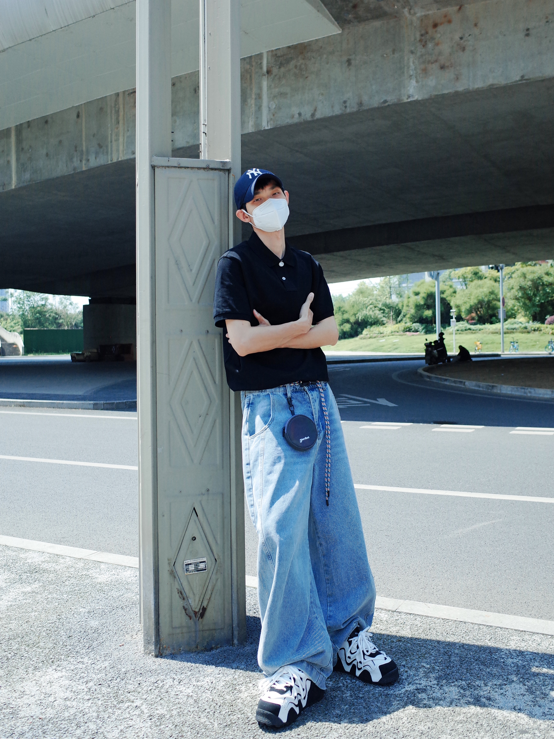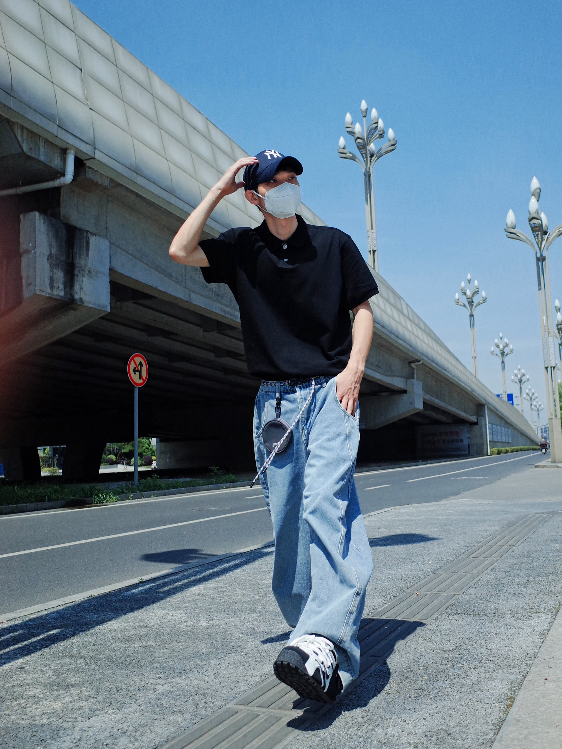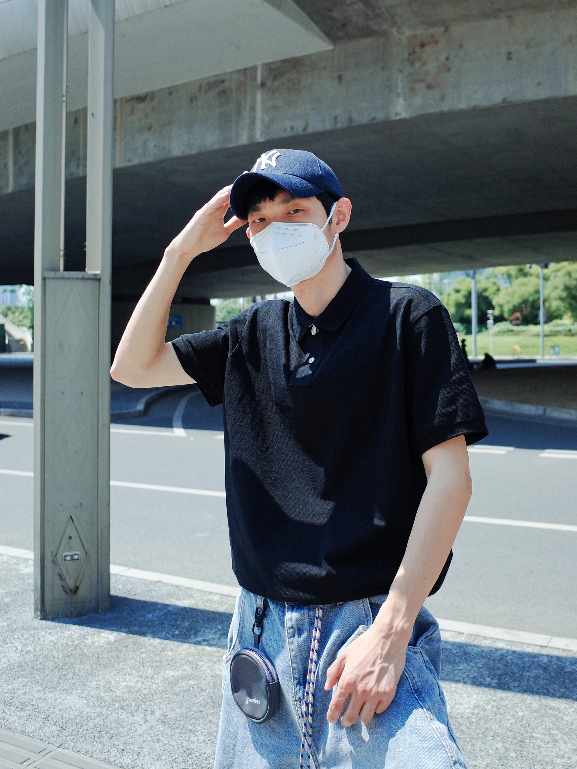 简单的穿搭也可以帅的毫不费力❗️ 上身一件布先生的⚫️黑色polo衫, 搭配一条🔵浅蓝色的弯刀牛仔裤, polo塞一些衣角进裤子, 阔腿高腰的感觉就出来啦✨ 再来一双黑白板鞋, 不超过三色的极简主义一眼清爽感🐳 通勤约会都可以轻松拿捏🔆 (涵哥179/55穿3XL略宽松哦~)