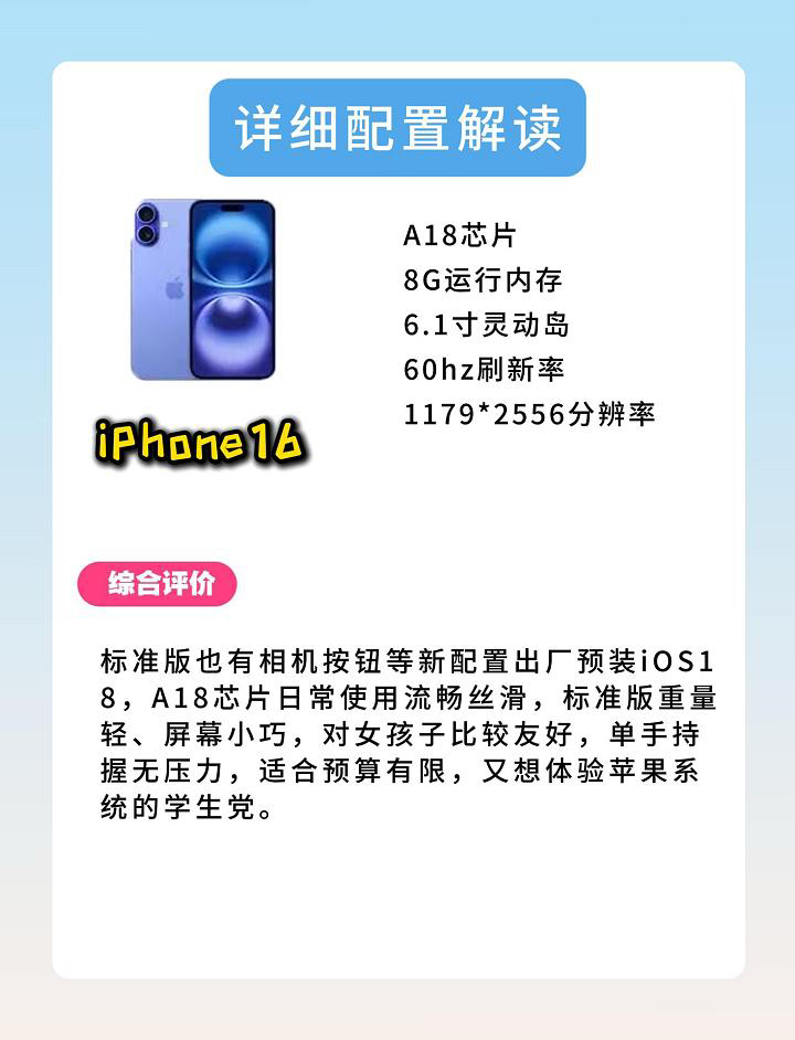 如果你预算有限,又想体验 iOS 系统的流畅与稳定,以及苹果生态的便捷,iPhone 16 和 16 Plus 绝对是高性价比之选。7.8mm 的轻薄机身,让单手操作轻松自如,小屏幕版本带来的握持感更是细腻舒适;而 16 Plus 则凭借更大的电池容量,进一步提升续航表现,让日常使用不断电。 追求极致性能与高端体验的用户,iPhone 16 Pro 和 Pro Max 才是心头好。全新 A18...