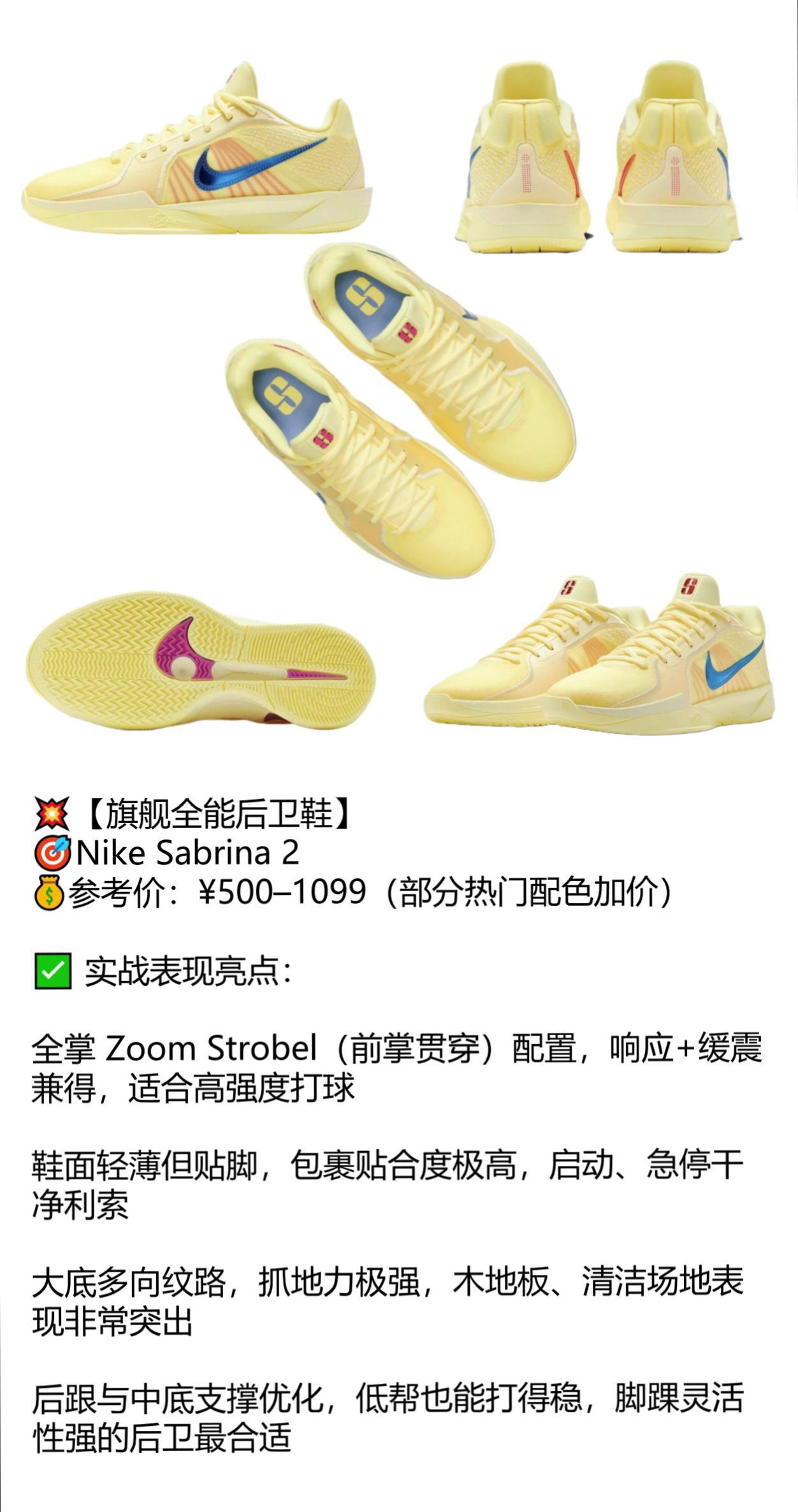 本篇笔记关联了Nike Sabrina 2 篮球鞋 抗扭防滑耐磨舒适缓震时尚百搭训练轻便 灰色/白色、Nike Sabrina 2 篮球鞋 抗扭防滑耐磨舒适缓震时尚百搭训练轻便 浅柠檬黄绿/脉冲宝蓝/石膏色/激光紫红、361° BIG3 5.0 Quick Pro 超临界发泡碳板 缓震透气 防滑耐磨 抗冲击 回弹 后卫 篮球鞋 海绵宝宝等商品,为用户提供真实的使用体验和购买参考。