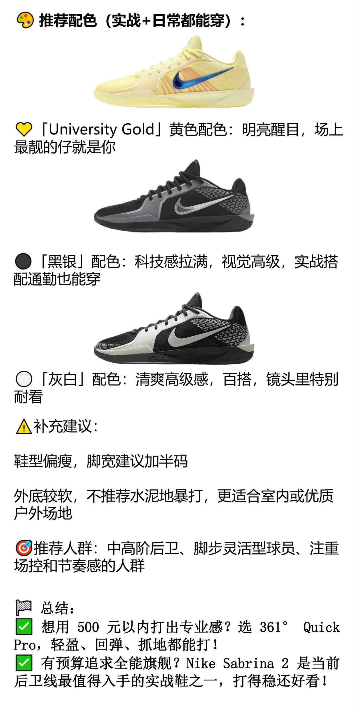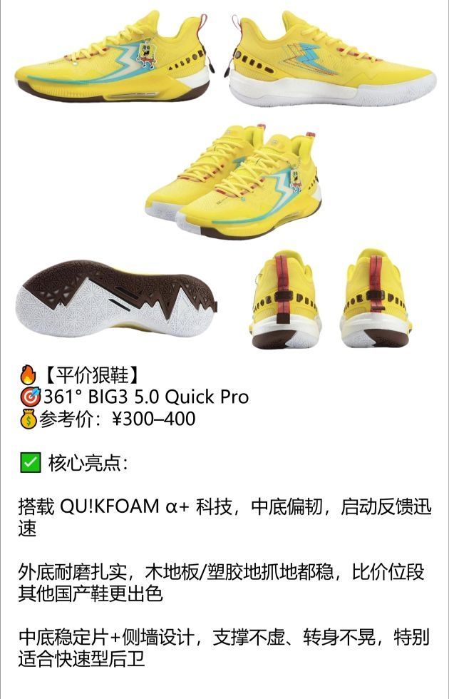 来自 361° 和 Nike 的两双后卫利器,不同价格但都值得入手,尤其适合注重启动、变向、节奏感的控卫/分卫👇 🔥【平价狠鞋】 🎯361° BIG3 5.0 Quick Pro 💰参考价:¥300–400 ✅ 核心亮点: 搭载 QU!KFOAM α+ 科技,中底偏韧,启动反馈迅速 外底耐磨扎实,木地板/塑胶地抓地都稳,比价位段其他国产鞋更出色 中底稳定片+侧墙设计,支撑不虚、转身不晃,特别适合快...