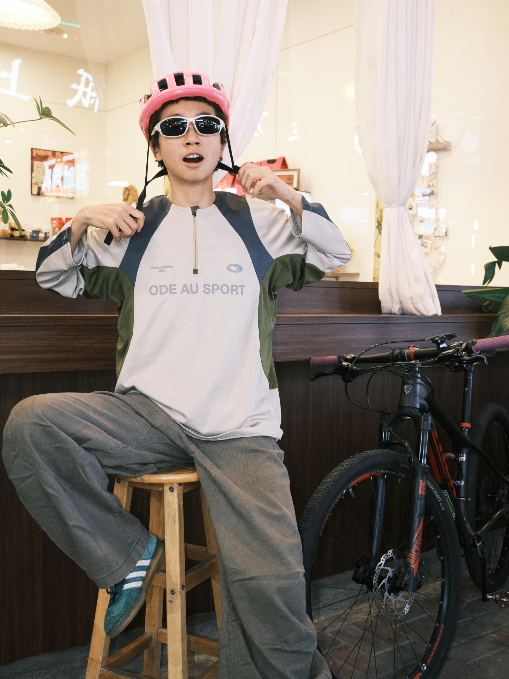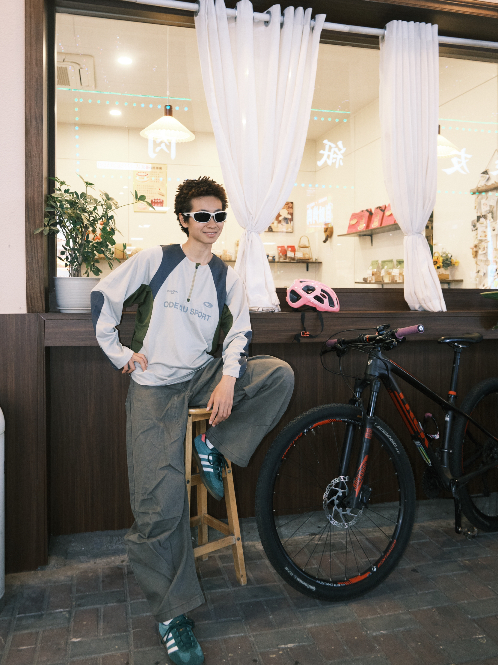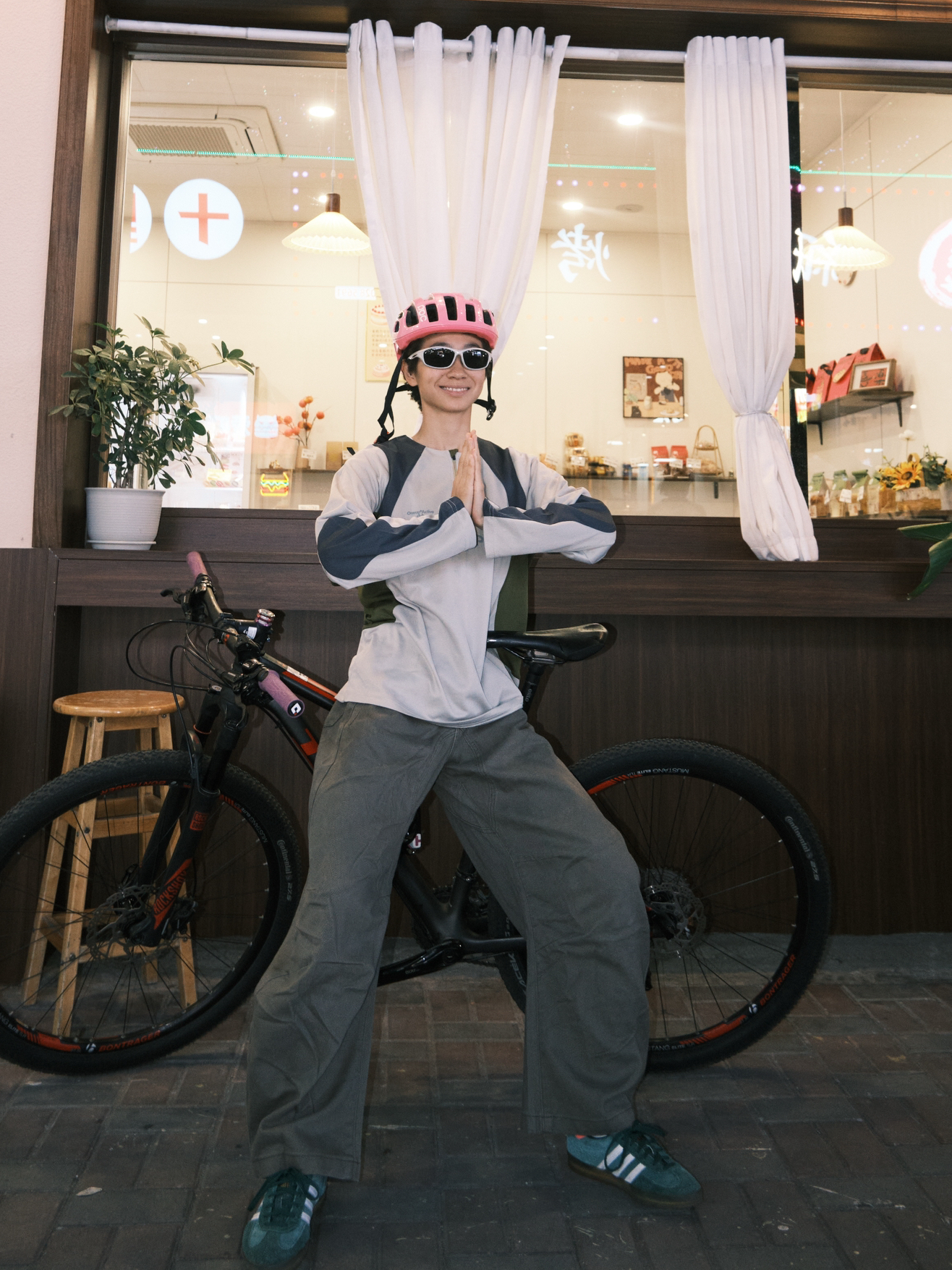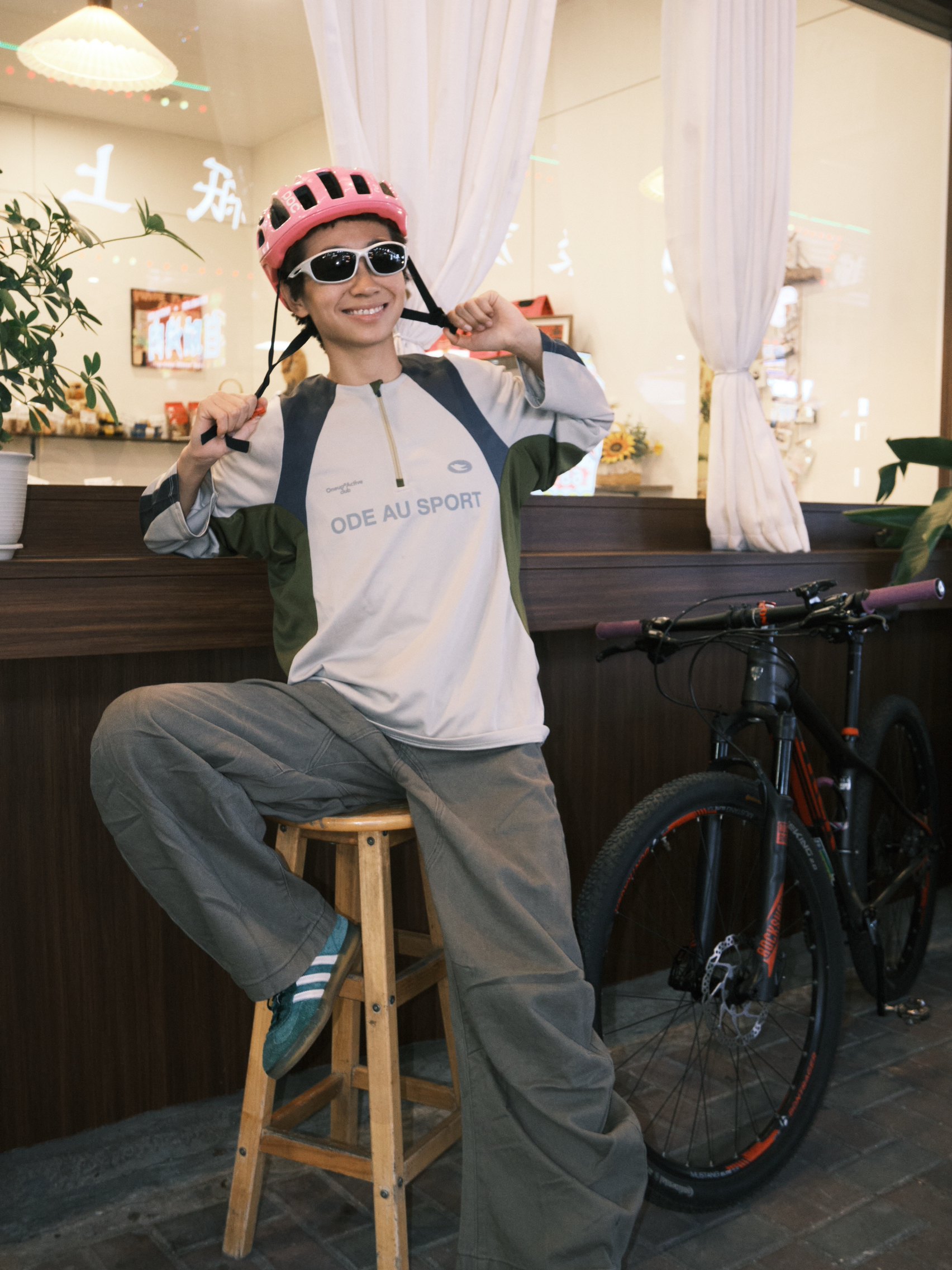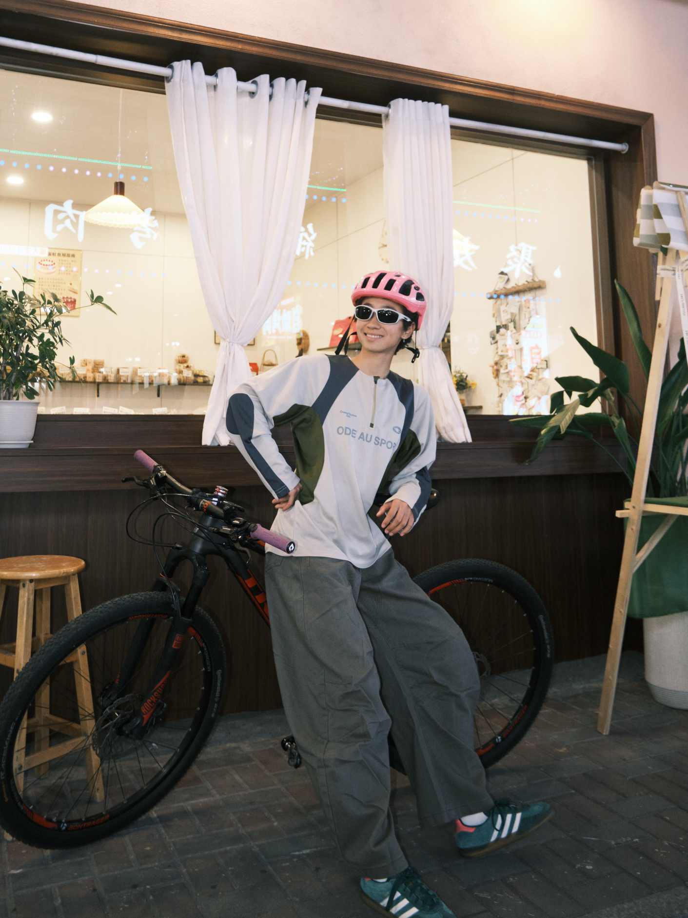 哈喽 欢迎来到哇哇哇穿搭分享频道! 172CM|55KG|👔:M L👖:m|👟:39码 嘟嘟嘟 五一假期出门骑行咯 路过面包小店 补点碳水吧 上身长袖拼接 复古拉满 穿个弯刀裤 配上德训鞋 Gogogo出门玩咯~
