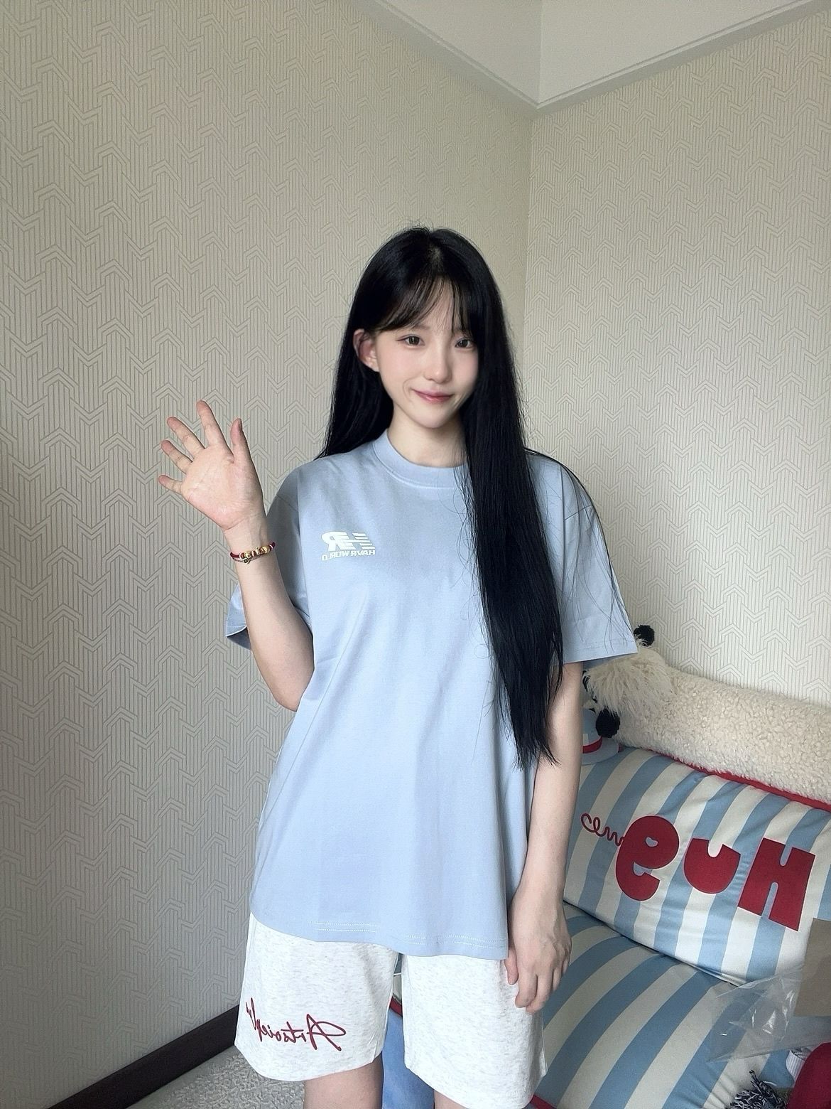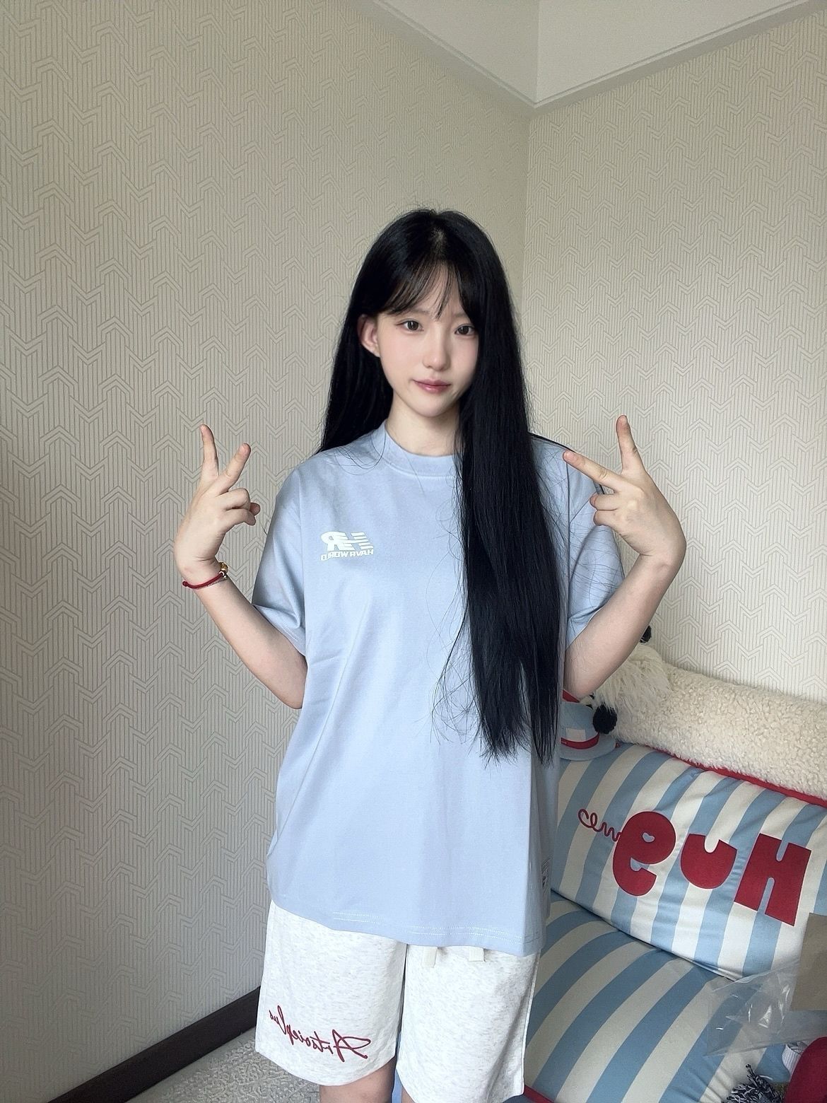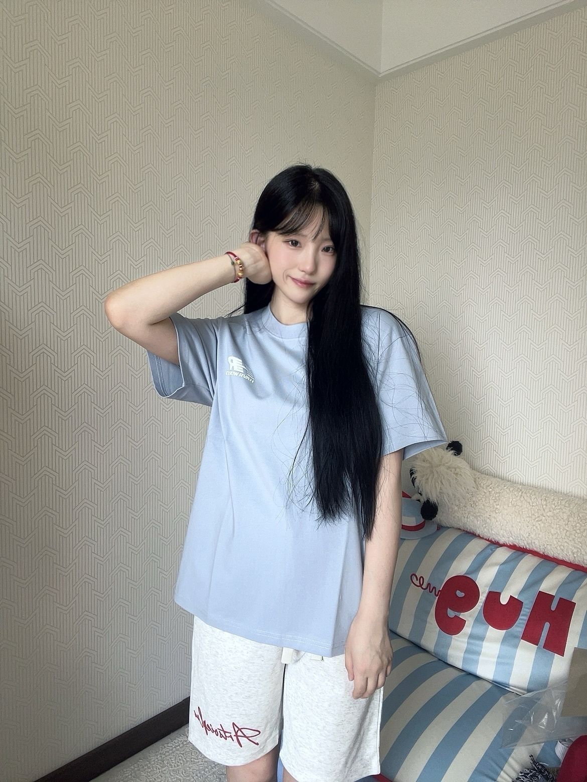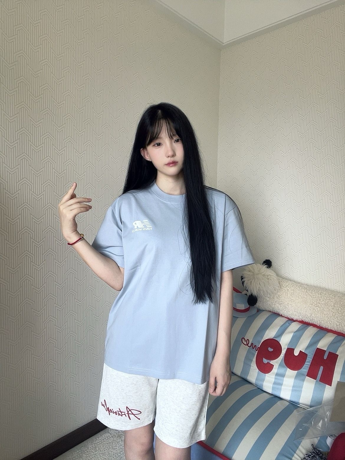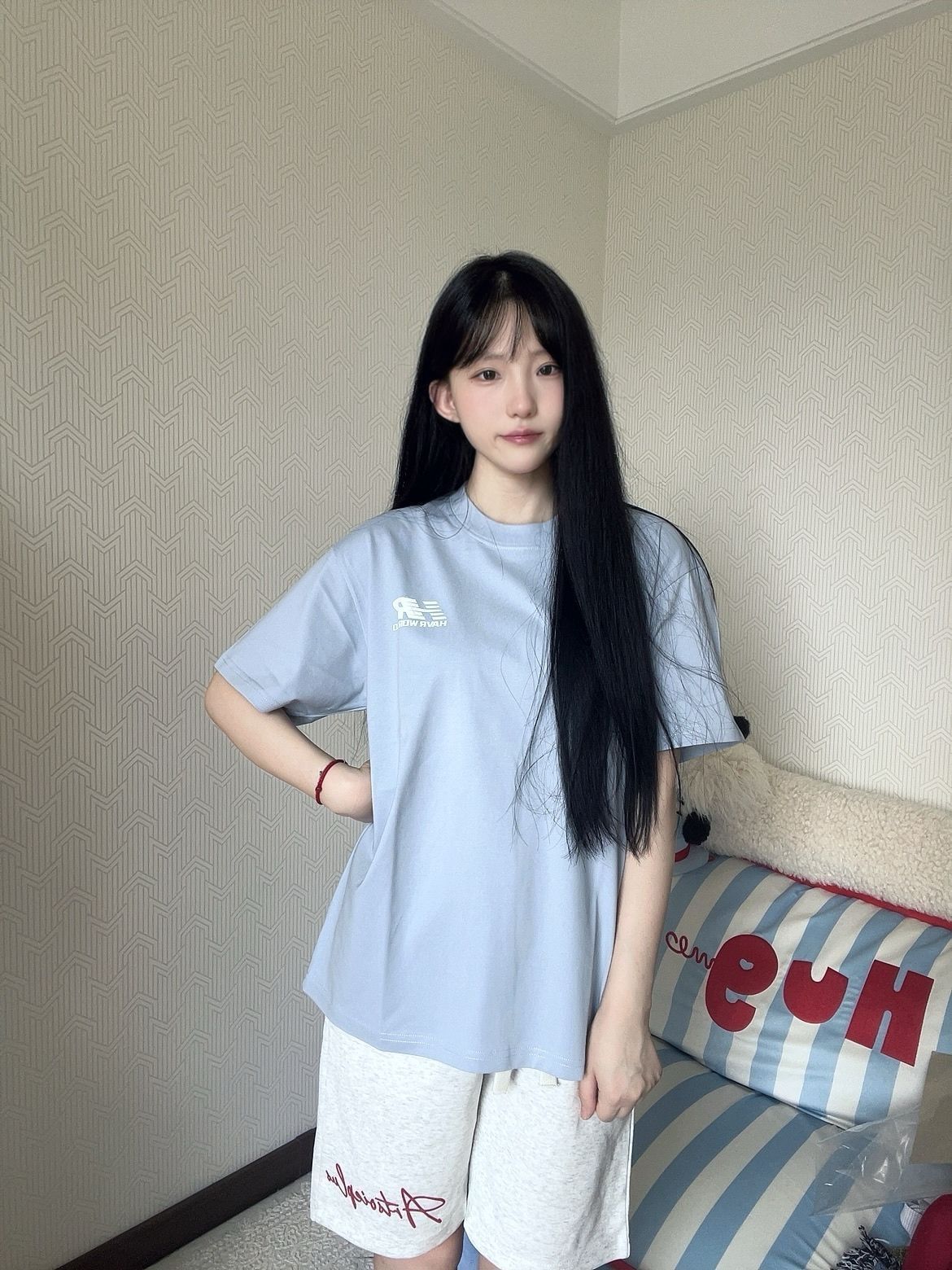 🌈上衣 HAVR 蓝色极简小logoT恤真是清爽的像喝了一口海盐汽水!上身巨巨显白,宽松版型也像纸片人一样显得人薄薄的! 🌈短裤 少宜SOIEPLUS 白灰色的运动短裤带红色小logo不要太好看,让我惊讶的是料子虽然软敷敷的但是一点也不爱皱,好穿爱穿! (图源网络侵删)