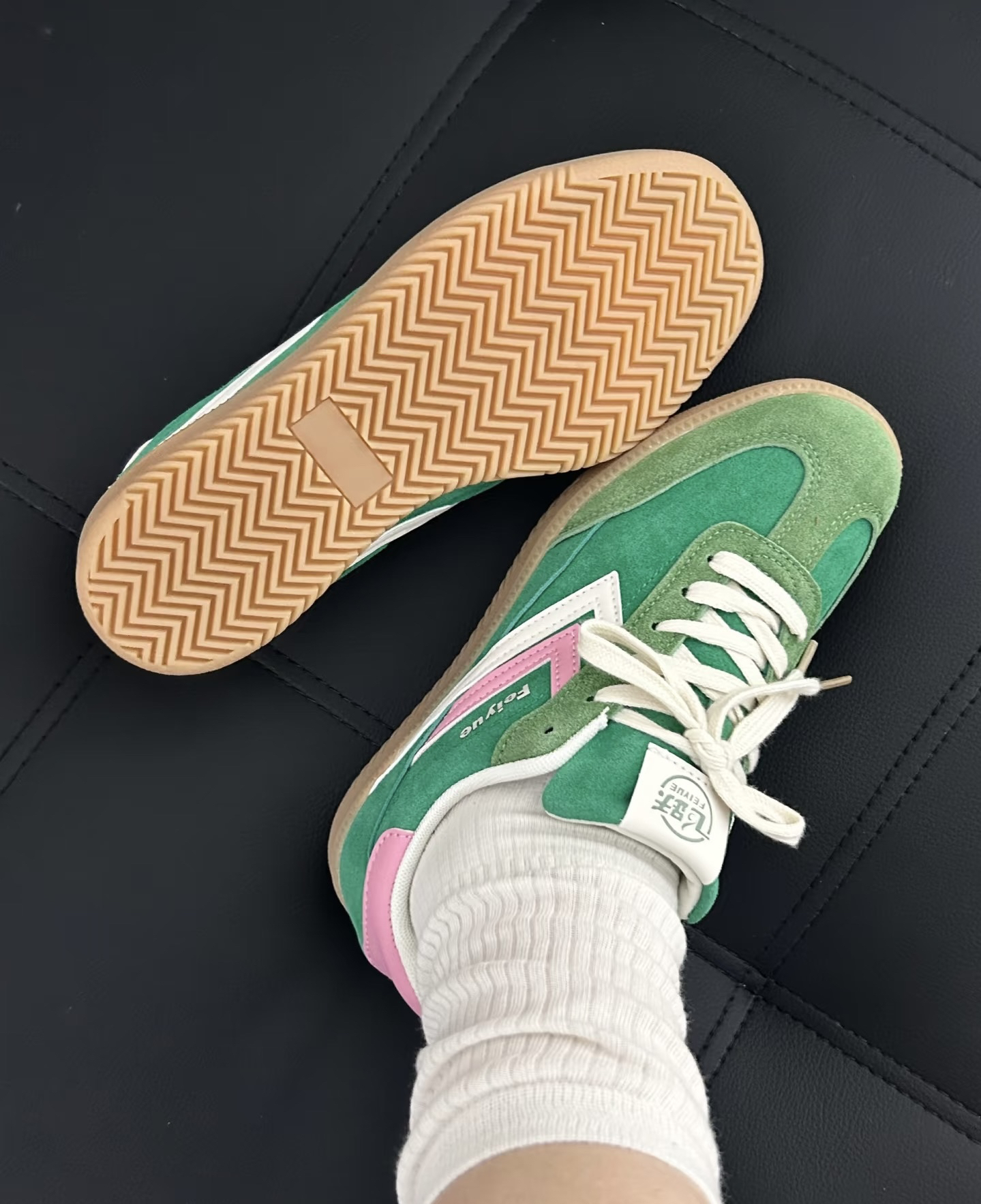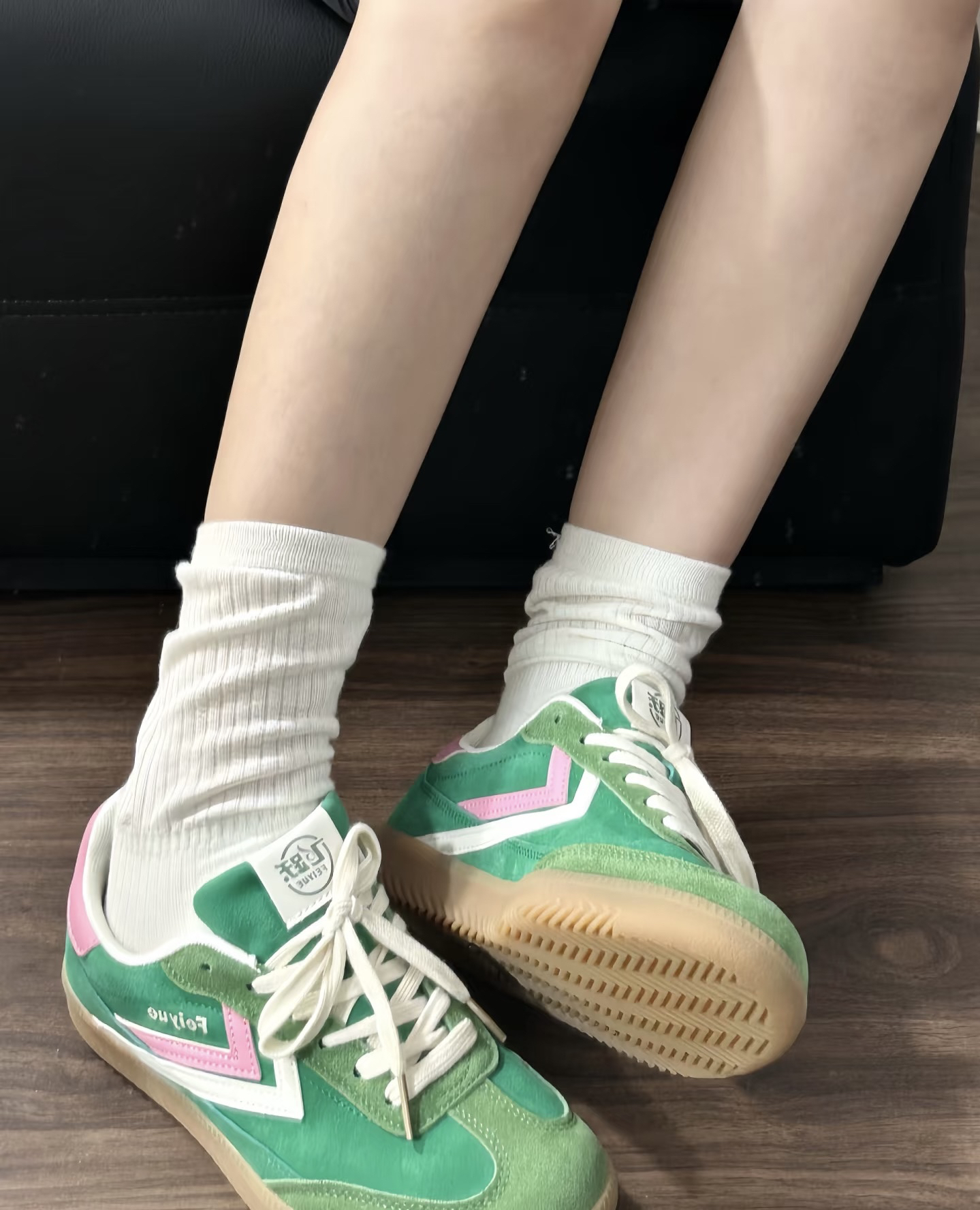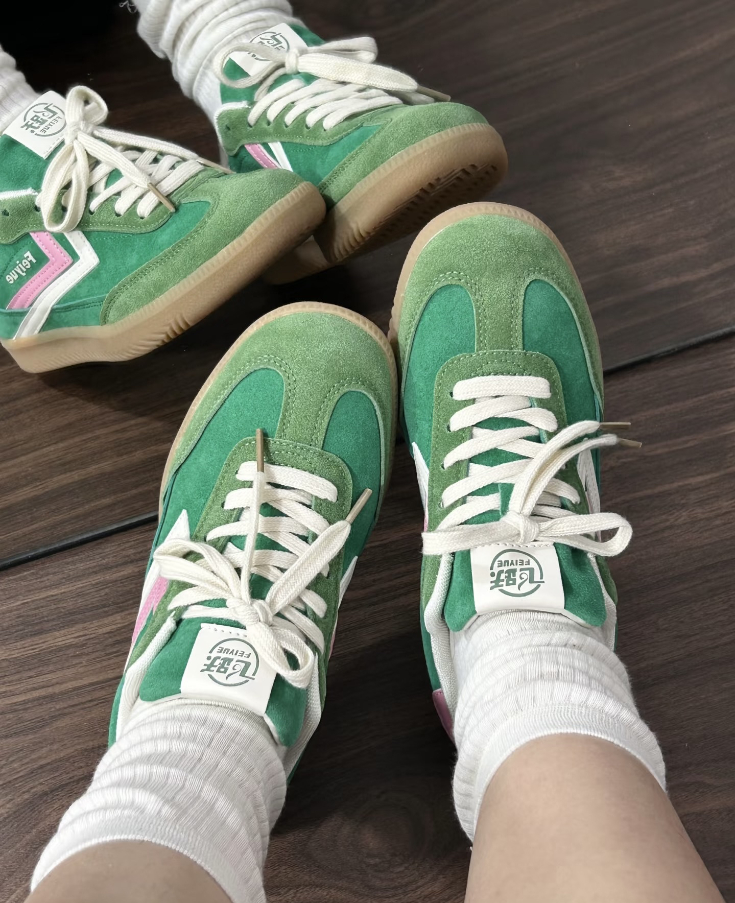 家人们,飞跃这双德训鞋必须安利!绿粉配色超吸睛,复古又时髦,轻松拿捏潮流感。翻毛皮质感棒,做工扎实。鞋垫软弹,走路久了也不累,牛筋底耐用。关键是价格还超亲民,性价比拉满,搭配裤子、裙子都好看,闭眼入不亏!