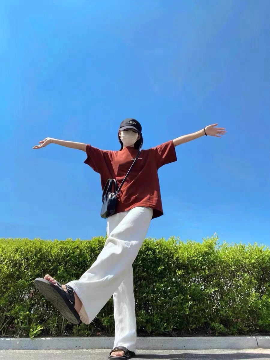 oversize版型,穿上显出另一种慵懒的美感。时尚的圆领显出脖颈线条,简单大方。酒红色T恤怎么穿都吸睛。简洁的大圆领能够很好地修饰肩颈线条,衣身上的英文字母点缀的个性不单调~能轻松不费力的穿出时髦感,真的让人无法拒绝。 (图片来自网络,侵删)