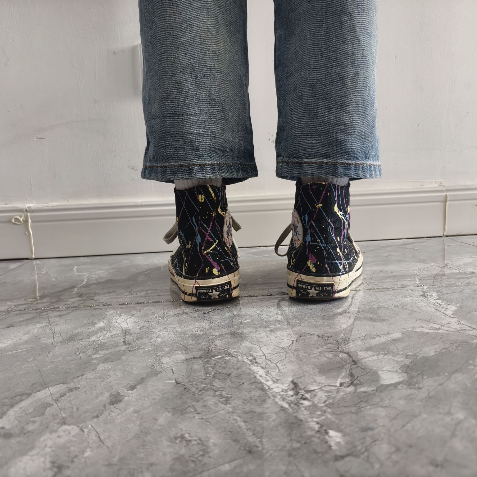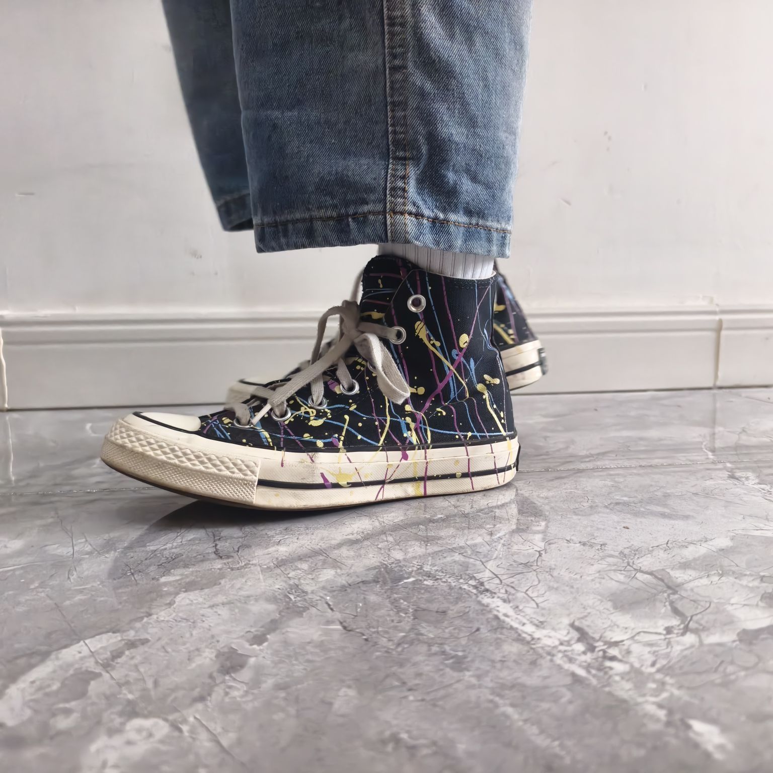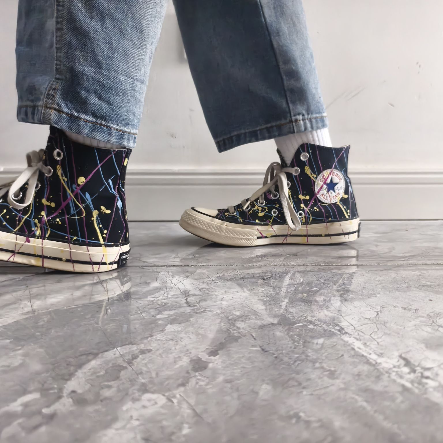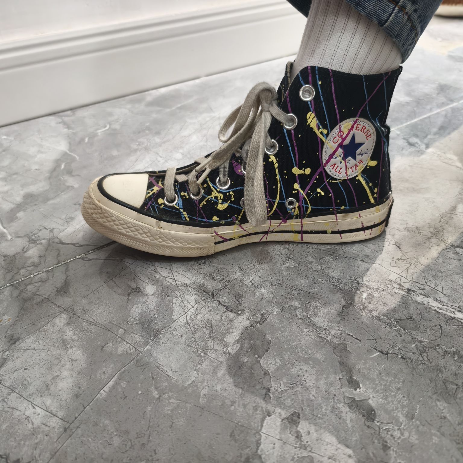 这双鞋也属于我的第一双匡威,本来以为穿着时间久了,磨损比较严重,拍出来效果会不好,没想到还是可以出片的 匡威1970的版型没得说,还是比较经典,这双基础的黑白配色加上五彩斑斓的泼墨,经典中带有特点,最主要还比较耐脏 穿搭方面,匡威1970无疑是百搭的只是比较季节限定,鞋面的材质,使其更适合秋冬,部分地区较凉爽的夏季也可以上脚,个人比较喜欢用它搭阔腿牛仔裤或者浅色五分裤 性能方面,标准的1970鞋底...