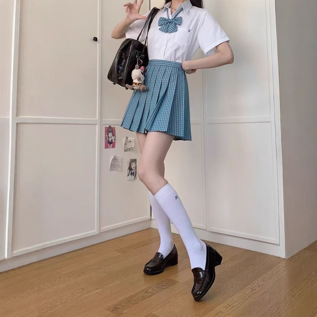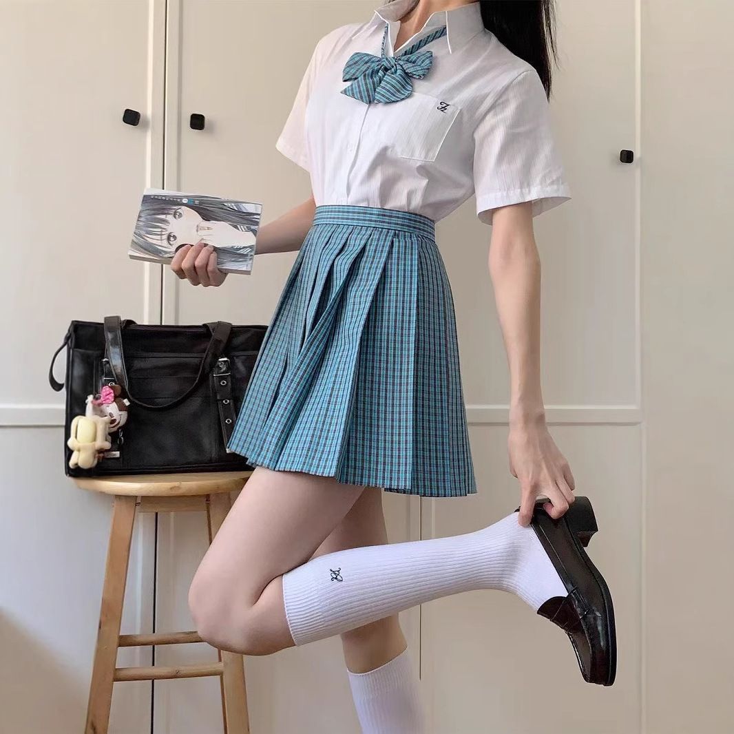 救命!这套学院风穿搭直接美到心巴上! 姐妹们!挖到宝了!这套原创JK制服短袖衬衫+松蓝格裙套装,简直是为这个夏天量身定制的氧气少女穿搭模板!穿上直接变身校园剧女主,出片率100%! 👚 奶油白衬衫:选用超透气的冰感面料,37℃高温穿也不闷汗!立体剪裁的小尖领自带直角肩buff,胸前的暗扣设计超贴心,抬手弯腰都不怕走光~珍珠纽扣点缀,精致感直接拉满! 👗 松蓝格裙:经典校供感配色太绝了!...