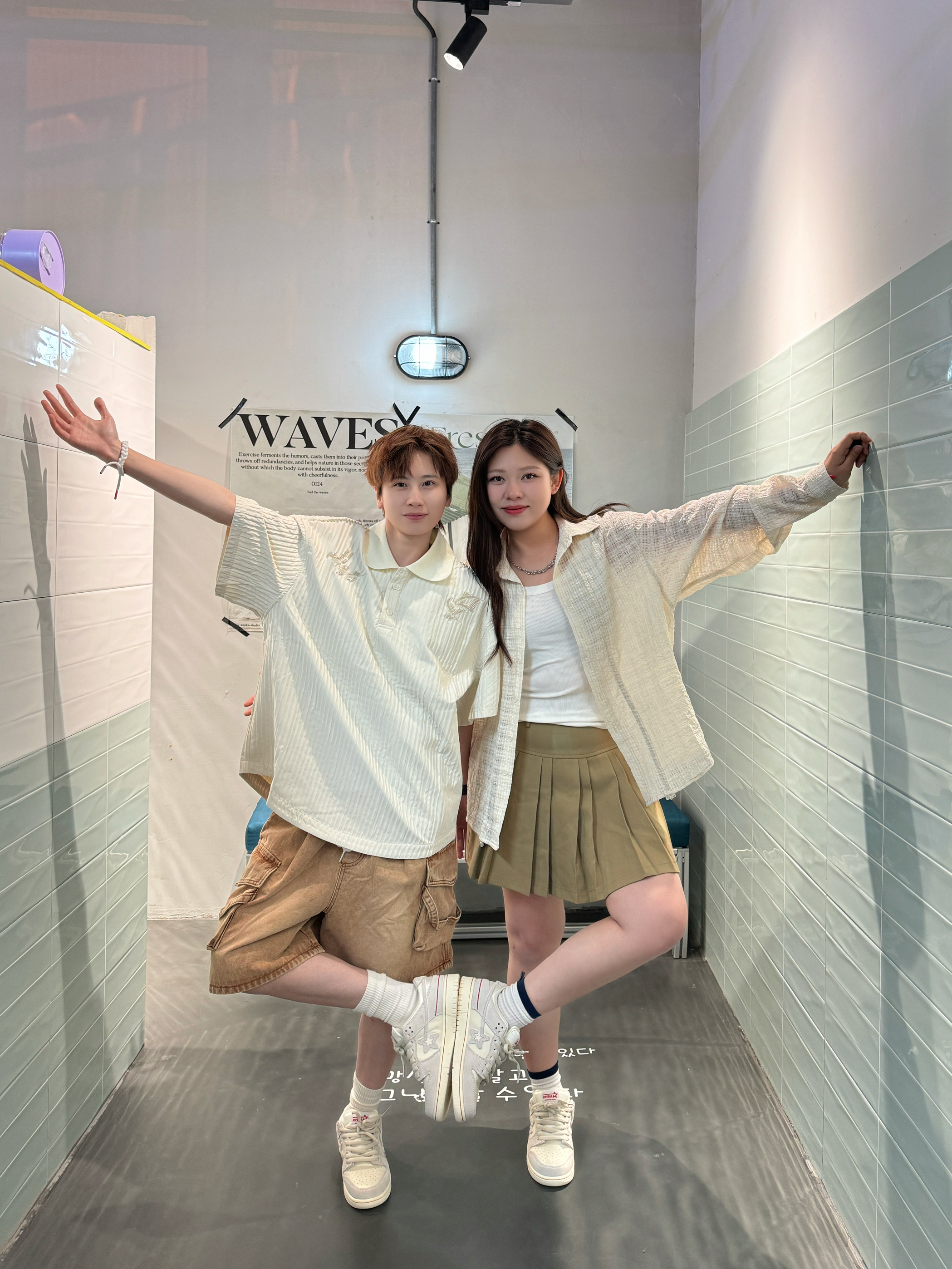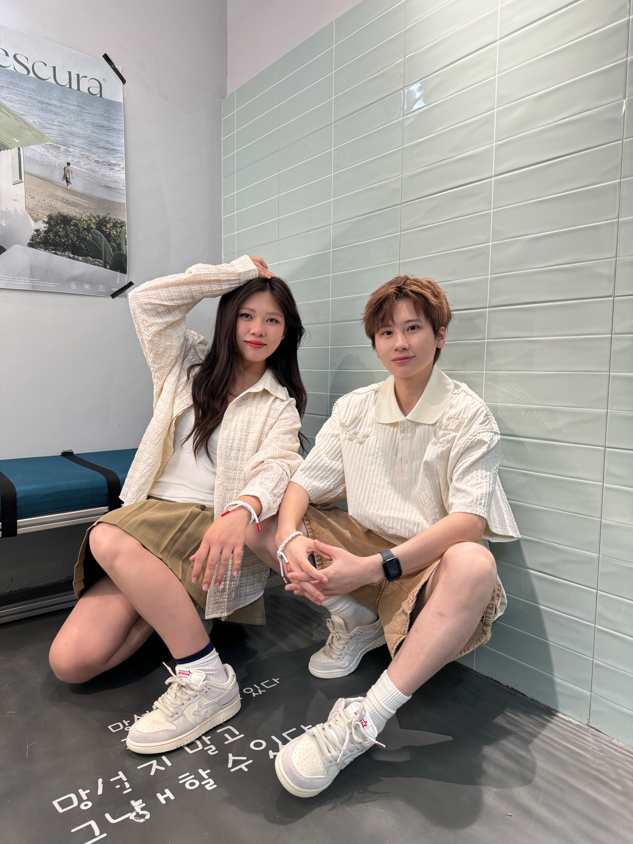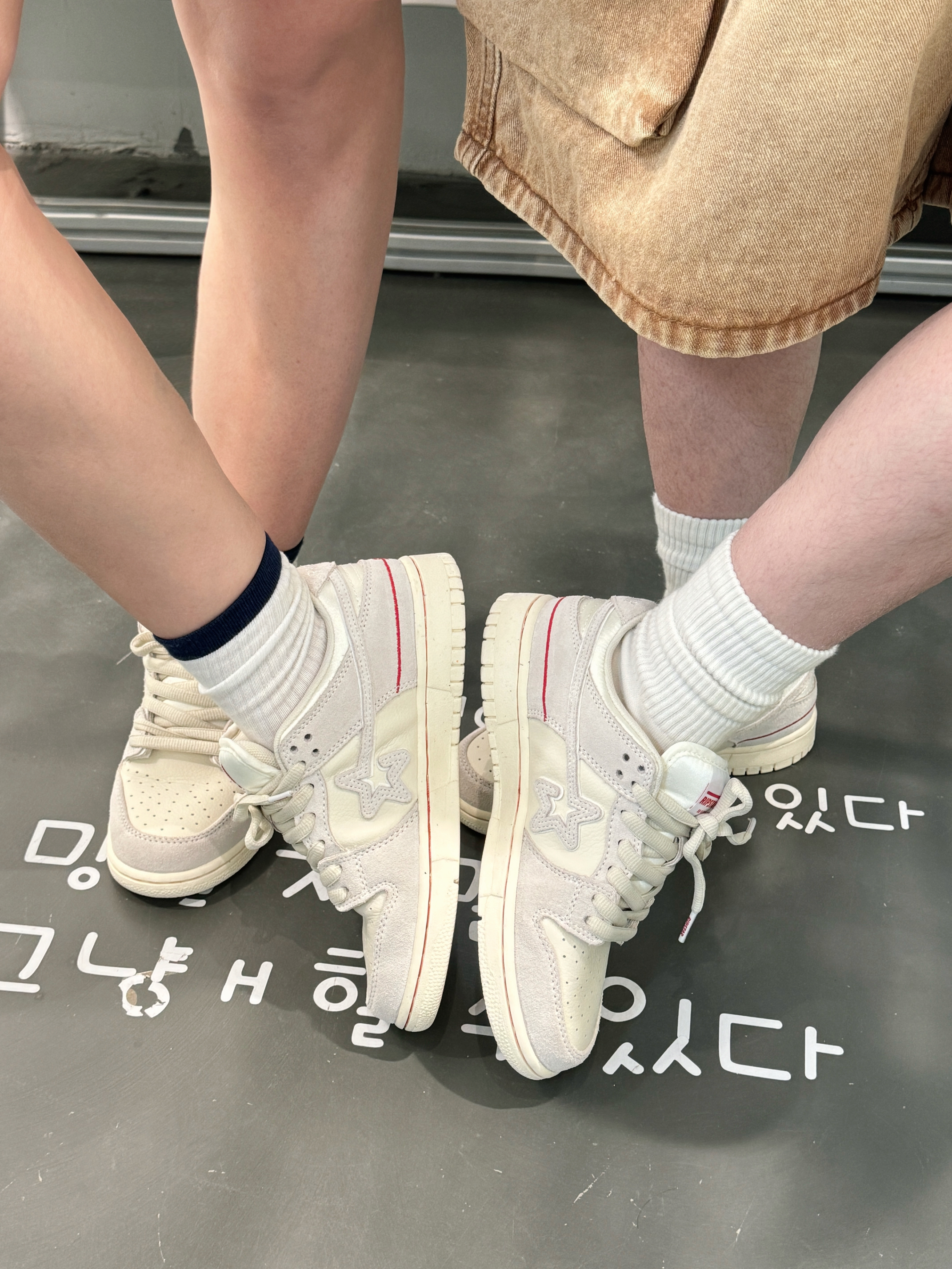 简单的配色也能穿出ins感 🧏🏻:米色POLO衫➕棕色工装裤 🧏🏻♀️:白色吊带叠穿米色长袖衬衫➕棕色百褶裙 鞋子搭配了同款板鞋 米灰配色夏天穿很百搭 侧面加了红色的线条,增加了点活力 厚鞋舌,上脚的包裹感也比较舒服 小tips:衣服用同色系搭配法,也能穿出默契感