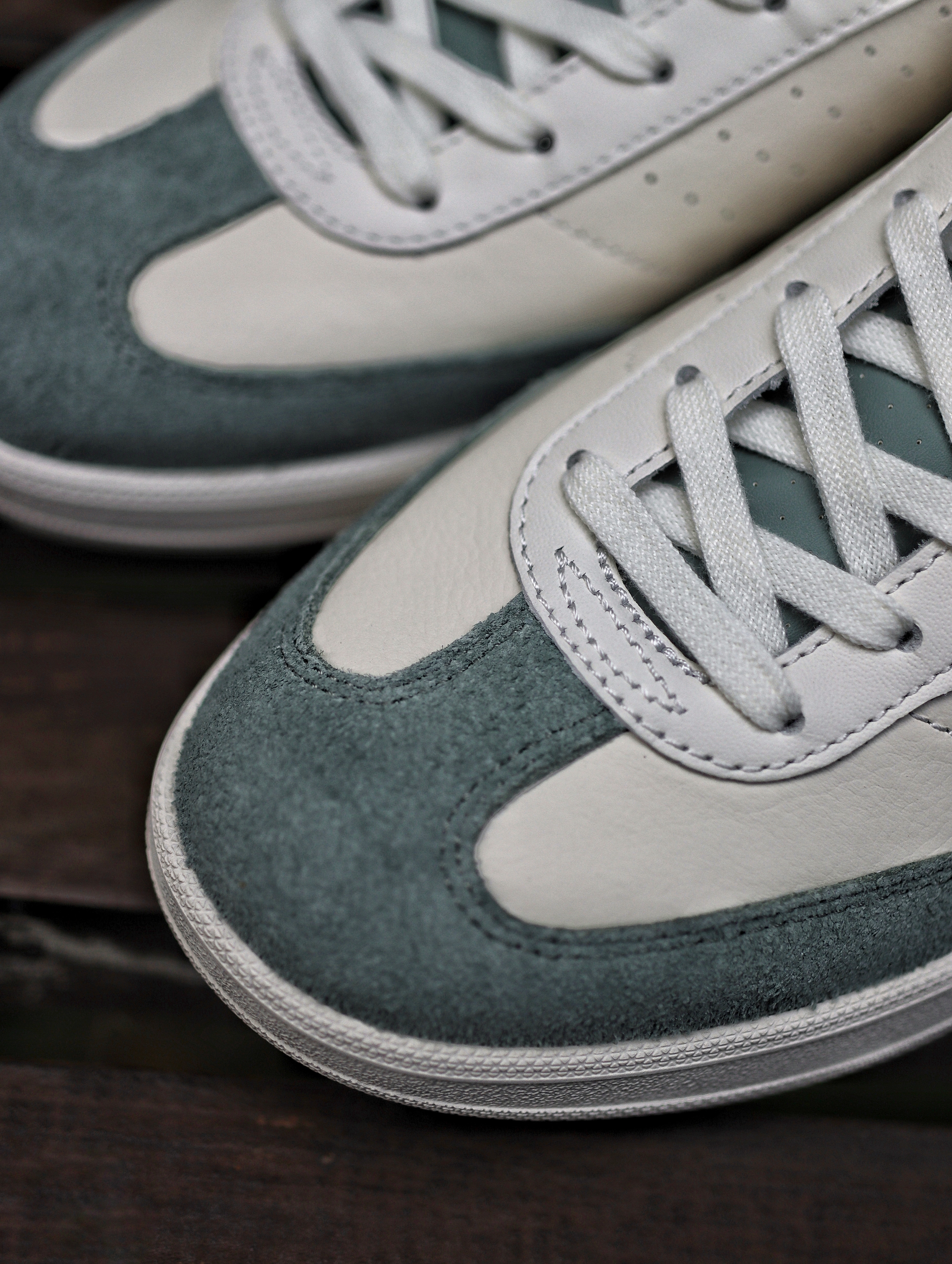 - 出门玩一双舒适又百搭的鞋子当然少不了,这双迪桑特的白绿板鞋我觉得还是一个不错选择。 - 白绿配色刚好也是百搭简约配色,加上经典的板鞋外观,日常搭配可以选择浅色系的短裤都是不错的选择,慵懒感满分💯。 - 唯一要注意的一点就是鞋子鞋头是翻毛皮材质,下雨天最好别去穿,尺码的话可以按照正常尺码去选择都是可以的。