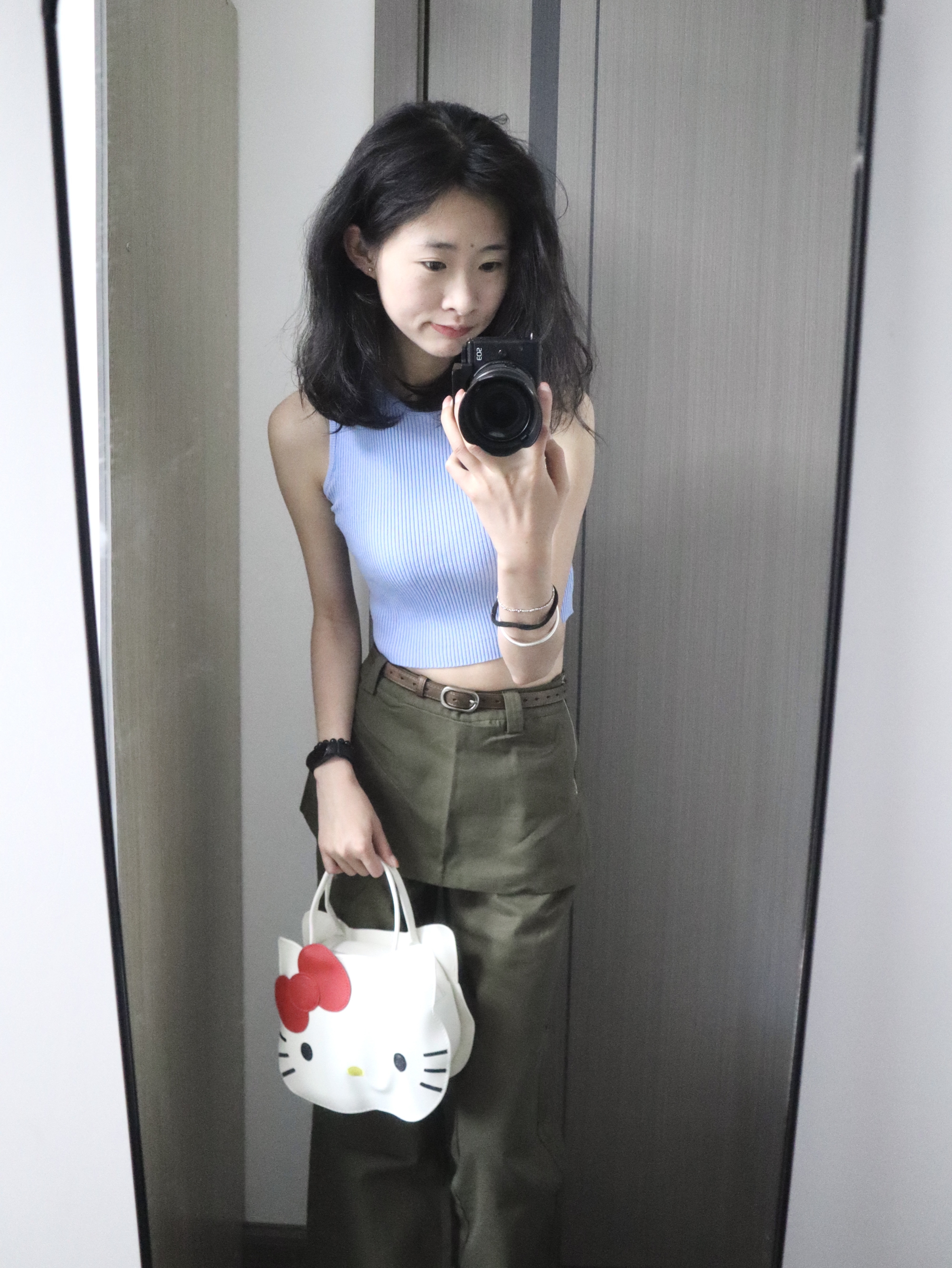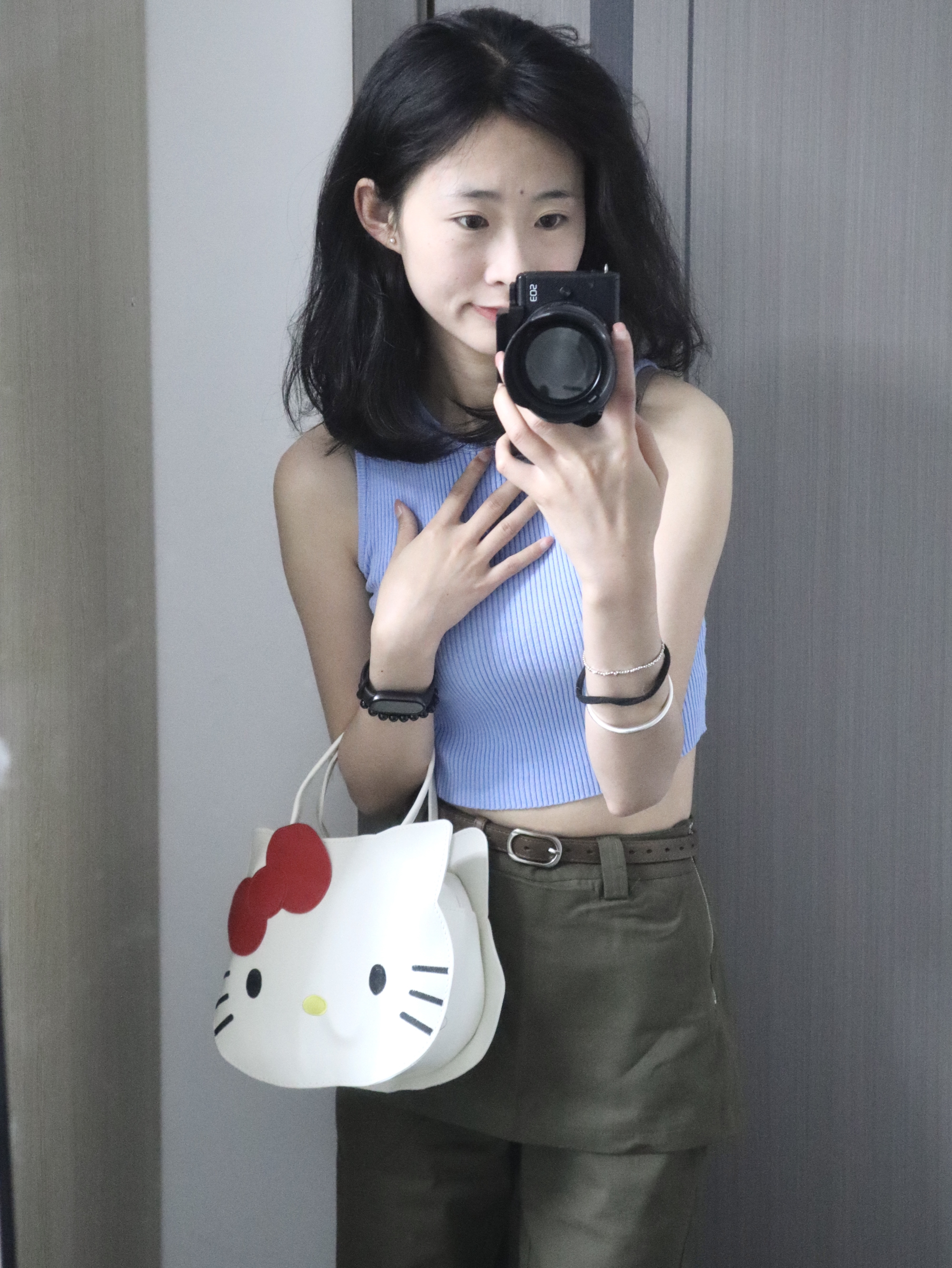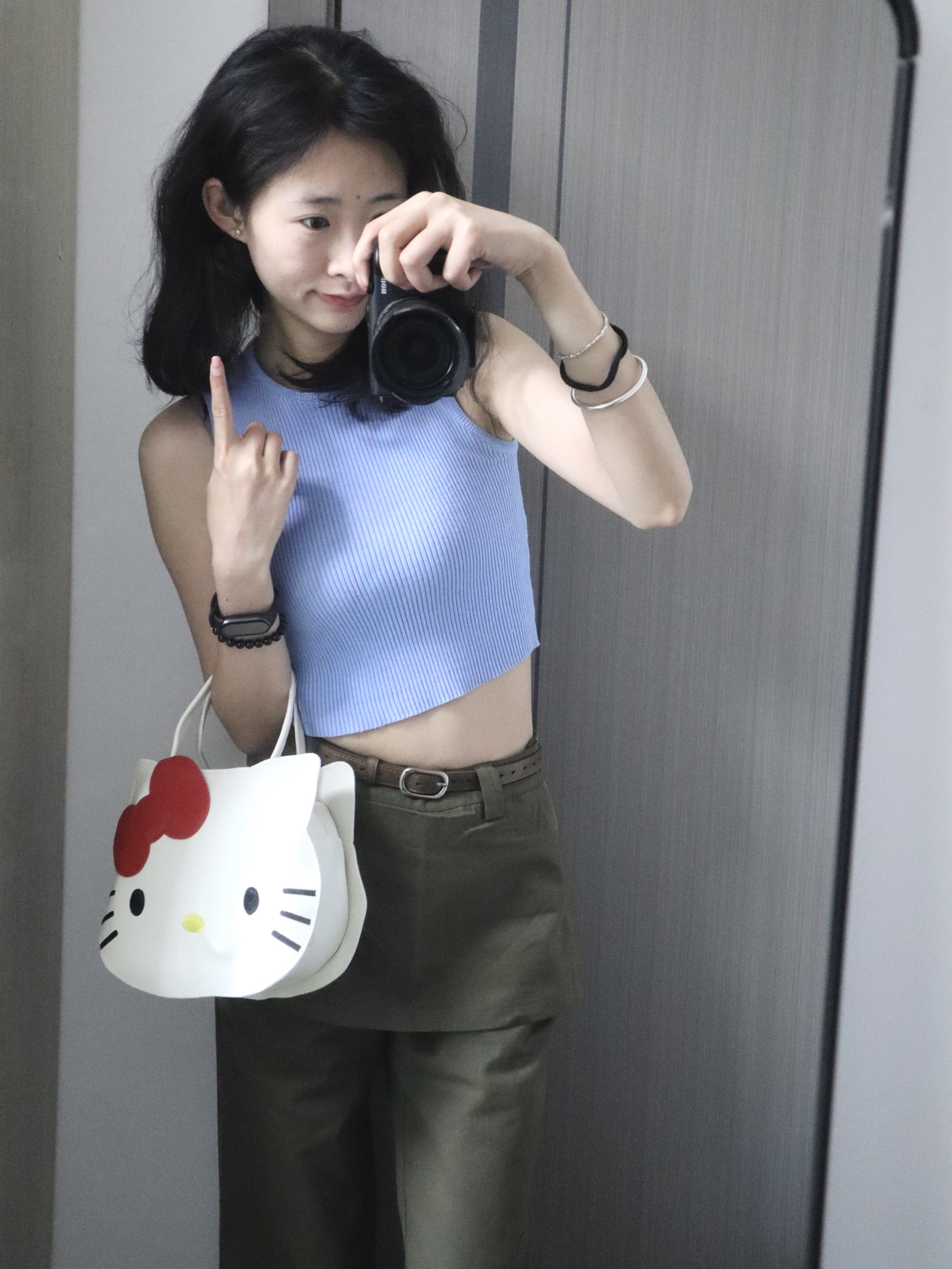 身高|体重:170/48 🧍♂️ 穿搭风格:简约可爱 👔 上衣:蓝色背心🎽 👖 下装:绿色屁帘长裤 👟 鞋子:特步德训鞋 🎒配饰:Kitty猫