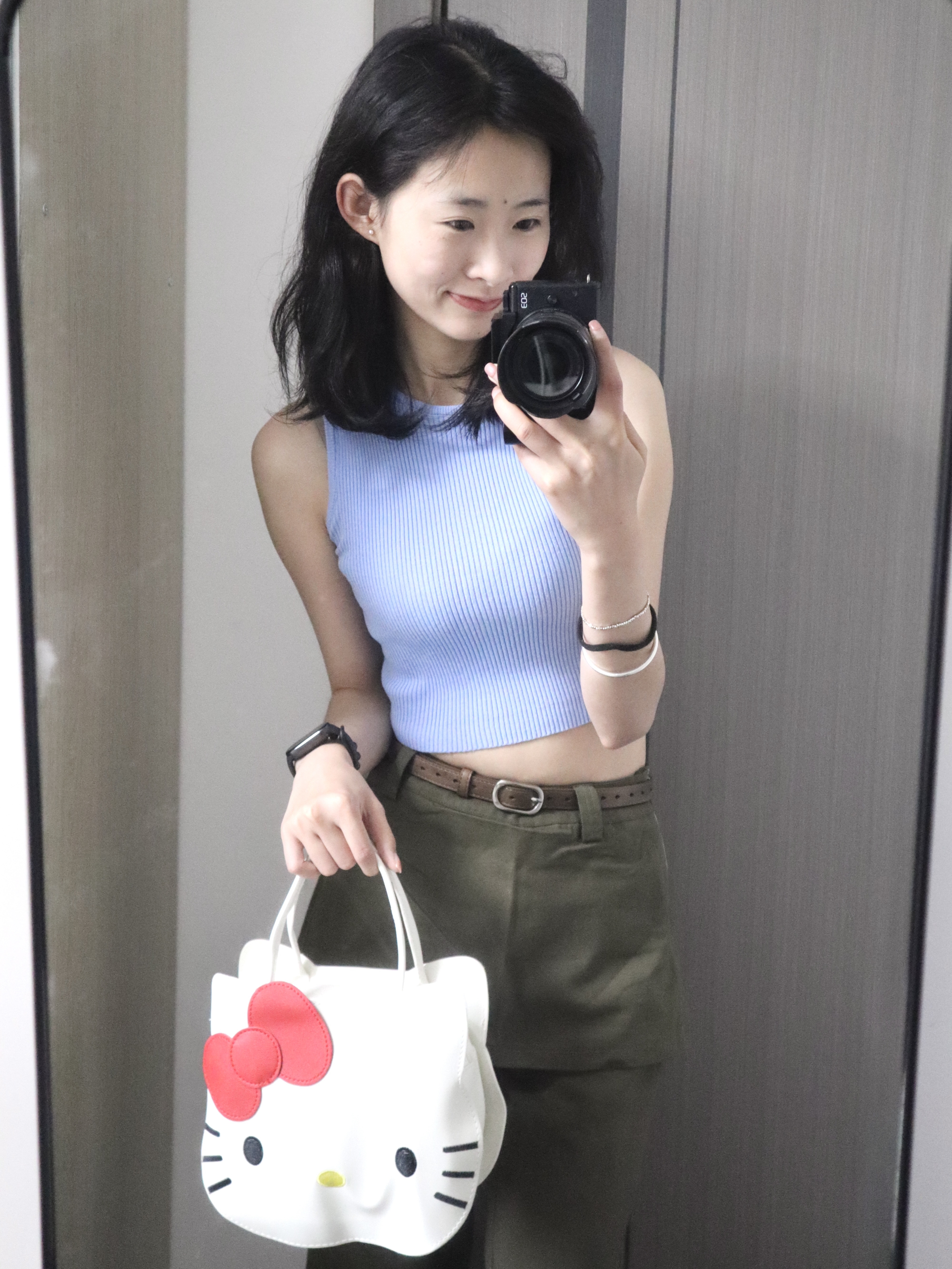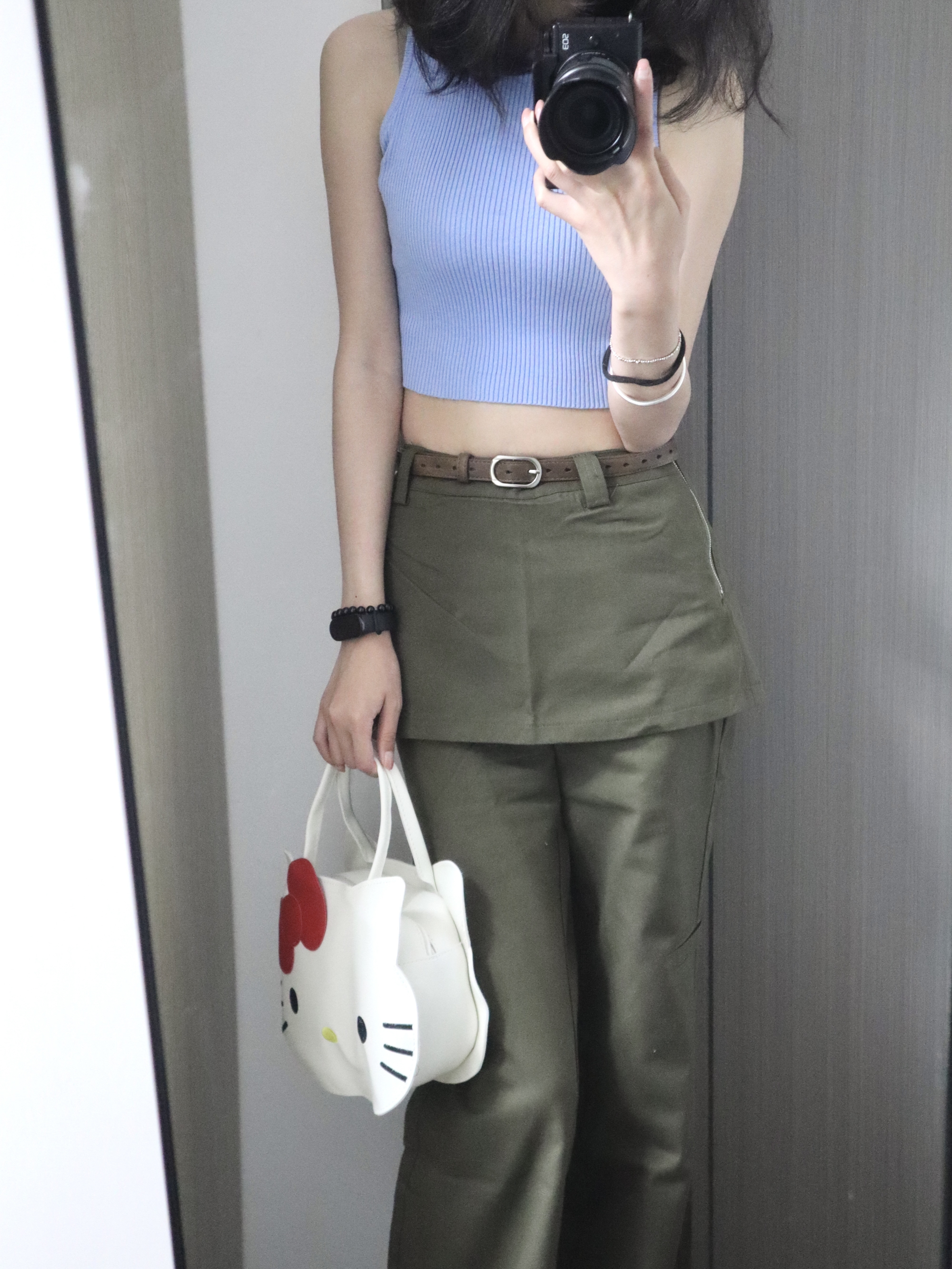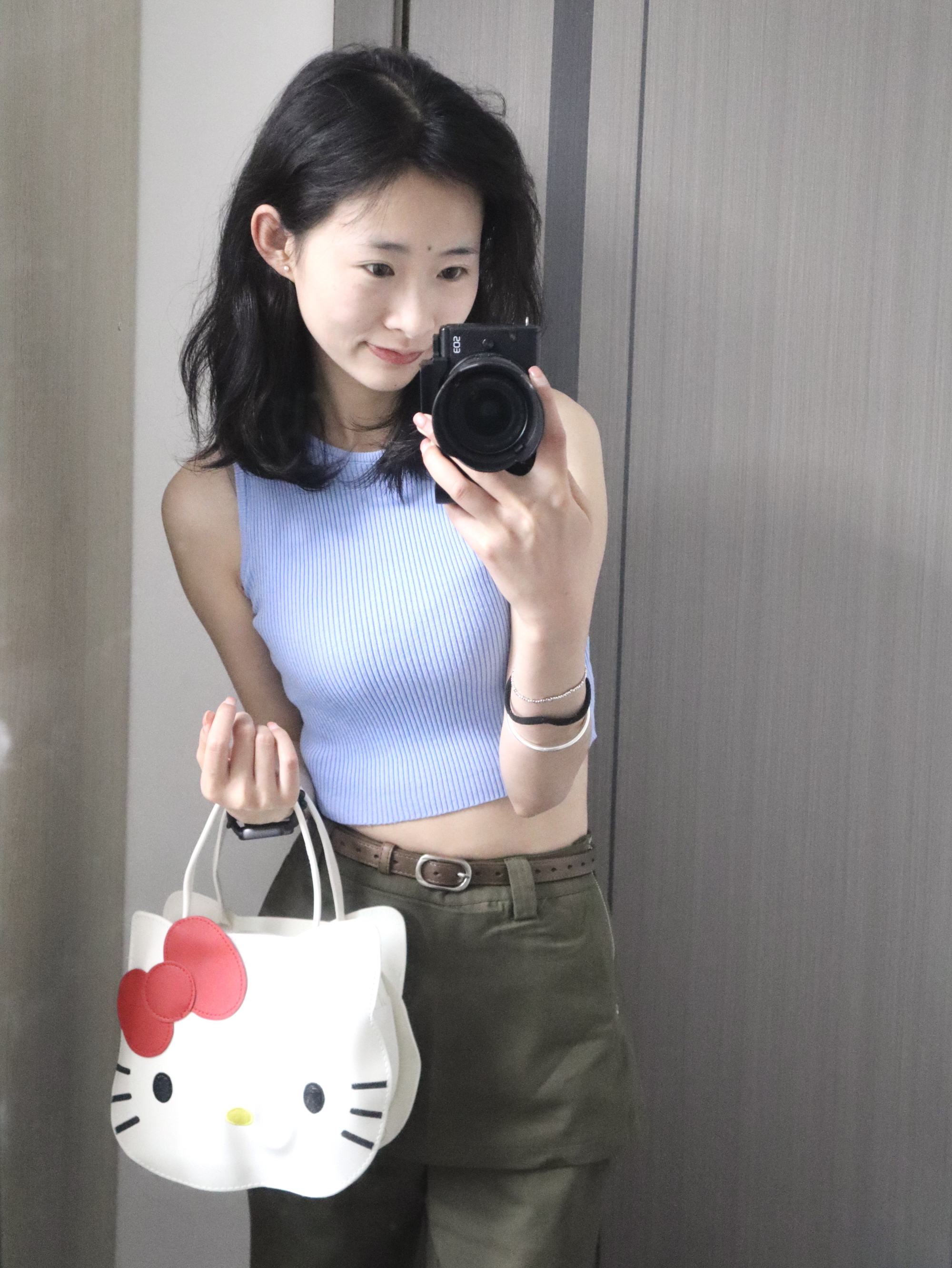 身高|体重:170/48 🧍♂️ 穿搭风格:简约可爱 👔 上衣:蓝色背心🎽 👖 下装:绿色屁帘长裤 👟 鞋子:特步德训鞋 🎒配饰:Kitty猫
