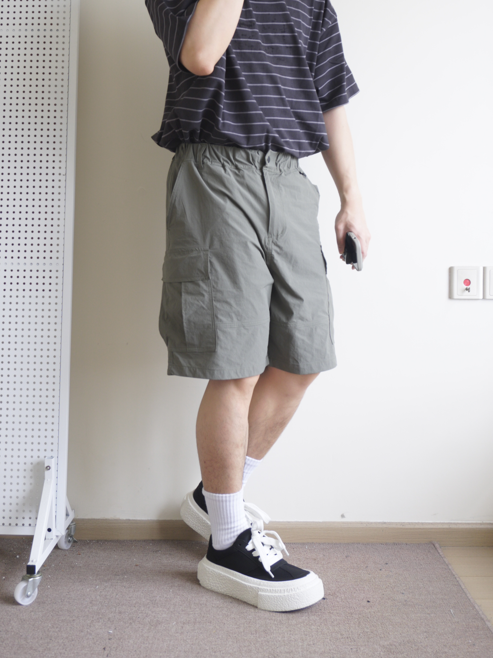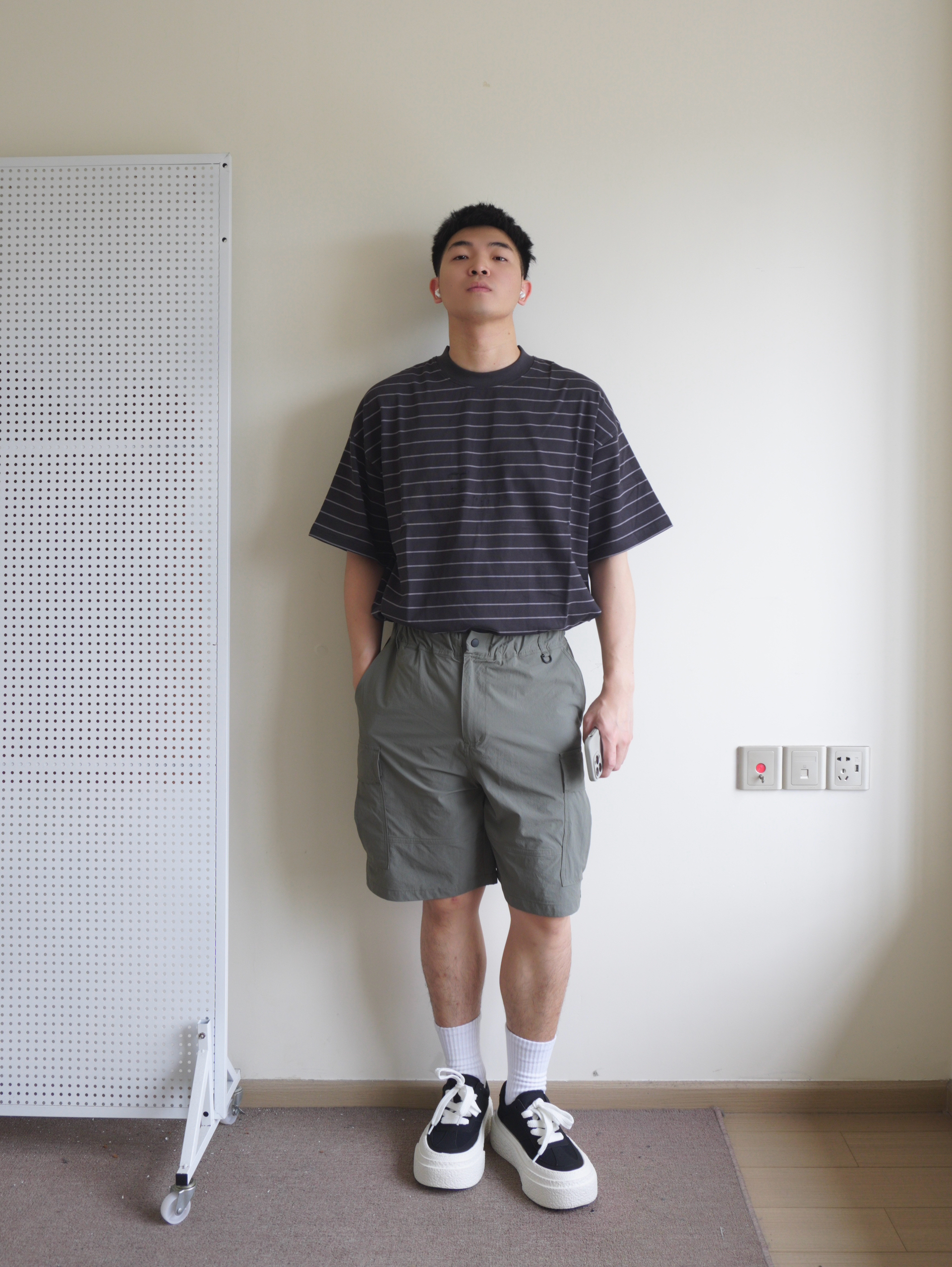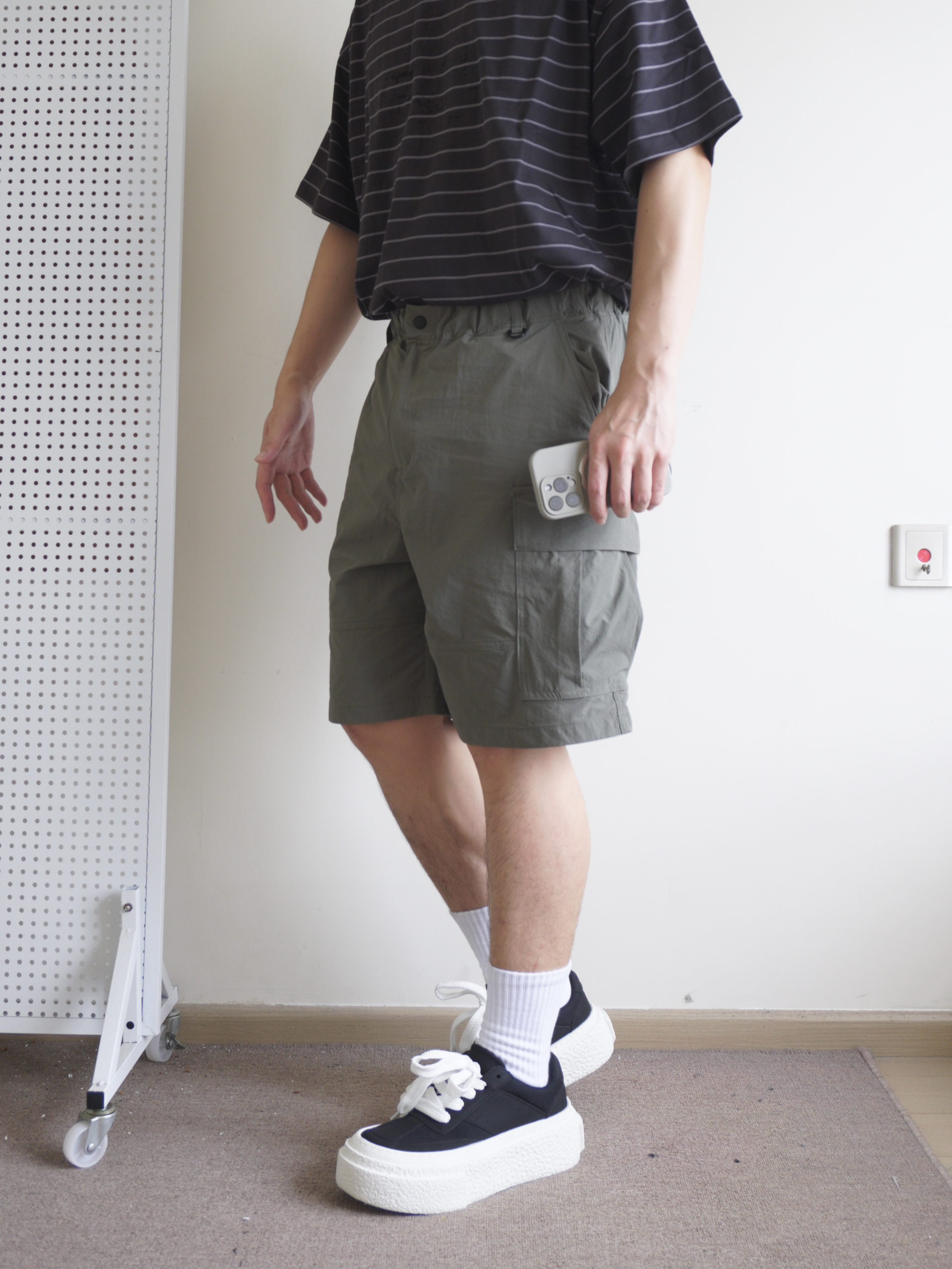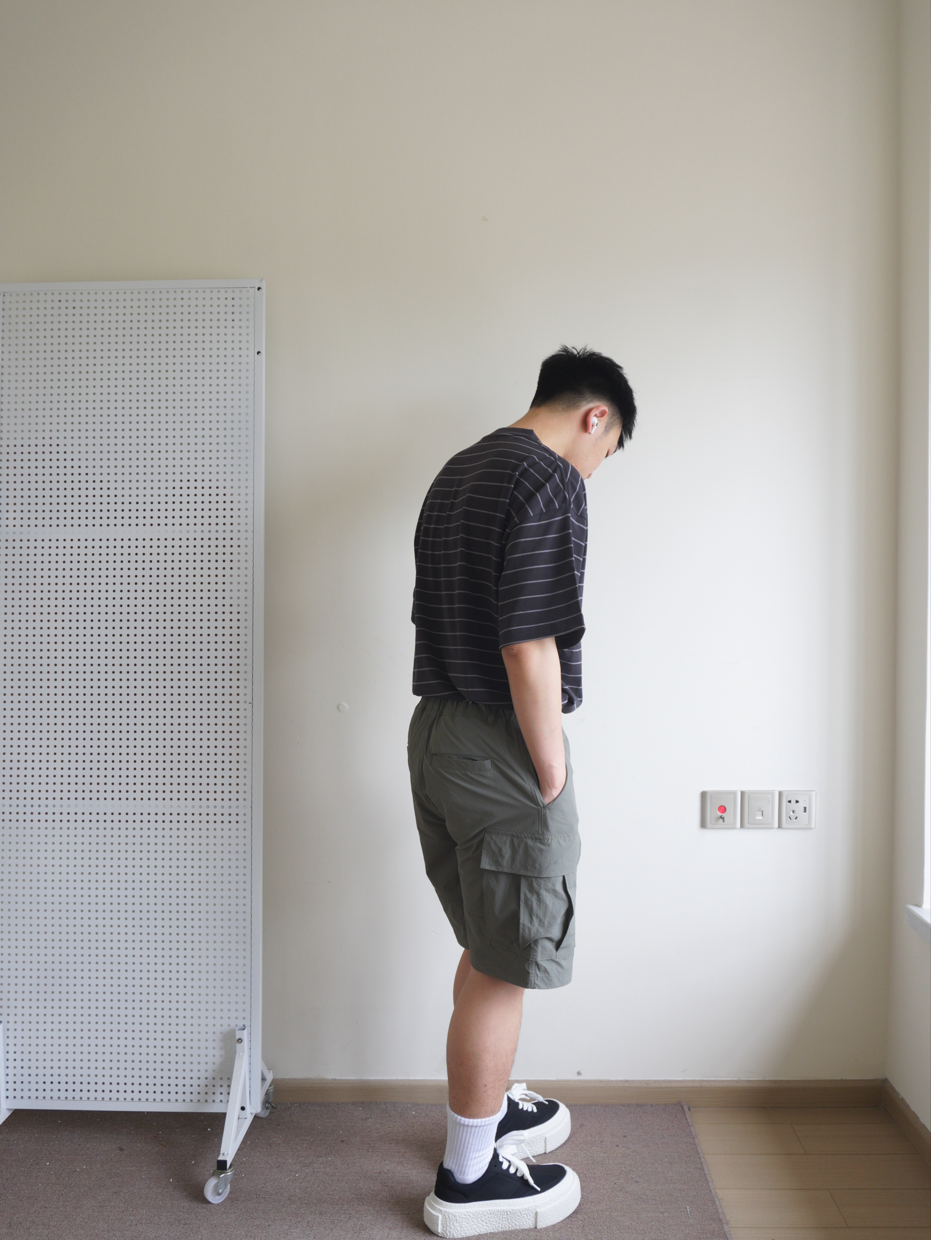 越来越热的天气,今天休闲日系风 一件夏季离不开的细条纹短袖,黑色系条纹不怎么挑人 搭配一条军绿色多袋工装裤,面料轻薄透气,夏季无负担穿着 搭配一双黑白厚底板鞋呼应一下上衣
