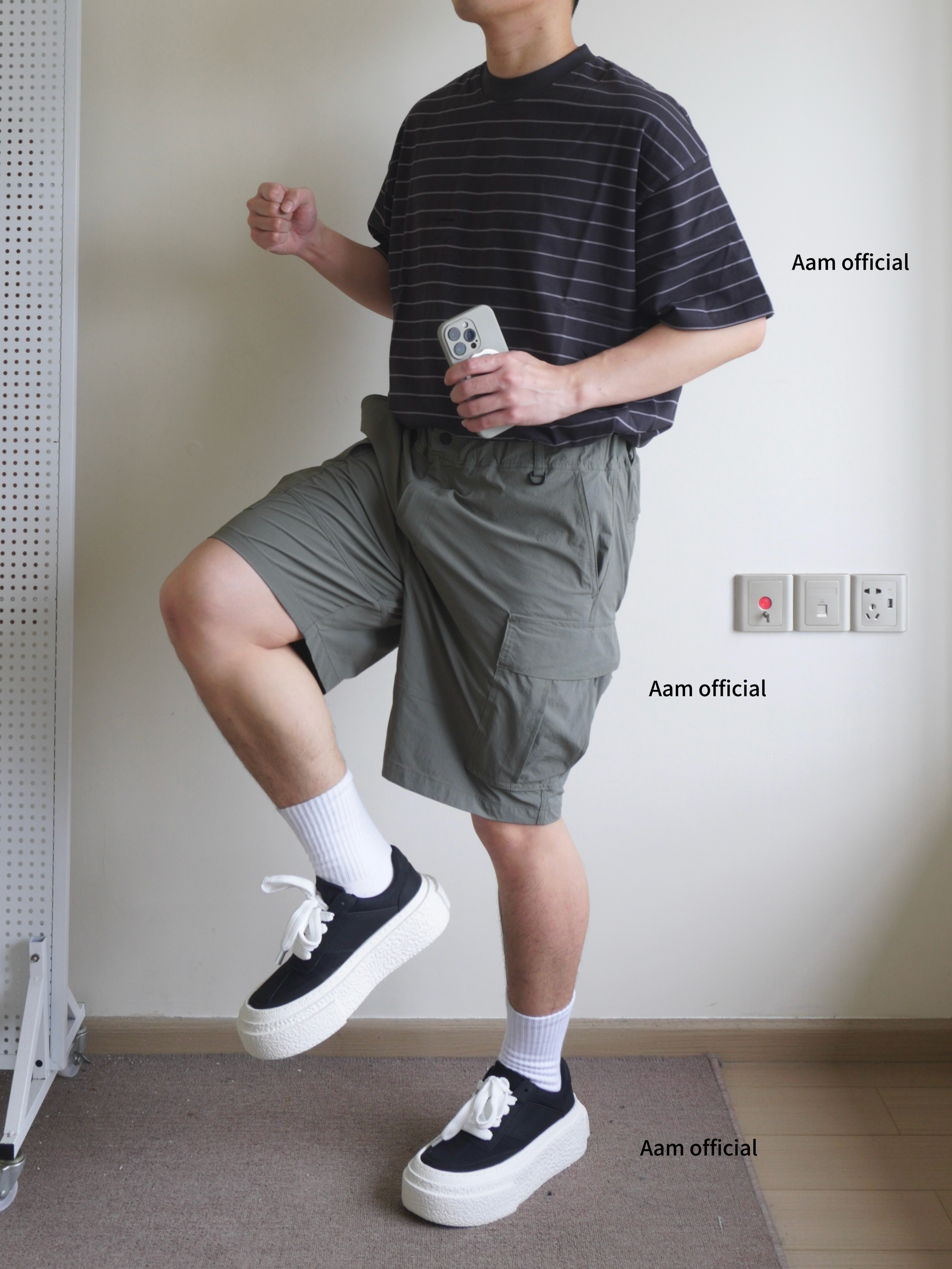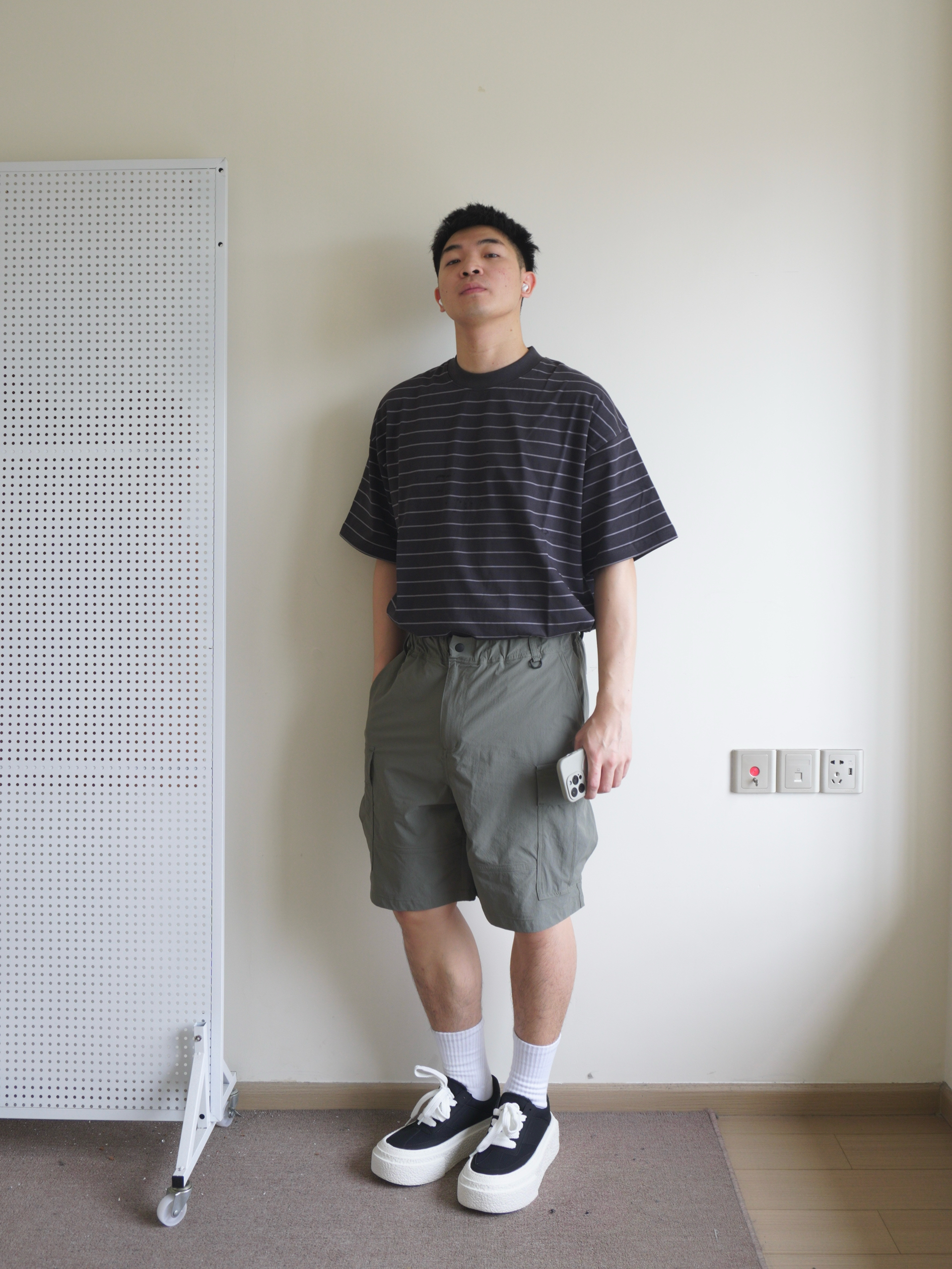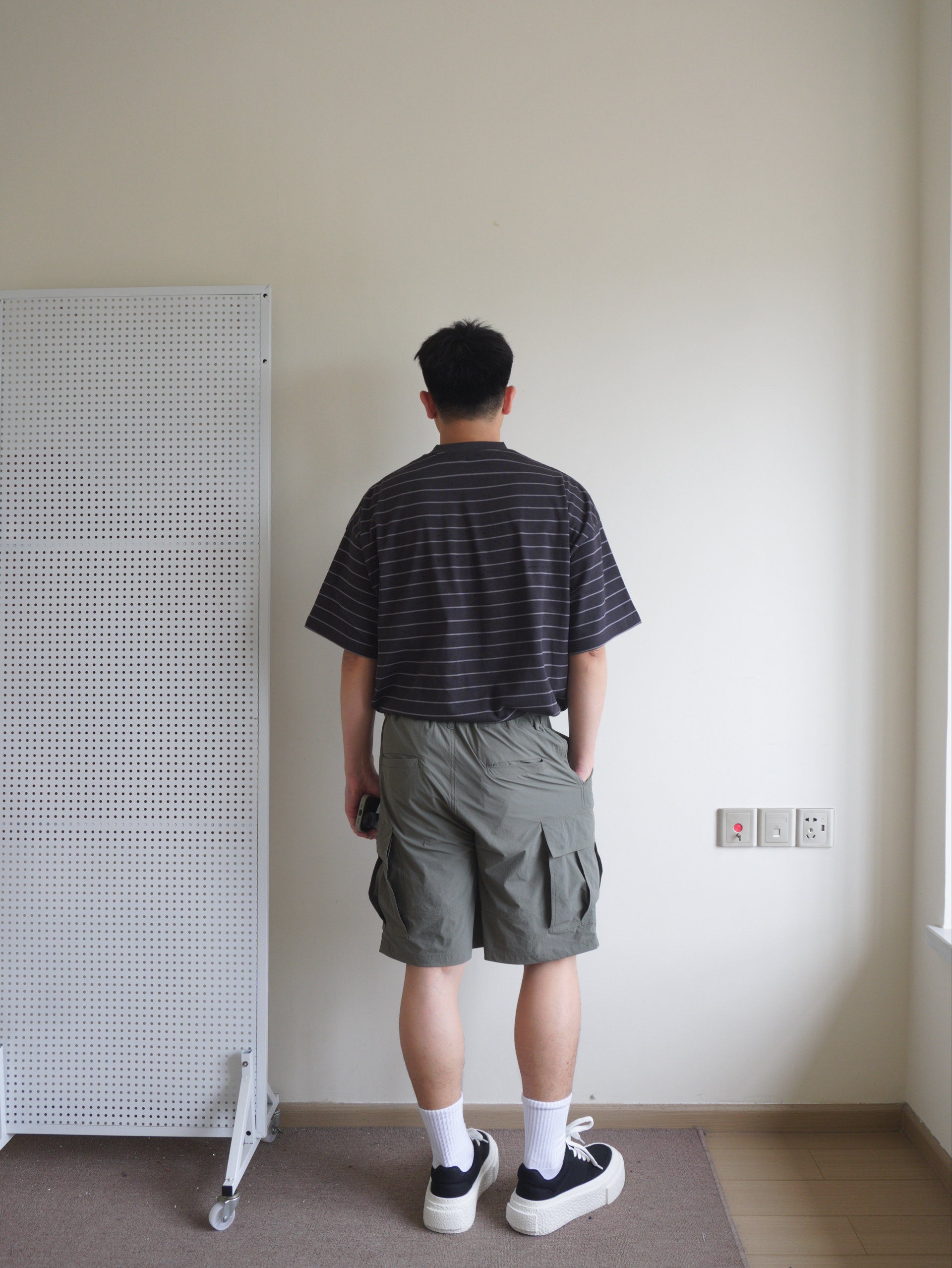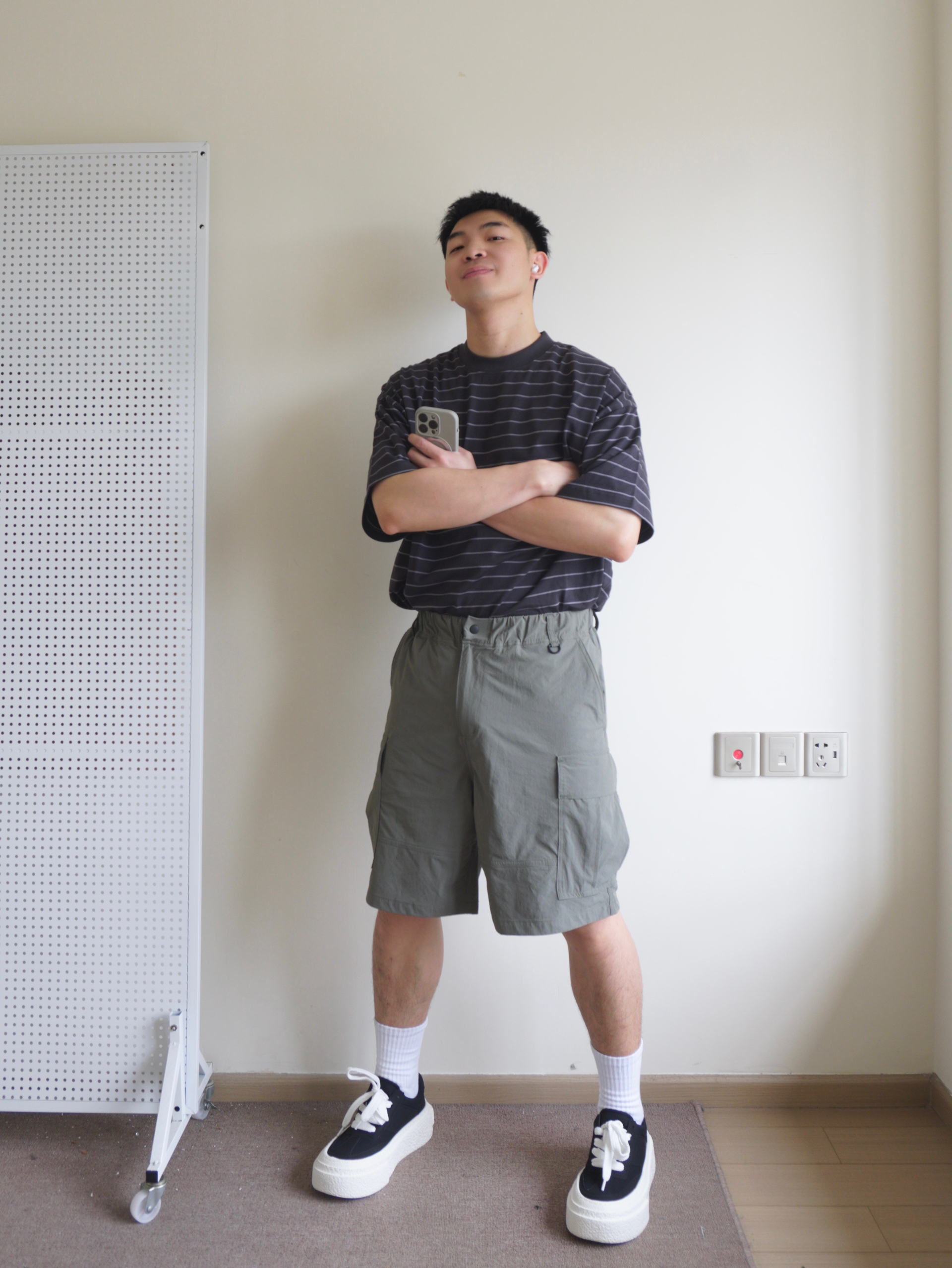 越来越热的天气,今天休闲日系风 一件夏季离不开的细条纹短袖,黑色系条纹不怎么挑人 搭配一条军绿色多袋工装裤,面料轻薄透气,夏季无负担穿着 搭配一双黑白厚底板鞋呼应一下上衣