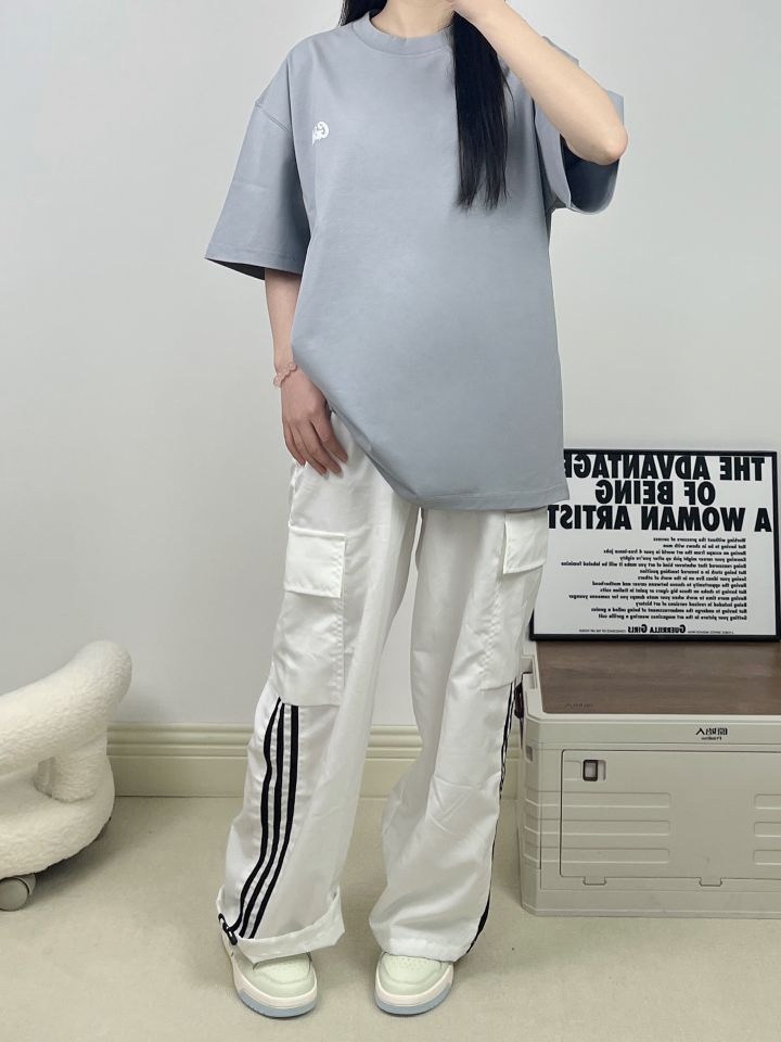 误入莫兰迪色系~雾霾蓝雀氏温柔今年和这种干净色系锁住了! 上身高级感满满 🤗面料挺括不会皱皱巴巴的 圆领Oversize版型更加休闲 搭配白色条纹工装休闲裤 适配度💯