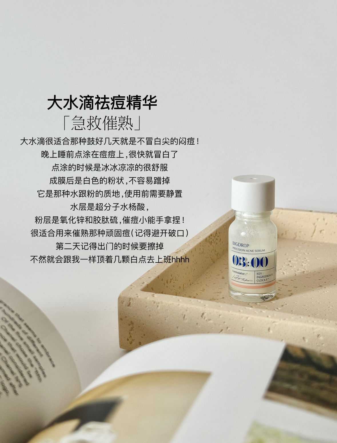 本篇笔记关联了SKINCEUTICALS/修丽可 色修亮妍精华 修护补水保湿舒缓泛红淡痘印 修红提亮、BIG DROP/大水滴 3点美白精准快速祛痘精华液 淡红印救急加速净痘去闭口淡印 2.0、可复美 稀有人参皂苷致研日夜双修点痘精华液 修护舒缓 舒缓等商品,为用户提供真实的使用体验和购买参考。