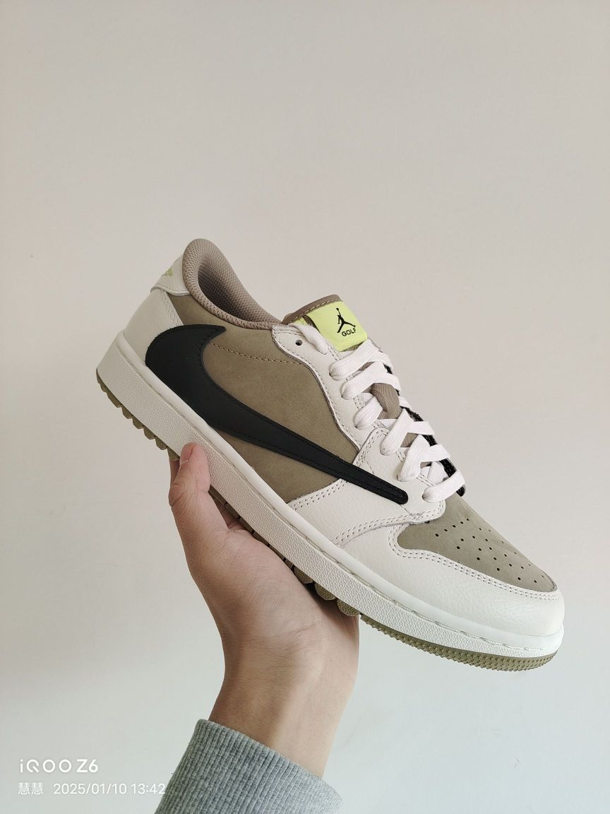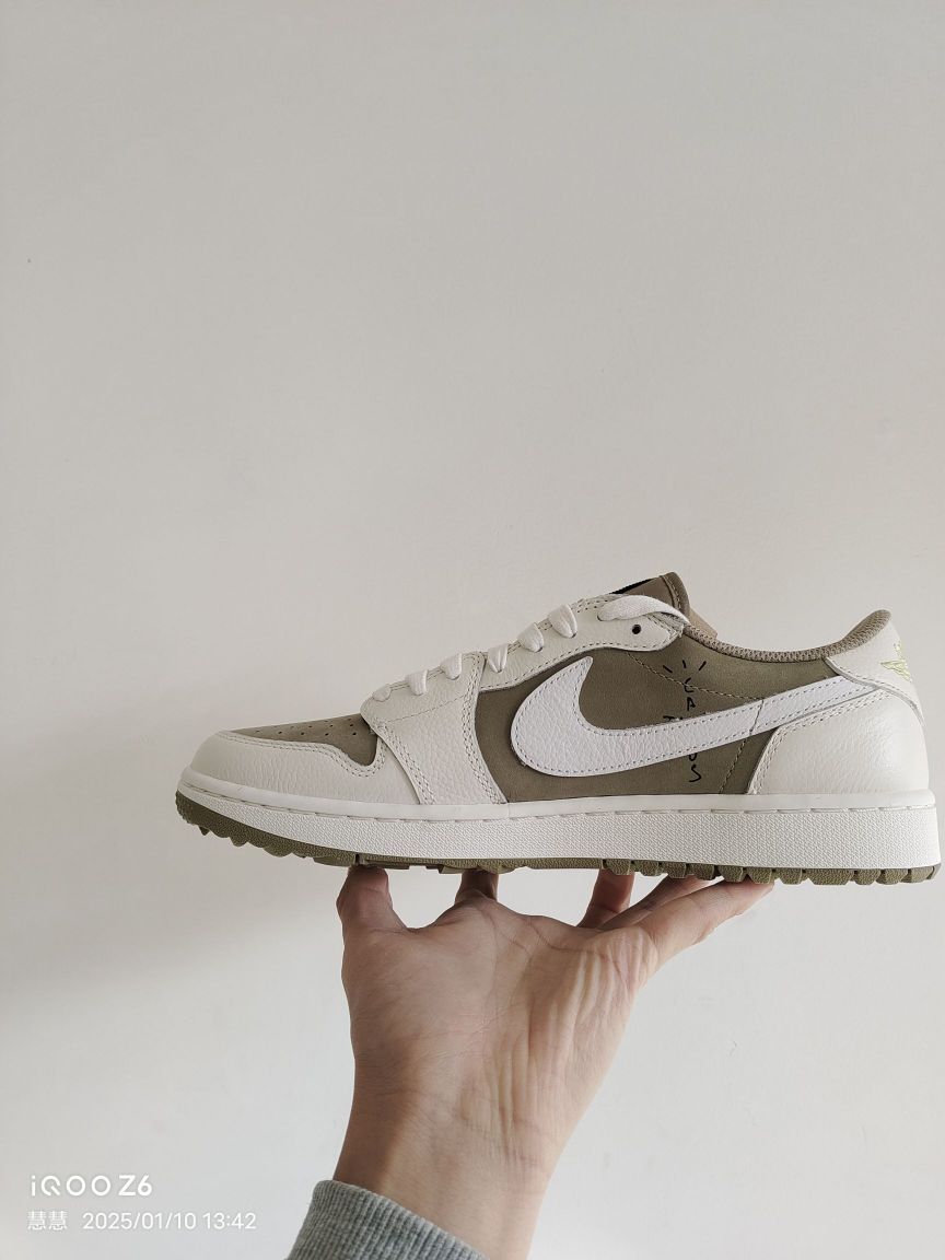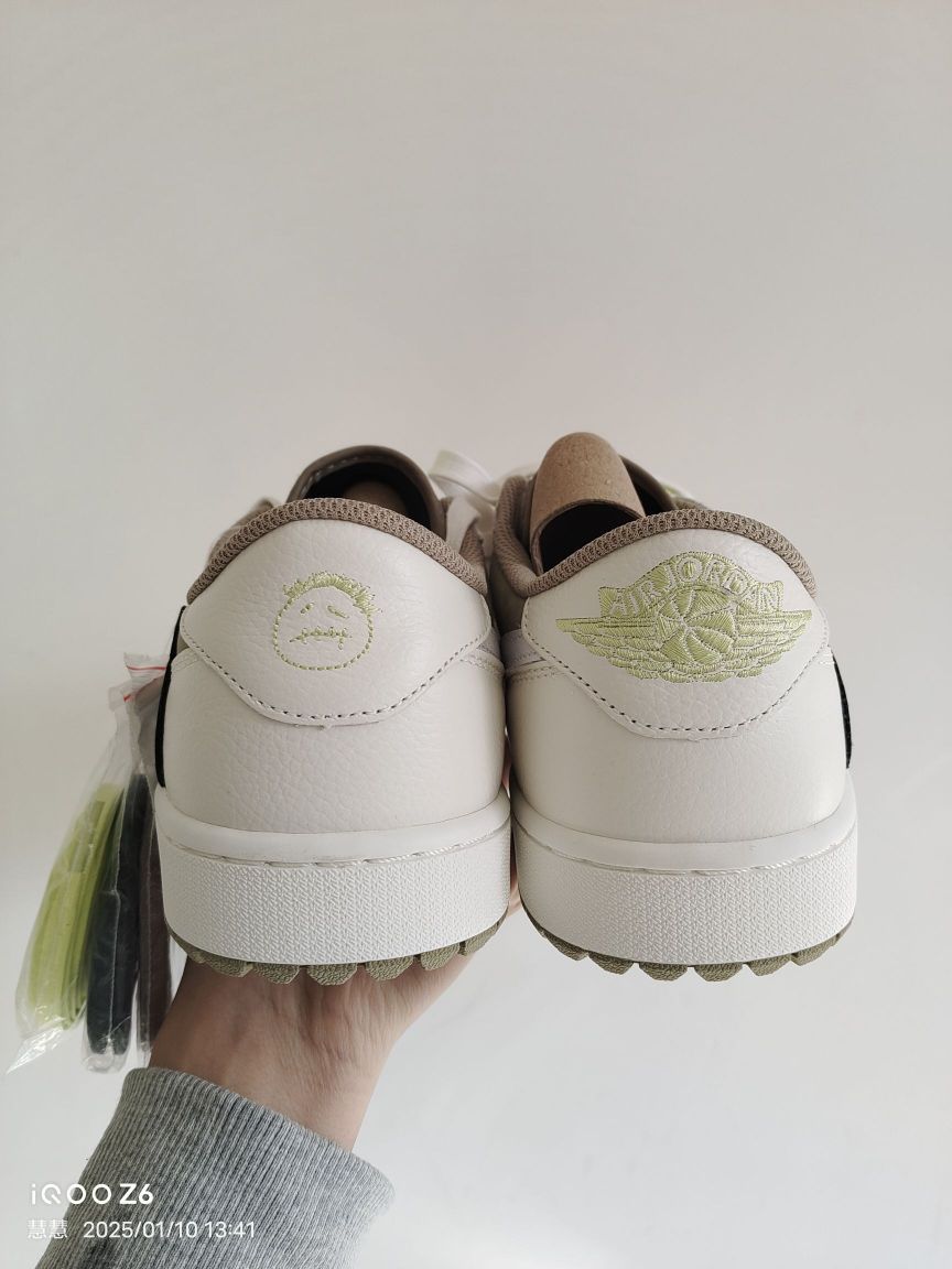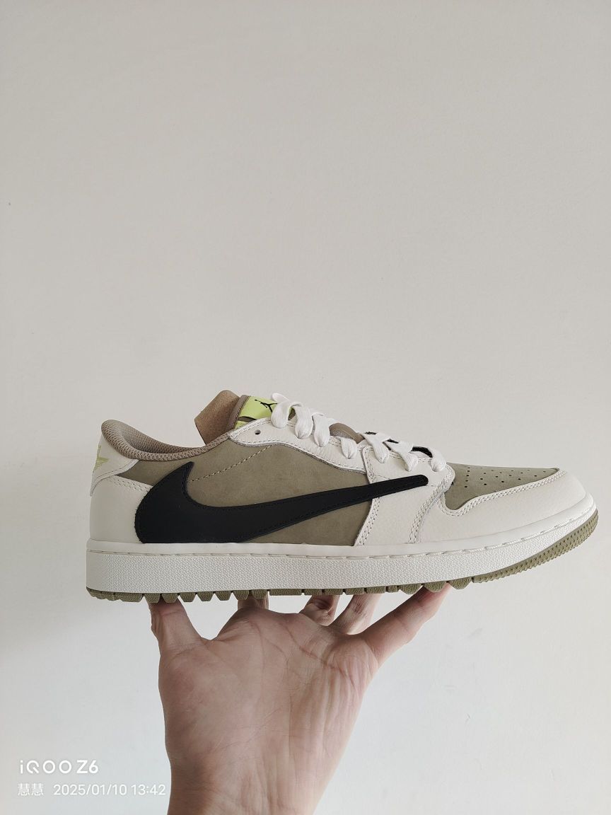 宝子们,今天必须要唠唠这双话题度拉满的Travis Scott x Air Jordan 1 Low Golf倒钩6.0高尔夫配色球鞋! 外观设计:细节之处见真章 倒钩6.0高尔夫配色整体设计既保留了倒钩系列的经典元素,又融入了高尔夫主题特色。鞋身以橄榄绿为主色调,搭配米白色框架,营造出清新又不失潮流感的视觉效果。标志性的黑色反向Swoosh logo醒目吸睛,与鞋身色彩形成强烈对比,辨识...