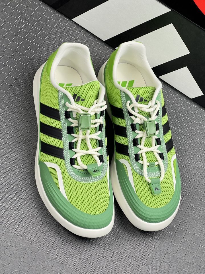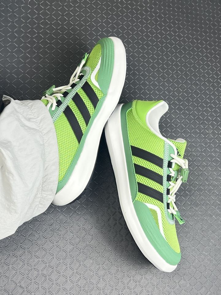这双鞋刚拿到手的时候,第一感觉就是挺轻的。鞋面是透气的网布材质,夏天穿脚不会觉得闷,摸起来也没有那种廉价的感觉,做工还算扎实。绿黑配色实物看起来比官方图更低调,深绿色鞋面配上黑色三条纹,日常穿挺耐看的,不会显得太突兀。 穿在脚上,鞋底软硬挺合适的,虽然没有那种特别软的“踩屎感”,但走久了脚也不会觉得累。防滑效果也不错,下雨天走在瓷砖地上也没打滑。不过,鞋型有点瘦长,要是脚比较宽的话,可能得选大半...