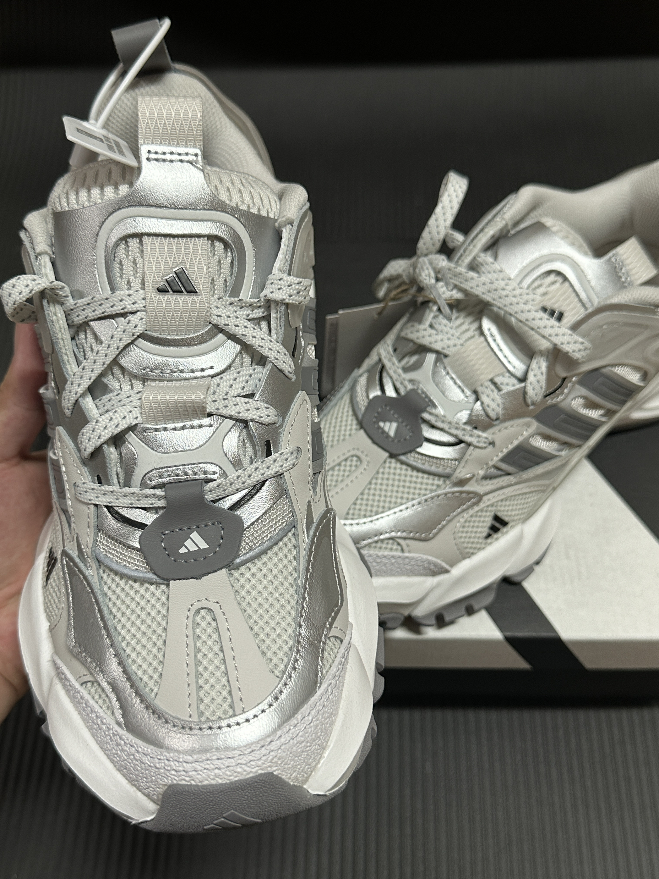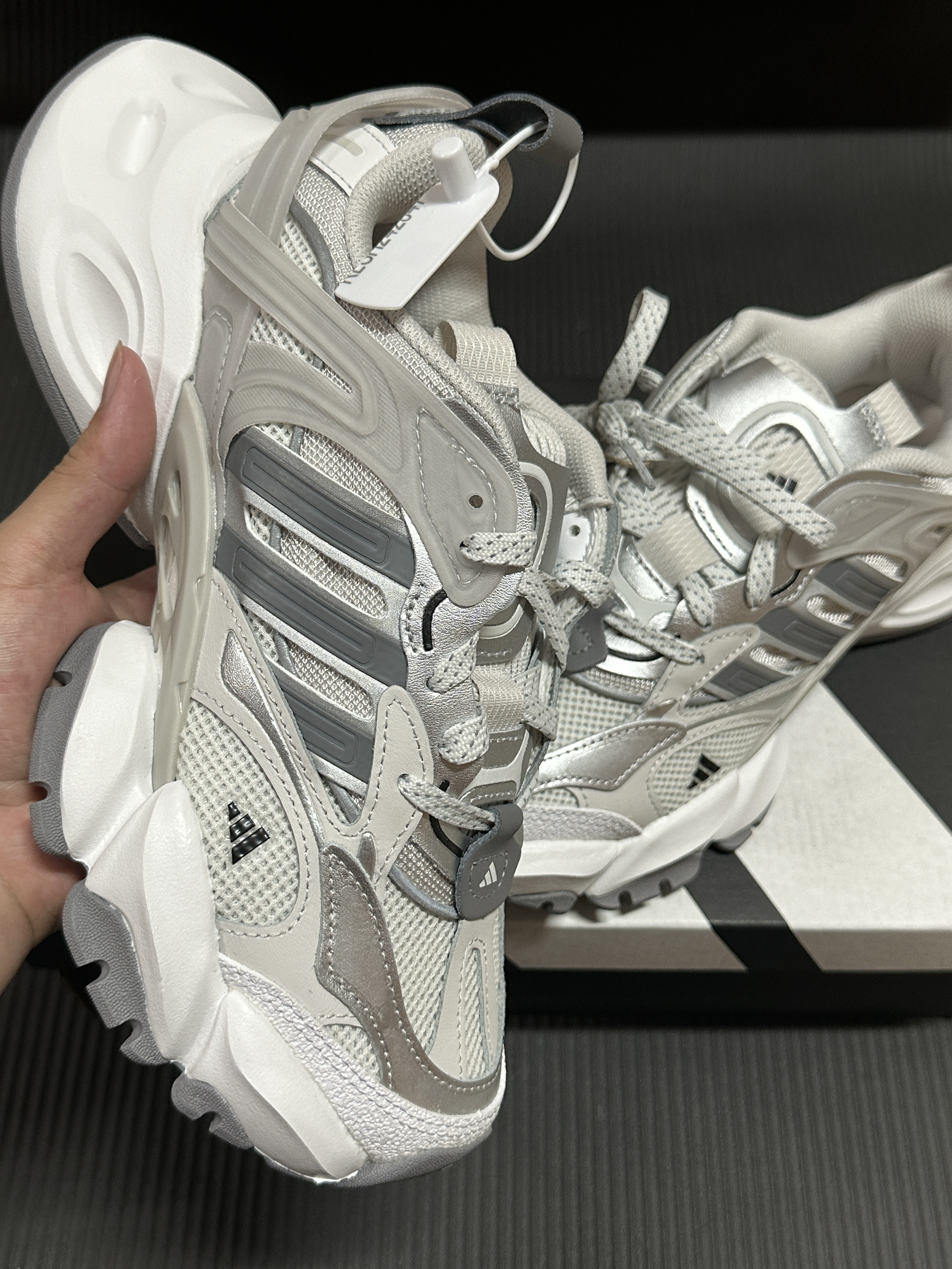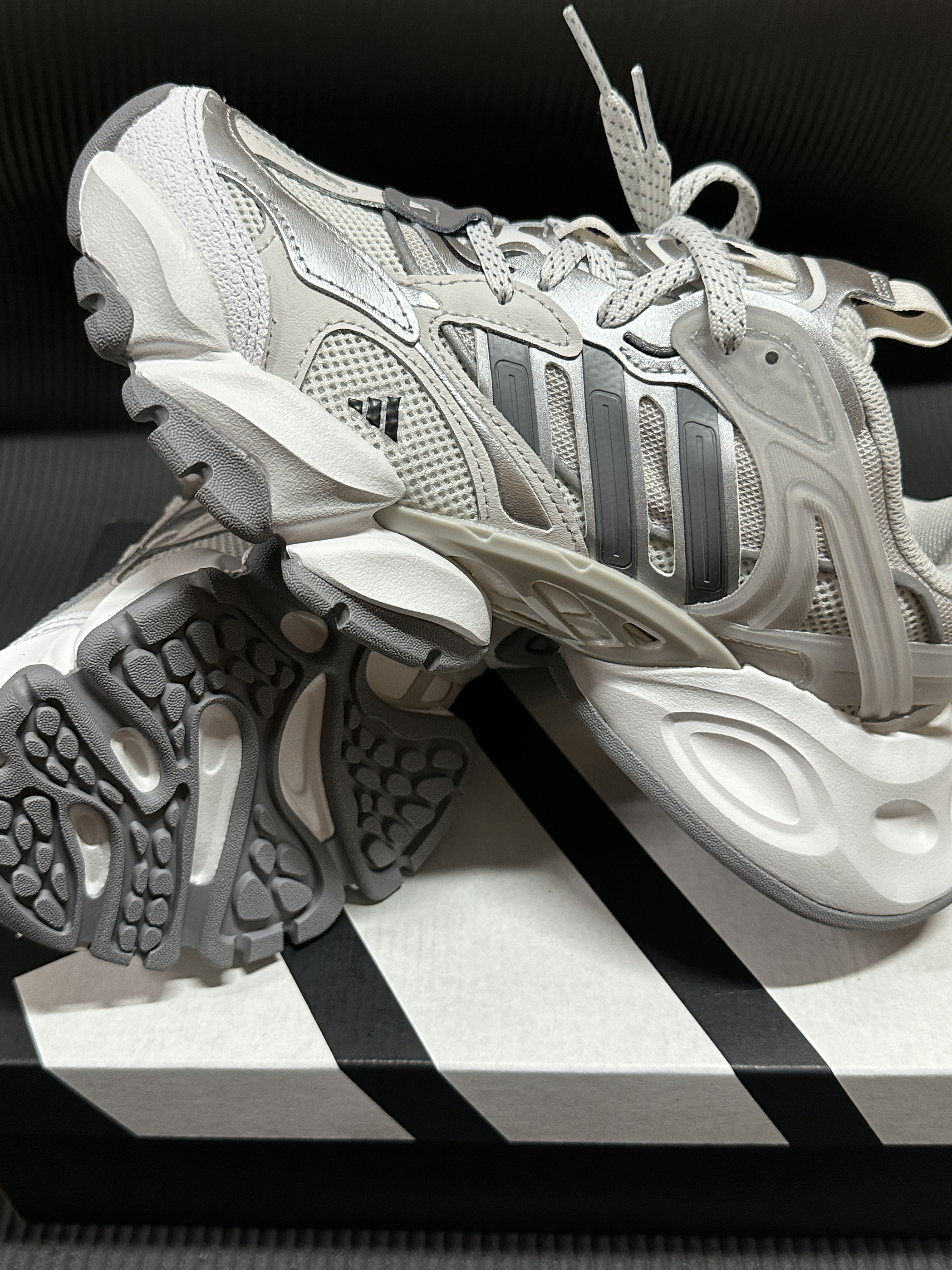 宝子们!我最近挖到一双超绝的老爹鞋,必须分享给你们!就是这双阿迪达斯的轻机甲鞋赛博,我真的一眼就爱上! 这鞋的颜值没话说,银灰色系高级又百搭,不管是运动风还是休闲风,它都能轻松适配。鞋面设计超有层次感,细节满满,上脚立马让你成为街头焦点! 而且它的舒适度也超赞!鞋底软弹,走路、跑步都很舒服,像我平时逛街暴走一天,脚都不会累。抓地力也很强,不用担心滑倒。 我最近出门基本都穿它,搭配运动裤活力满...