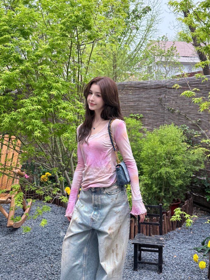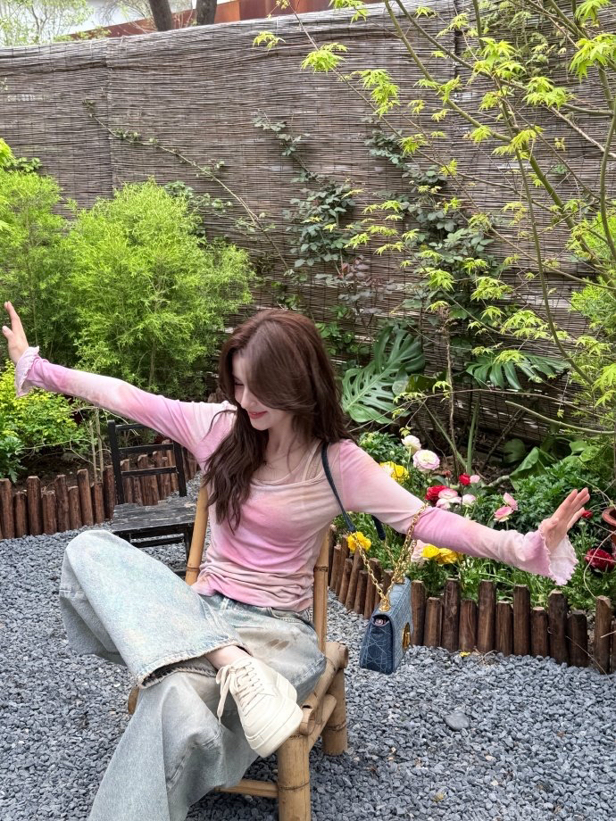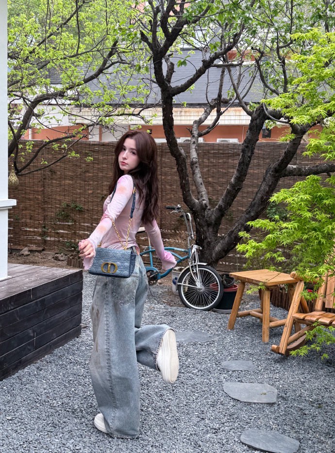 哈妮克孜的这身穿搭粉嫩的像朵🌸🌸 - 穿搭分享👀 上衣|ladiesfrst 植物花卉V领简约长袖T恤 裤子|Acne Studios 泥染废土做|日宽松牛仔裤 包包|DIOR迪奥 CARO系列刺绣单肩斜挎包 鞋履|HOGAN Skyscraper 皮革系带厚底板鞋