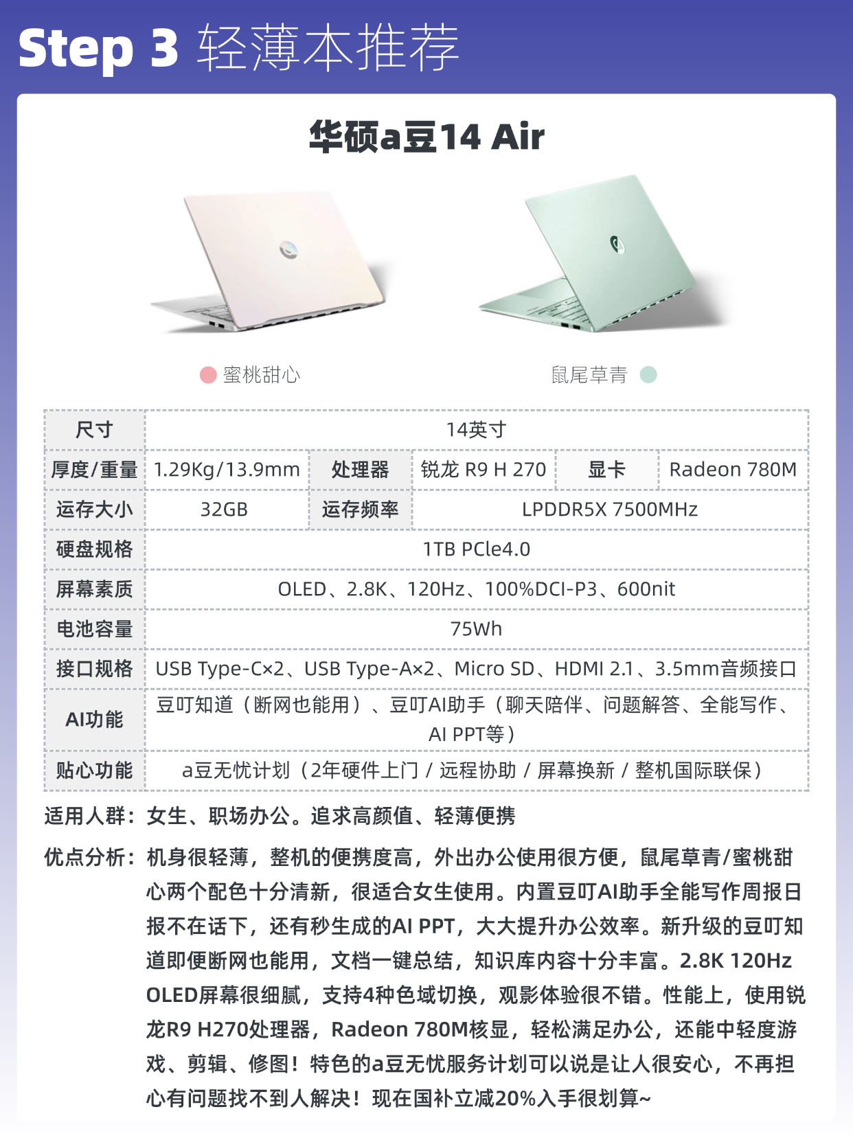 适合女生用的轻薄本该怎么选呢?既兼顾颜值又要实用,看完这一篇就懂啦❗️已经整理好选购攻略和机型推荐,赶紧码住~ - 👉🏻内容指南: ▫轻薄笔记本选购攻略(图2-图3) ▫轻薄笔记本推荐(图4-图7) - 💻轻薄笔记本推荐: 1⃣华硕a豆14 Air 机身很轻薄,整机的便携度高,外出办公使用很方便,鼠尾草青/蜜桃甜心两个配色十分清新,很适合女生使用⌨内置豆叮AI助手全能写作周报日报不在话下,还有秒生...
