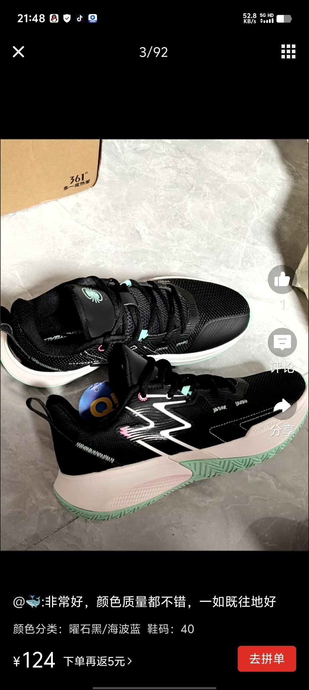 361蓝球鞋👟!这双鞋真的太酷啦!整体设计超有科技感,黑色鞋面经典又百搭,搭配上亮眼的白色线条和清新的绿粉配色点缀,既时尚又不失活力 。独特的图案设计让它在一众鞋子里脱颖而出,走在路上回头率肯定超高。而且从细节能看出做工很精细,材质看着也扎实,既适合运动时提供支撑,日常出街搭配衣服也完全没问题,简直是颜值与实用性并存的宝藏鞋子!👟球鞋名称: 📌是否偏码【偏大/不偏码/偏小】: ⛹️性能打分(每...