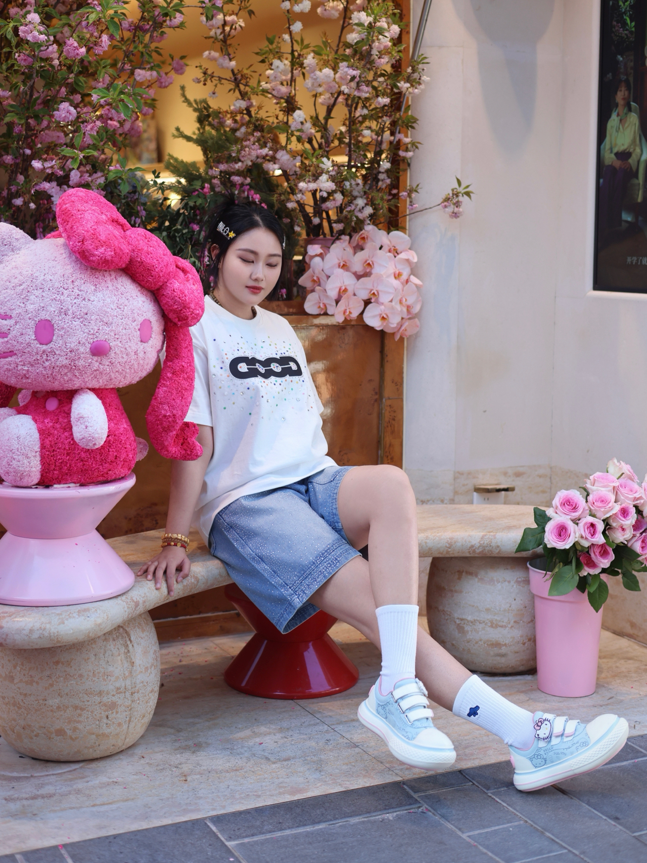 hello小宝们,夏日的清爽甜酷穿搭来啦! —— 💎【上衣:GOODBRAND夏日缤纷糖果宝石钻白T】 ·阳光一照整个人都在blingbling发光✨ 高颜值彩钻设计也很有辨识度!明星同款确实不一样! 👖【下装:美式钻钻牛仔裤】 ·谁说辣妹不能又甜又酷?特意选了复古蓝牛仔,钻钻设计和上衣呼应得恰到好处! 👟【战靴:Hellokitty × OldOrder大头鞋】·OldOrder经典大头鞋遇上三...