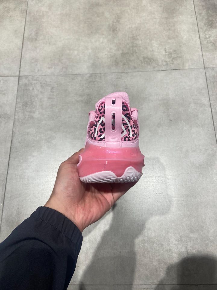 - 鞋身采用「豹纹渐变」热熔膜+荧光粉中底,静态如萌系玩偶,动态似猎豹出击