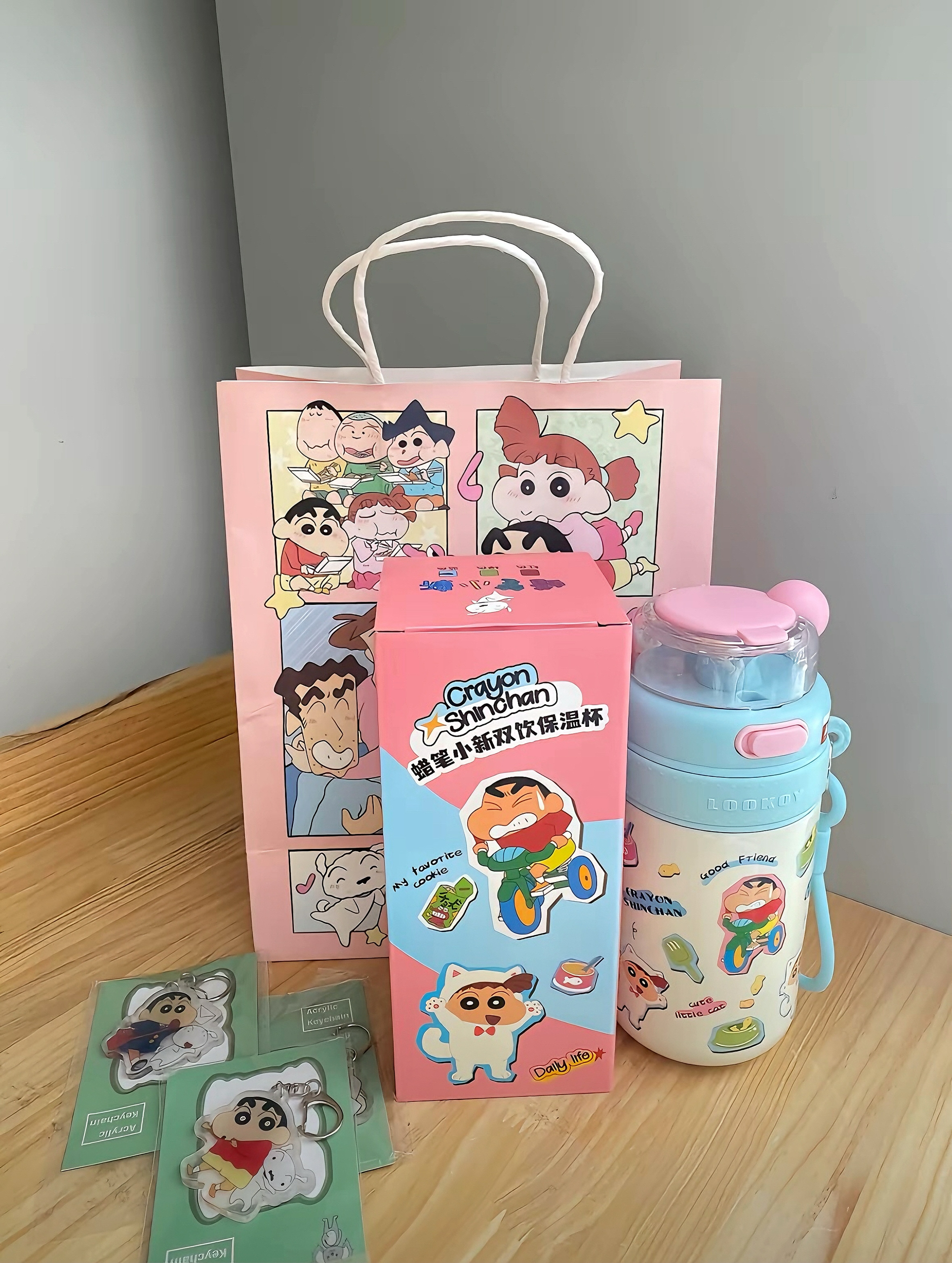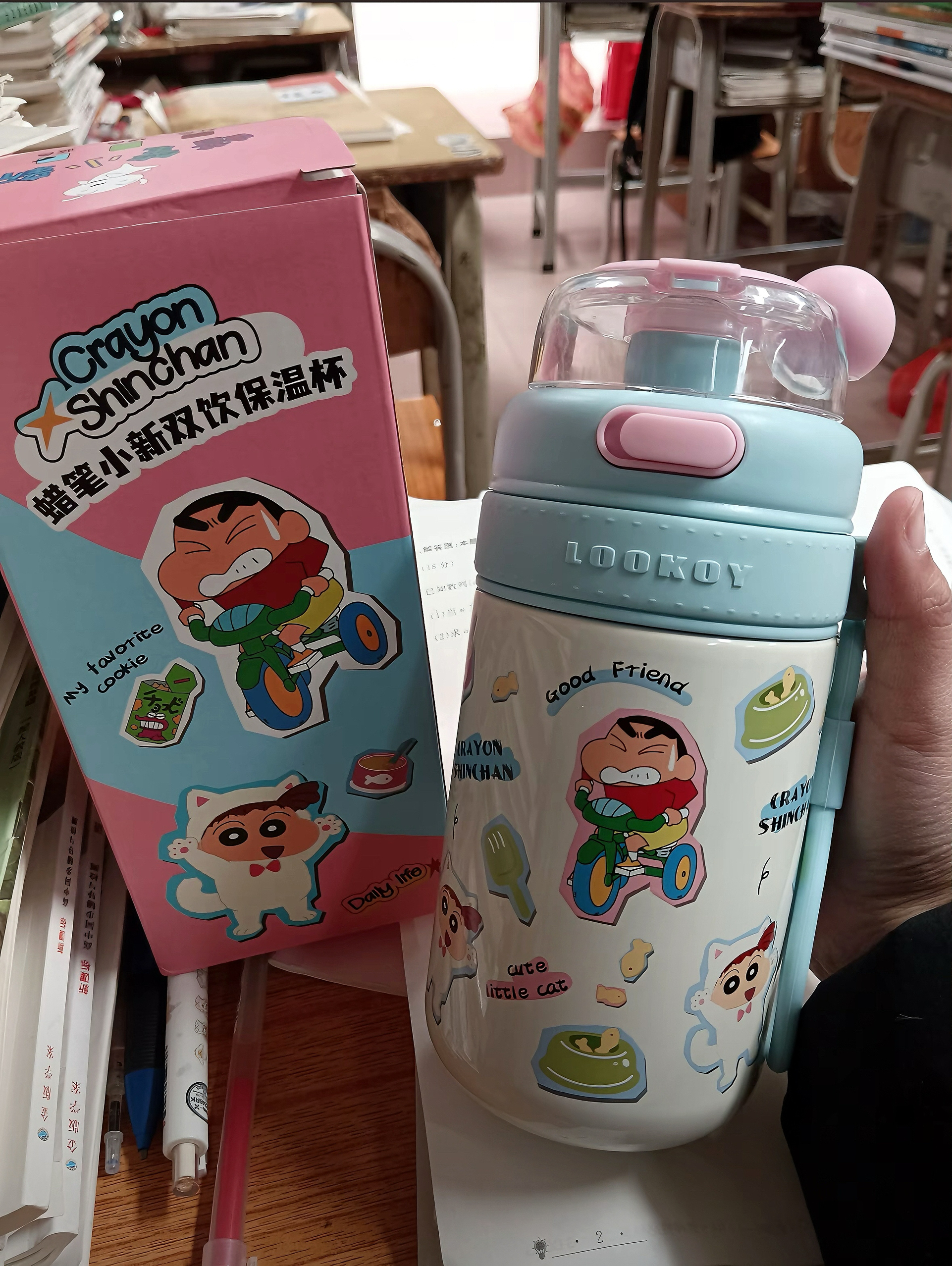 我入手了这个蜡笔小新联名水杯,用了一段时间,感觉还挺不错的。它的外观超可爱,印着好多蜡笔小新和可爱小动物的图案,每次拿在手里都能想起蜡笔小新那些有趣的剧情,心情都会变好。 双饮口的设计很实用,直饮口喝水方便,吸管口在我忙起来或者运动的时候,能避免洒出来。保温效果也可以,早上接的热水,到下午还温温的。杯盖密封性挺好,放在包里不用担心漏水。而且材质安全,用着放心。 就是杯身稍微有点沉,装满水拿着久了...