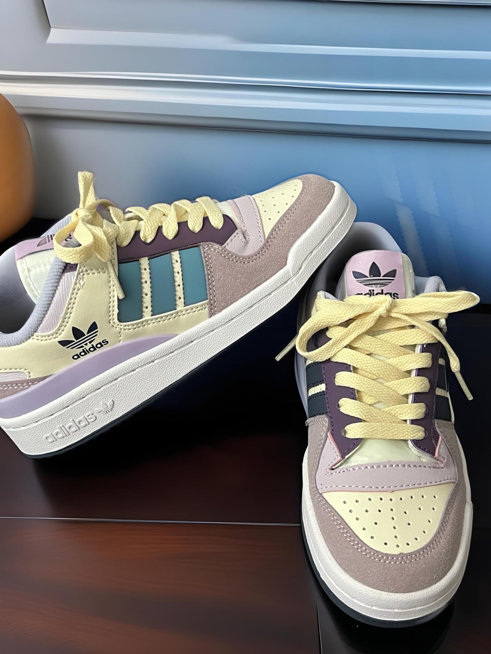 宝子们,分享一下我最近的心头好👟 阿迪达斯三叶草板鞋! 这配色简直长在我的审美点上!淡紫色、米黄色还有浅粉的拼接,清新又温柔,满满春日氛围感🌷 谁穿谁是甜妹~