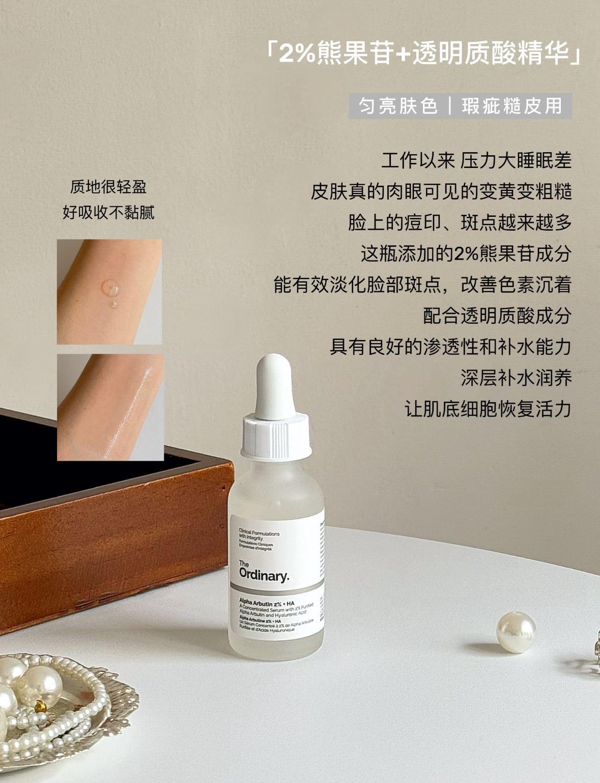 本篇笔记关联了The ordinary 2%α熊果苷+透明质酸精华液 强韧屏障淡化痘印斑点补水提亮面部 旧版、The Ordinary 30%果酸+2%水杨酸精华面膜 去闭口粉刺去角质改善痘印祛痘 30ml、The ordinary 2%透明质酸+维他命B5补水嫩肤面部精华液 修护肌肤强韧屏障 补水保湿等商品,为用户提供真实的使用体验和购买参考。
