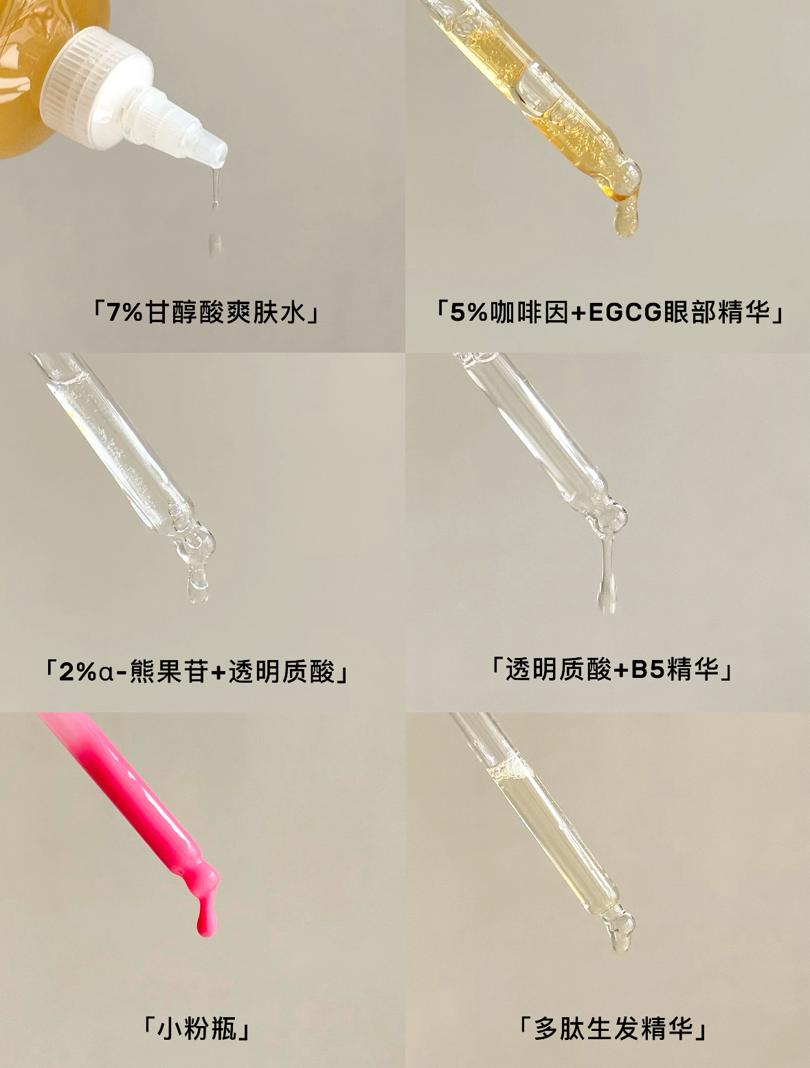 从大学就开始用的牌子 被喊作原料桶真的是有两把刷子 解决皮肤问题手拿把掐速度hin快!嗷嗷到位! 今天就来整理一下手头上的TO们~家人们对号入座,冲就对了! •25%咖啡因 +EGCG眼部精华 消肿提亮| 调黑眼圈用 •7%甘醇酸爽肤水 平衡水油 | 油皮清洁用 •小粉瓶 修复屏障|干敏脆弱用 •0透明质酸+B5精华补水保湿|干皮维稳用 •92%熊果苷+透明质酸精华 匀亮肤色|瑕疵糙皮用 ••多肽...