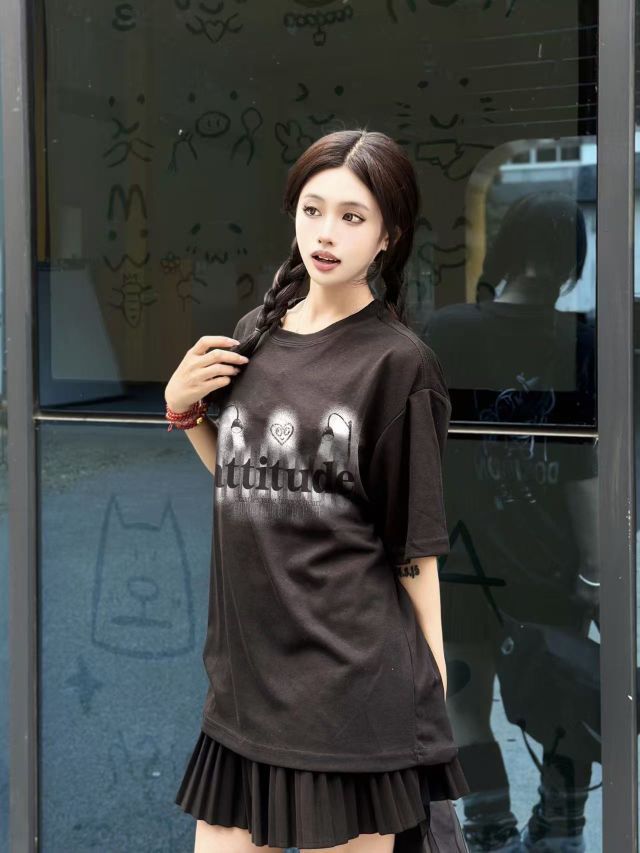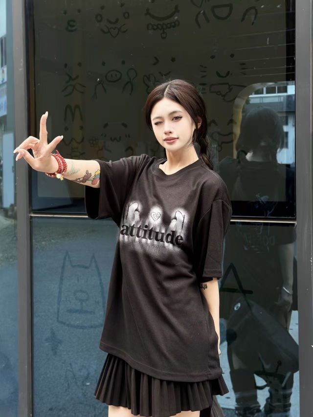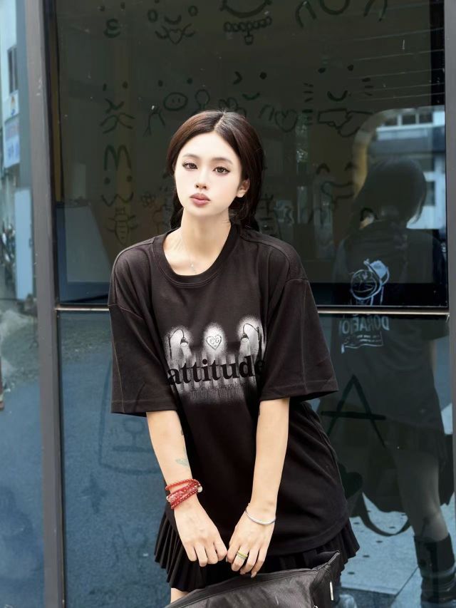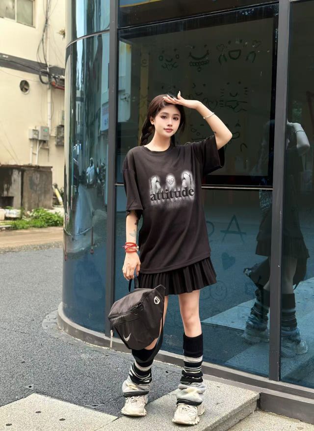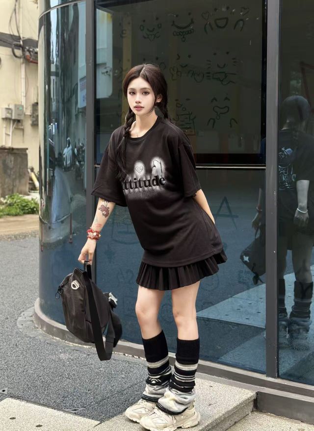 这款版型超好的黑色T恤,上身酷拽风拉满!下半身搭配黑色短裙➕黑白长袜,以前从未尝试过这种风格,今日一穿自己都惊到了😲再加上衣服满天星的印花图案,拽中怎么还有一丝甜美呢~